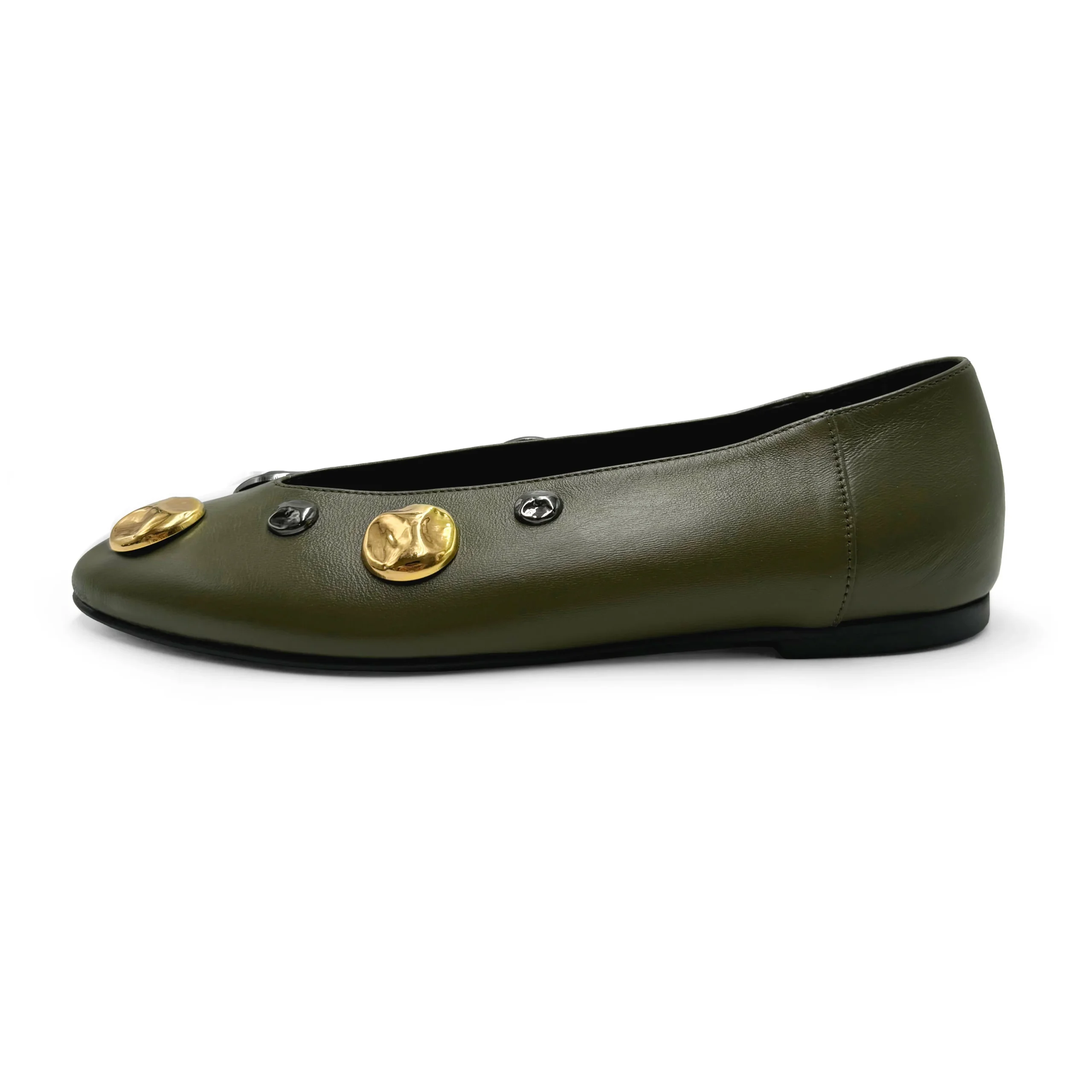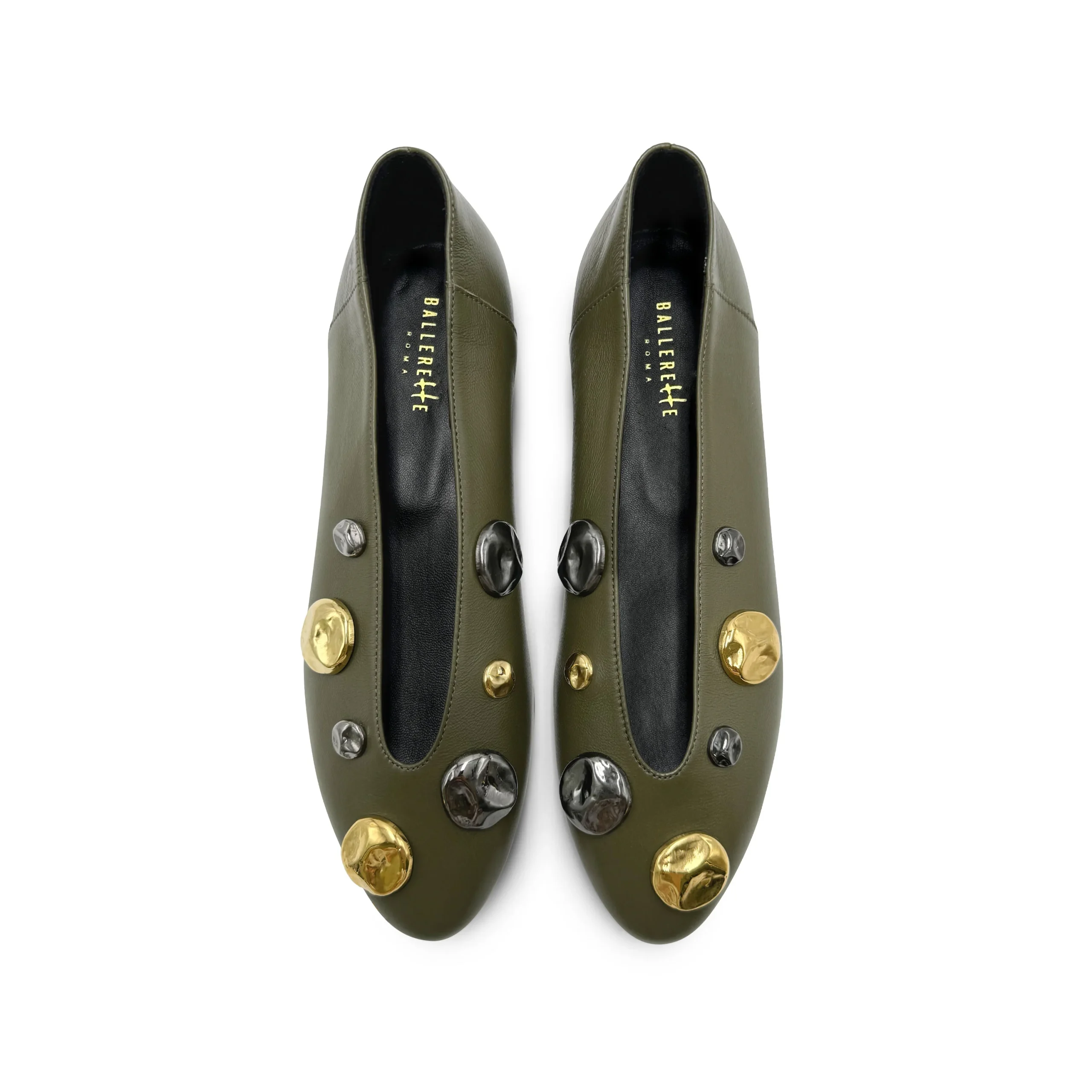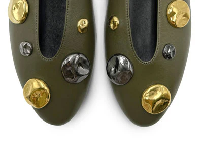 Le Torlonia sono scarpe basse accollate con una linea moderna e minimal. Queste particolari ballerine hanno la punta a mandorla e sono realizzate in morbida pelle di colore verde oliva. La fodera interna è in pelle nera così come il sottopiede, la suola ha tacco basso di 0,5 cm. Questa versione è adornata da mezze perle gioiello martellate di colore ferro e oro in diverse grandezze che creano un elegante contrasto. Comode ed eleganti provale con una gonna a sigaretta cipria e dolcevita bosco o con un mini abito grigio perla.