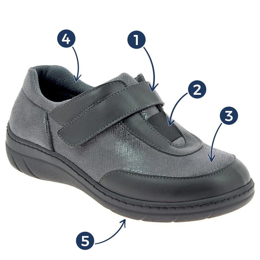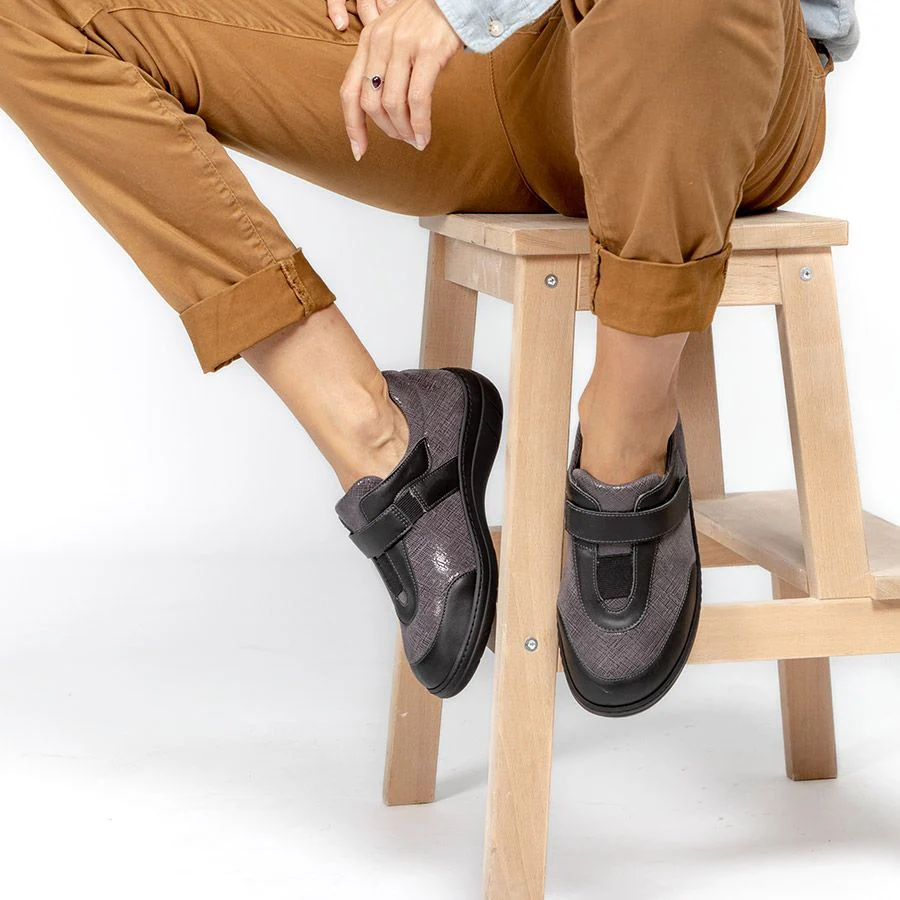 Le dessus en tissu extensible de la Valérie Grise épouse parfaitement la forme de votre pied, minimisant les points de pression. Cette caractéristique assure un confort exceptionnel, particulièrement pour ceux souffrant de pathologies comme les orteils en griffe ou les œdèmes. Vos pieds se sentiront libres et bien soutenus.