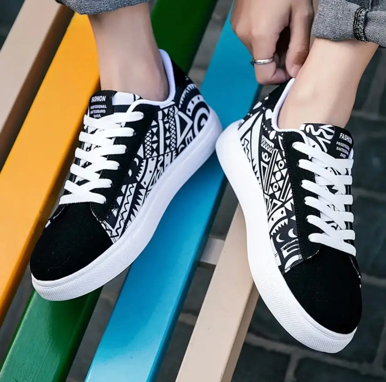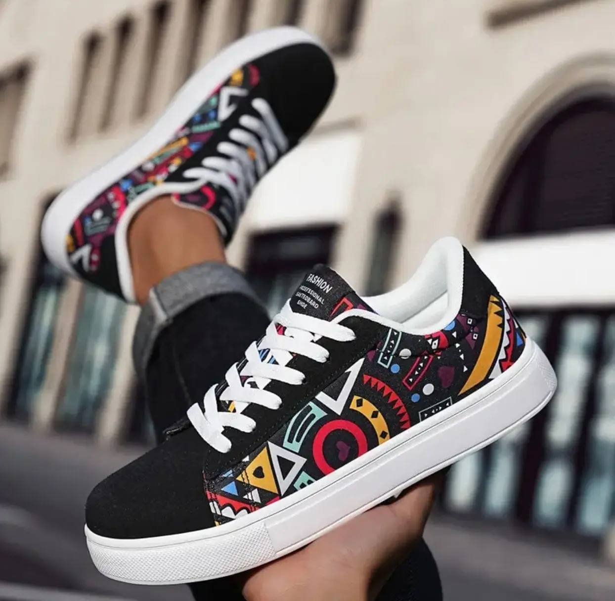 Avec leurs panneaux latéraux imprimés aux motifs géométriques multicolores et leur base noire contrastée, ces chaussures waxées femme offrent une silhouette dynamique et facilement reconnaissable. Confortables et stables, elles sont parfaites pour une utilisation quotidienne.