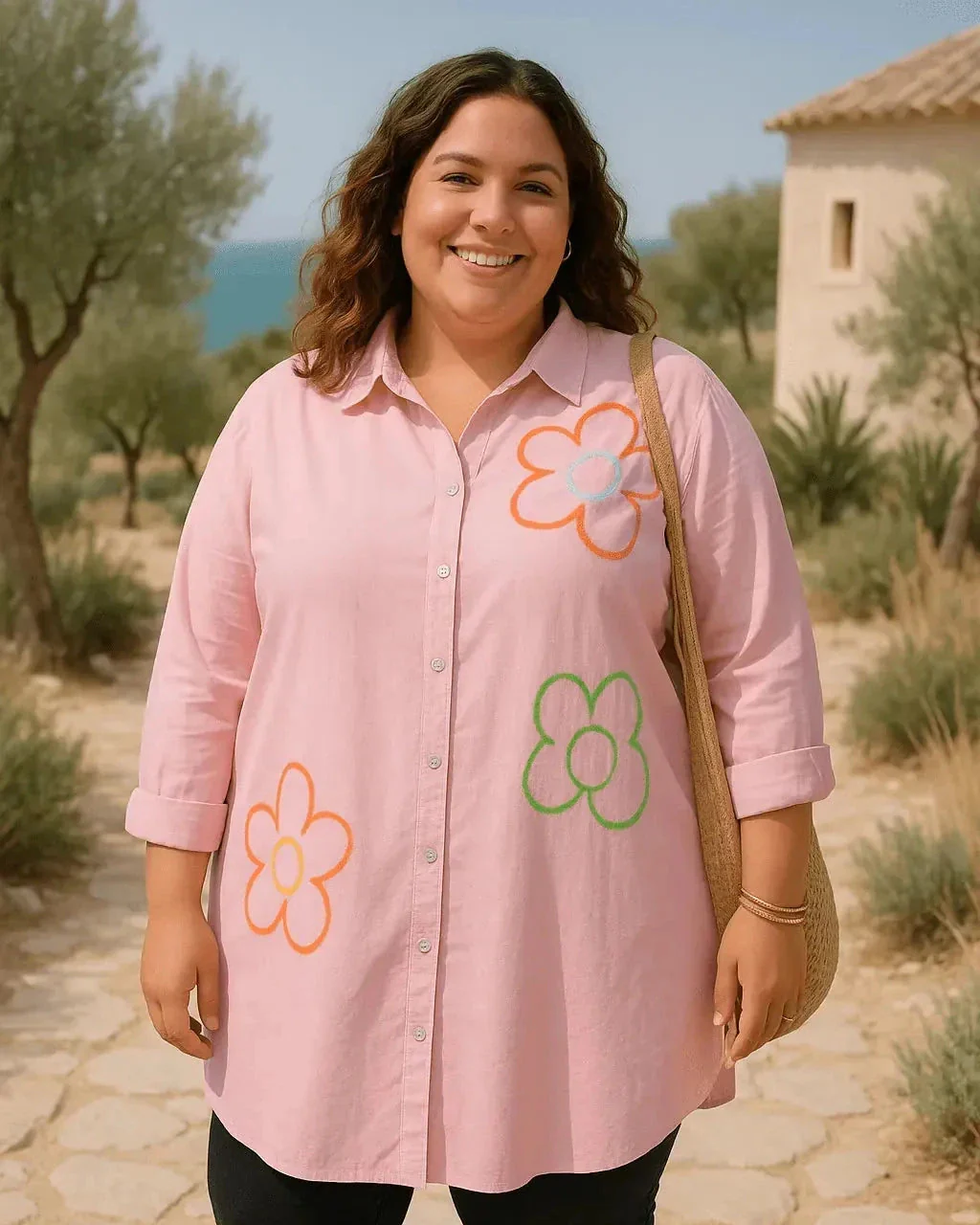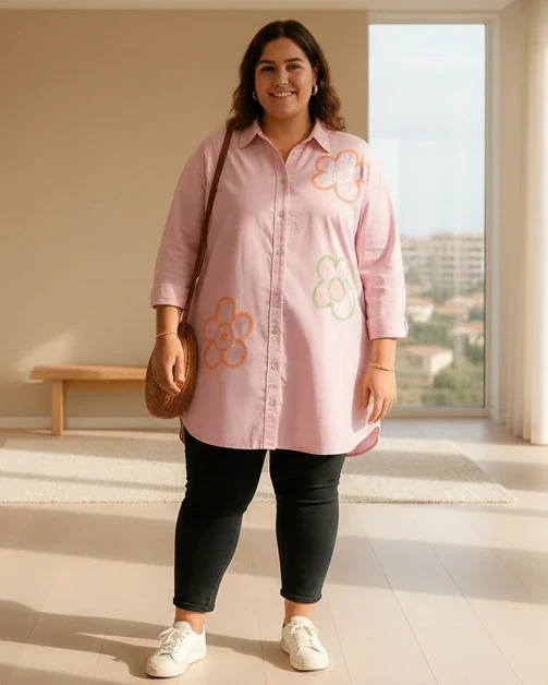 Cette chemise longue rose séduit par sa coupe fluide, son coton extensible ultra confortable (97% coton !) et ses fleurs brodées délicates qui apportent une touche raffinée sans en faire trop. Pensée pour s’adapter à toutes les morphologies du 36 au 48/50, elle se porte aussi bien au bureau, en sortie, ou en mode casual chic au quotidien.