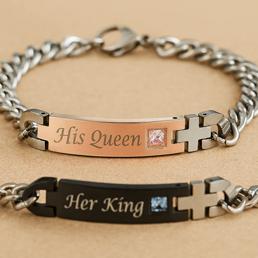 Exprimez votre lien unique avec ces bracelets assortis gravés “Her King” et “His Queen”. Conçus pour les couples qui aiment afficher leur complicité avec élégance, ces bijoux robustes en acier inoxydable résistent au temps comme votre amour. Chaque bracelet est orné d’un cristal étincelant et d’une gravure raffinée, pour un duo aussi esthétique que symbolique.