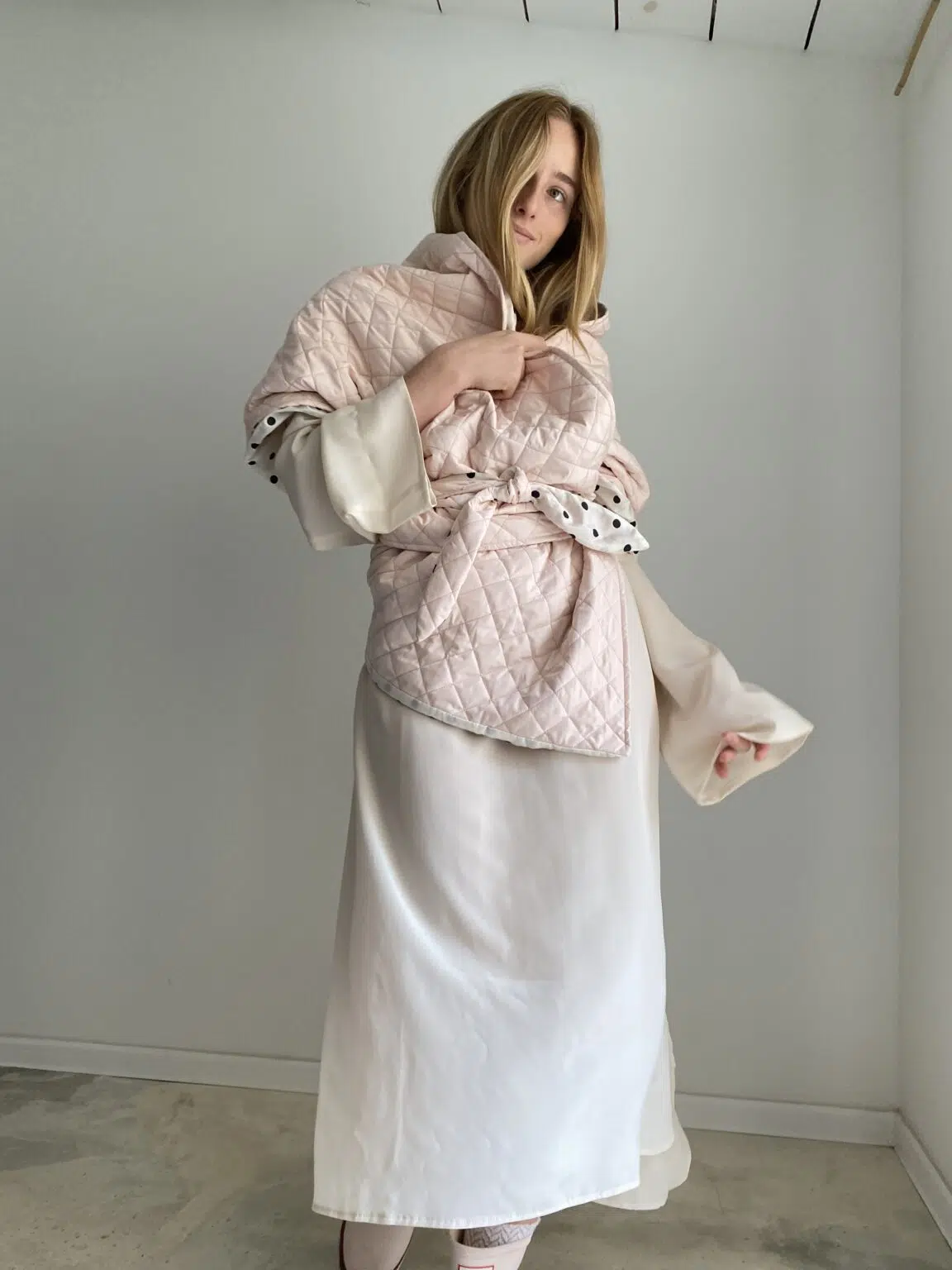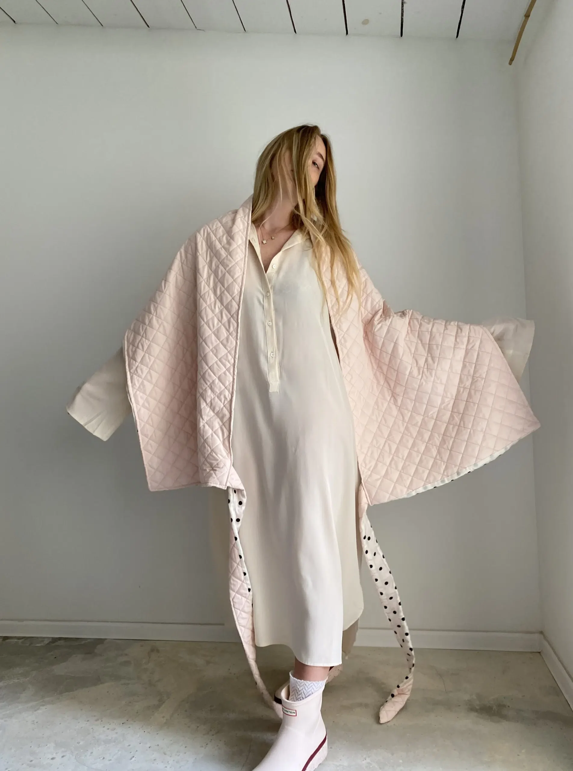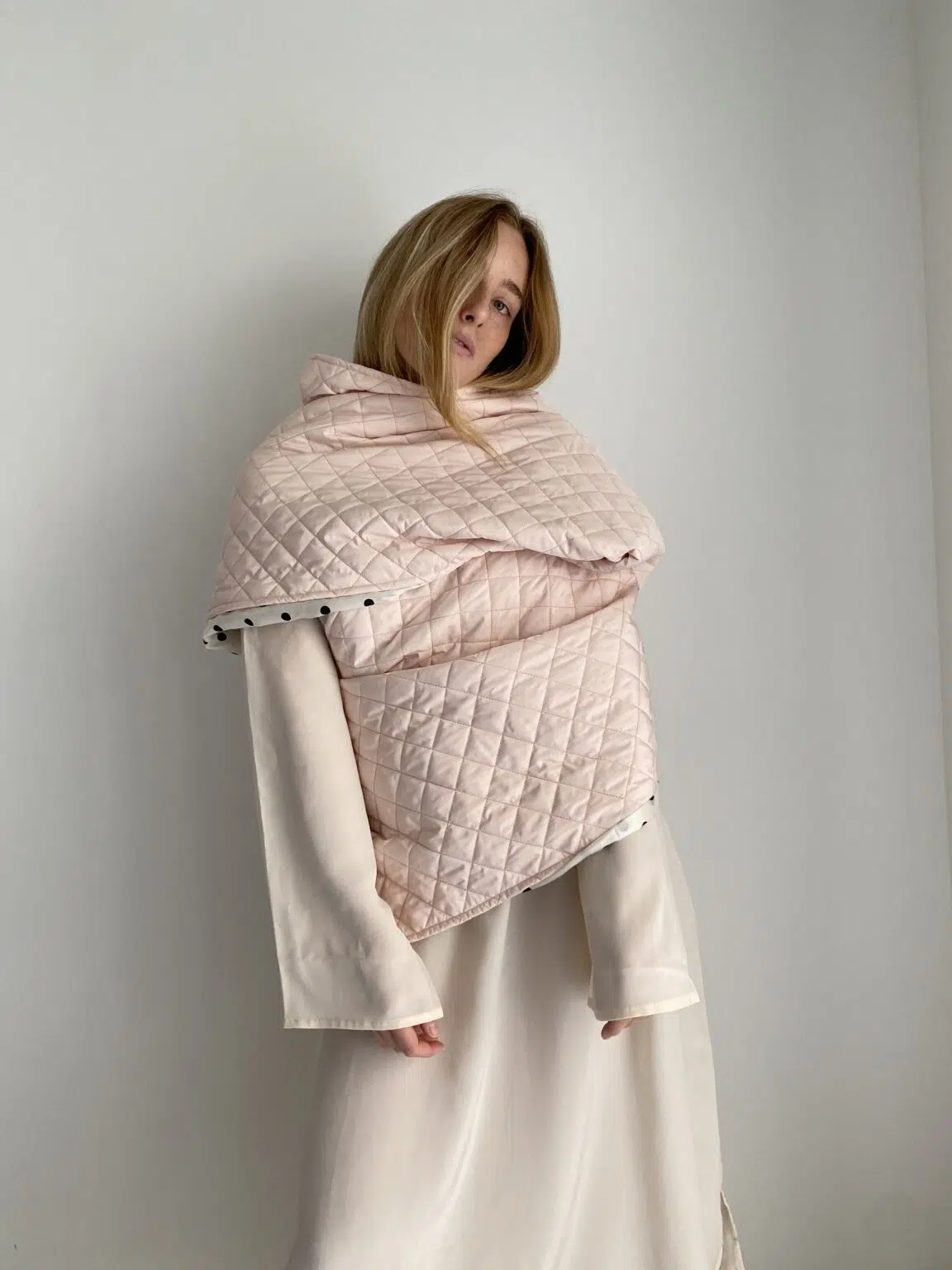 Echarpe / Cache épaules, matelassé rose poudré, doublure en coton off-white à pois, léger & chaud et surtout UNIQUE et STYLÉ ! LA pièce tendance !