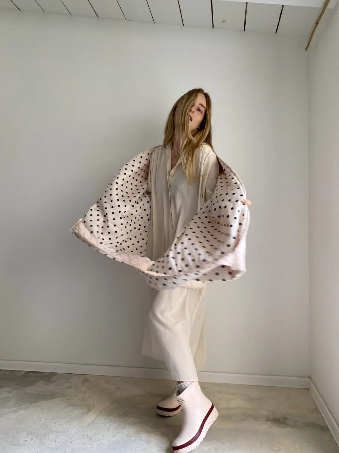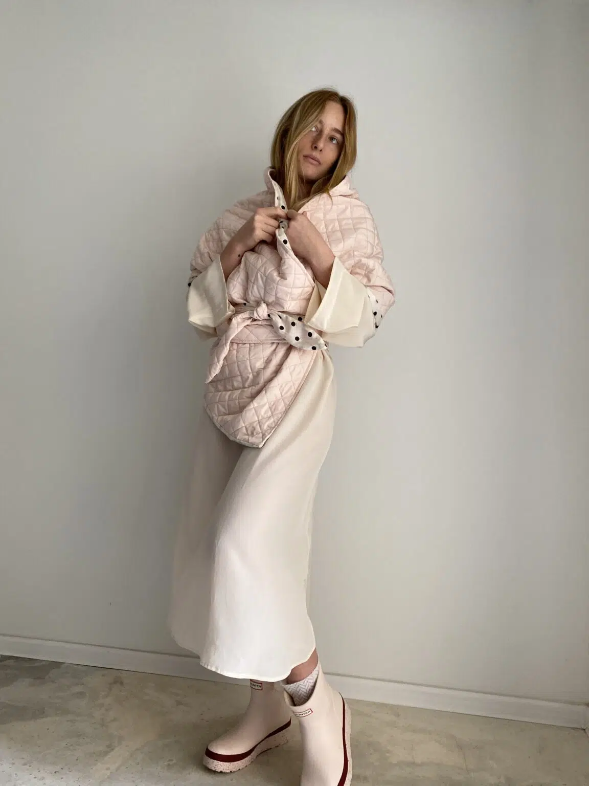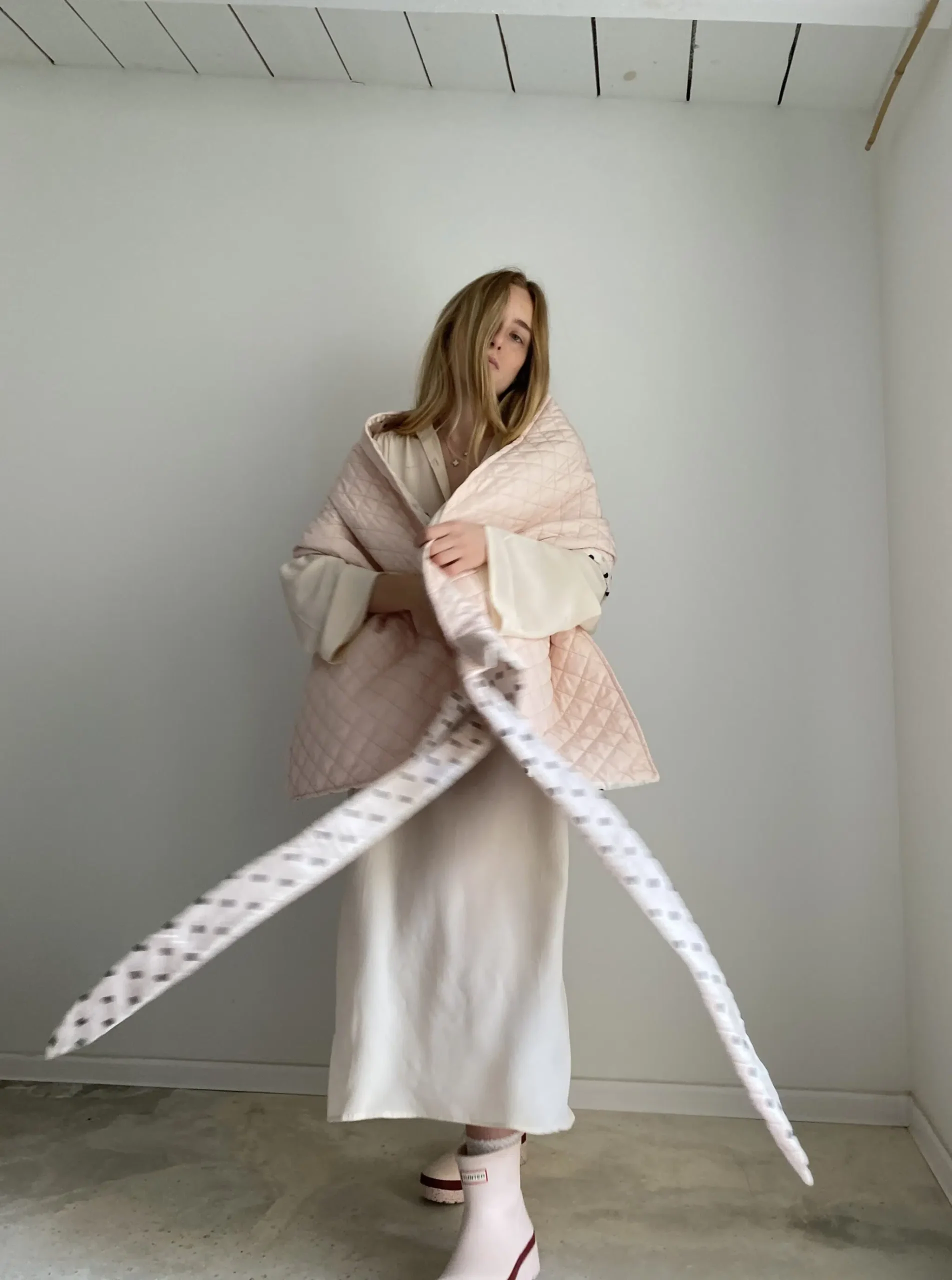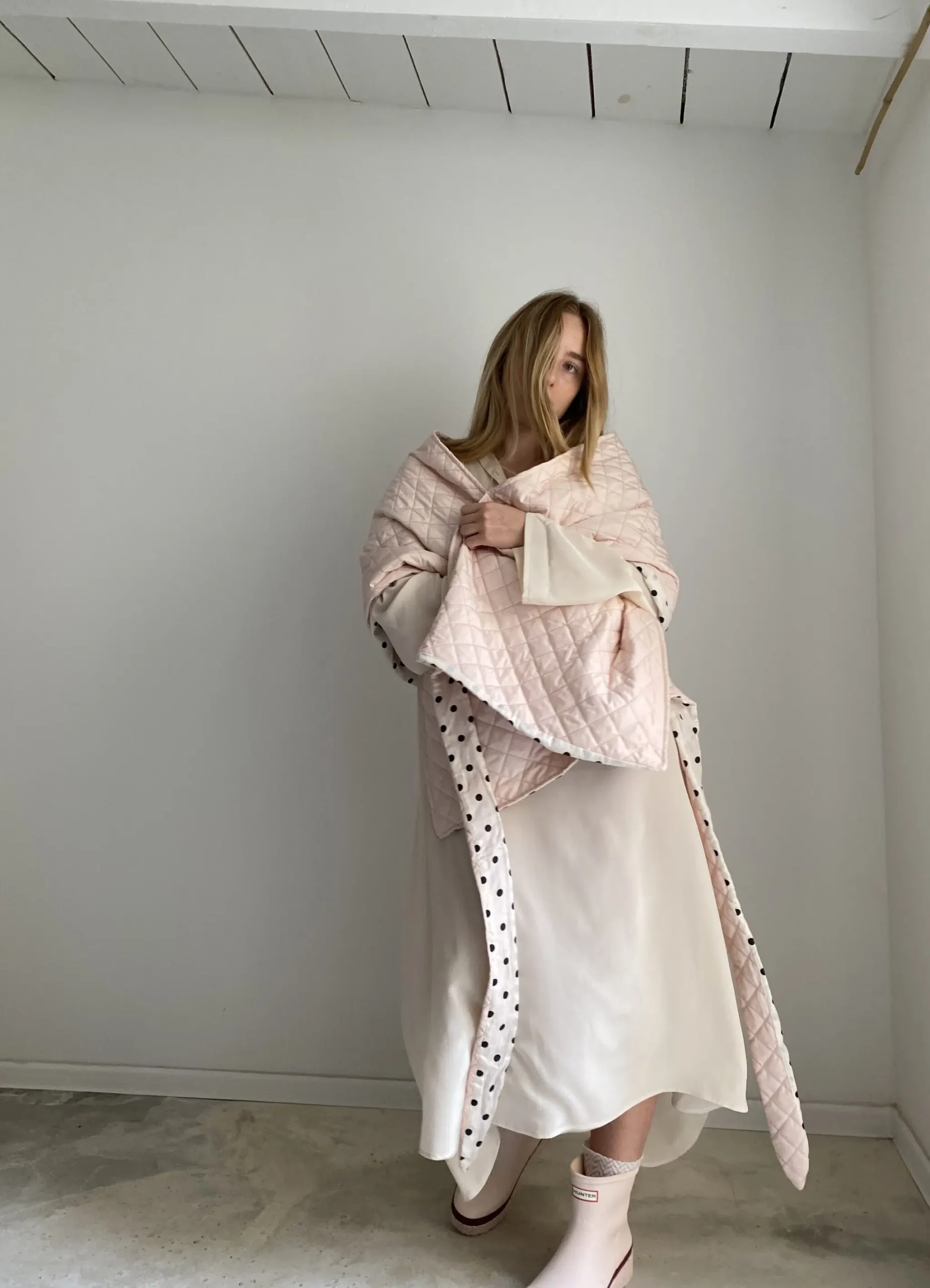 Echarpe / Cache épaules, matelassé rose poudré, doublure en coton off-white à pois, léger & chaud et surtout UNIQUE et STYLÉ ! LA pièce tendance !