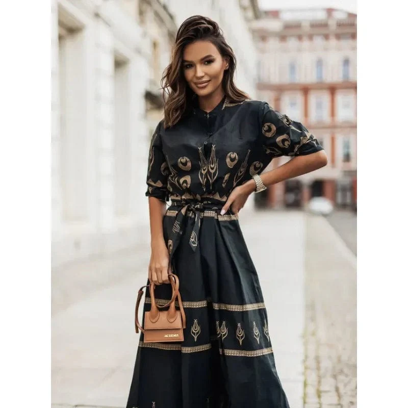 Exprimez une élégance inspirée du voyage avec cet ensemble deux pièces qui combine modernité et raffinement ethnique. Composé d’un chemisier à la coupe impeccable et d’une jupe longue et fluide, cet ensemble crée l’illusion parfaite d’une robe tout en offrant une polyvalence inégalée. Les motifs graphiques d’inspiration ethnique, délicatement posés sur les manches et le bas de la jupe, apportent un caractère unique. La ceinture assortie vient souligner la taille pour structurer la silhouette avec féminité. Une création MAX FOR ME pour une allure affirmée, que les pièces soient portées ensemble ou séparément.