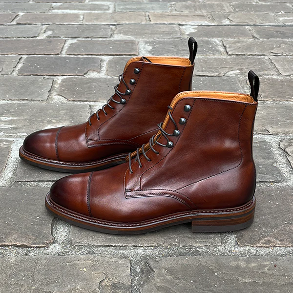 Les bottines Johnston incarnent le savoir-faire authentique de la maison Monserant. Leur cuir lisse patiné à la main offre des nuances profondes, tandis que la silhouette affirmée de cette bottine à bout droit illustre une modernité intemporelle, pensée pour s’associer facilement à tous les éléments du vestiaire masculin, du denim brut au pantalon en flanelle.