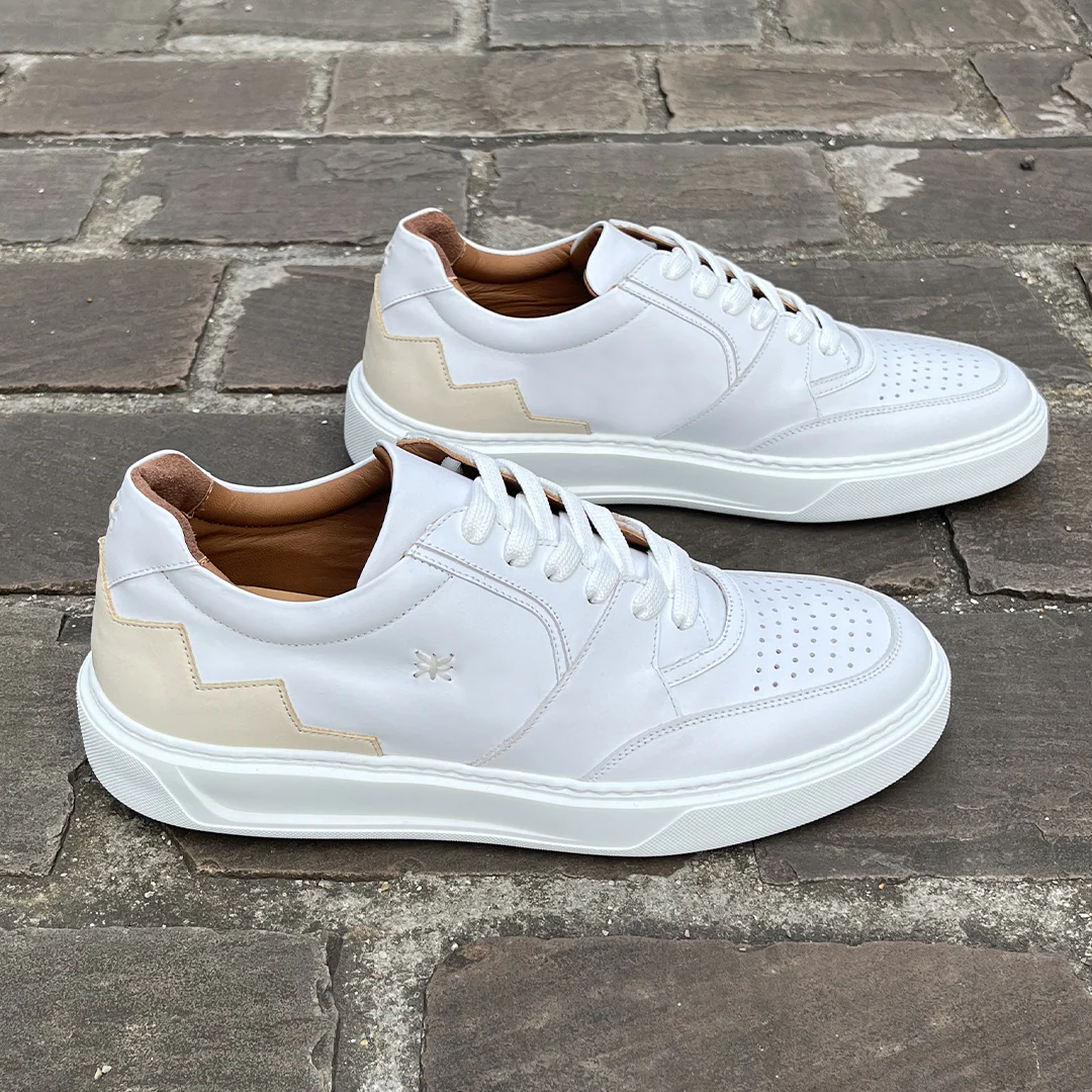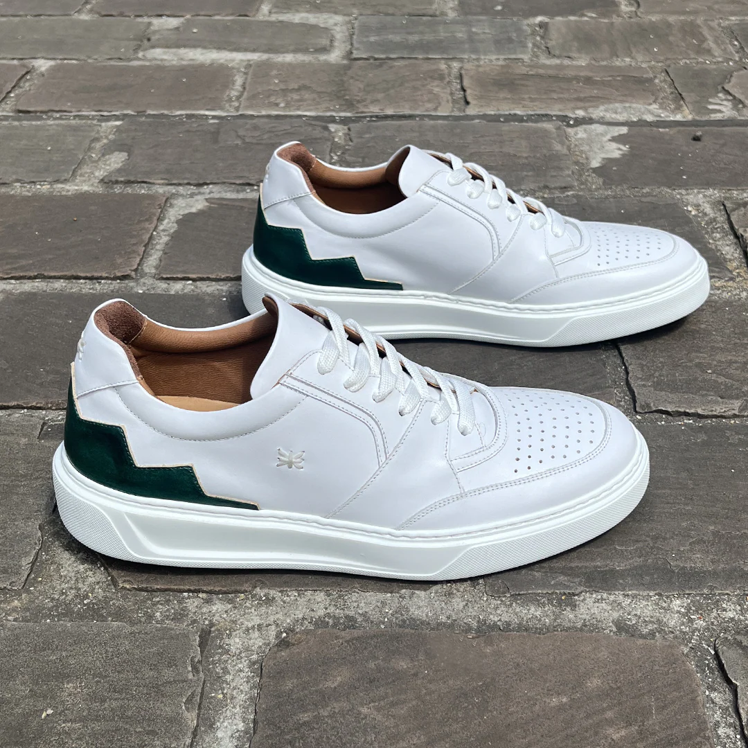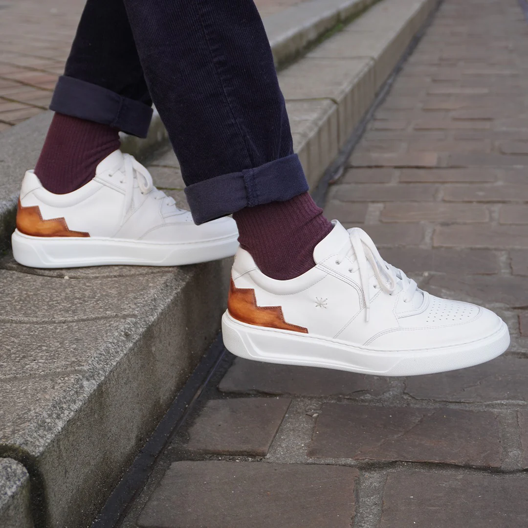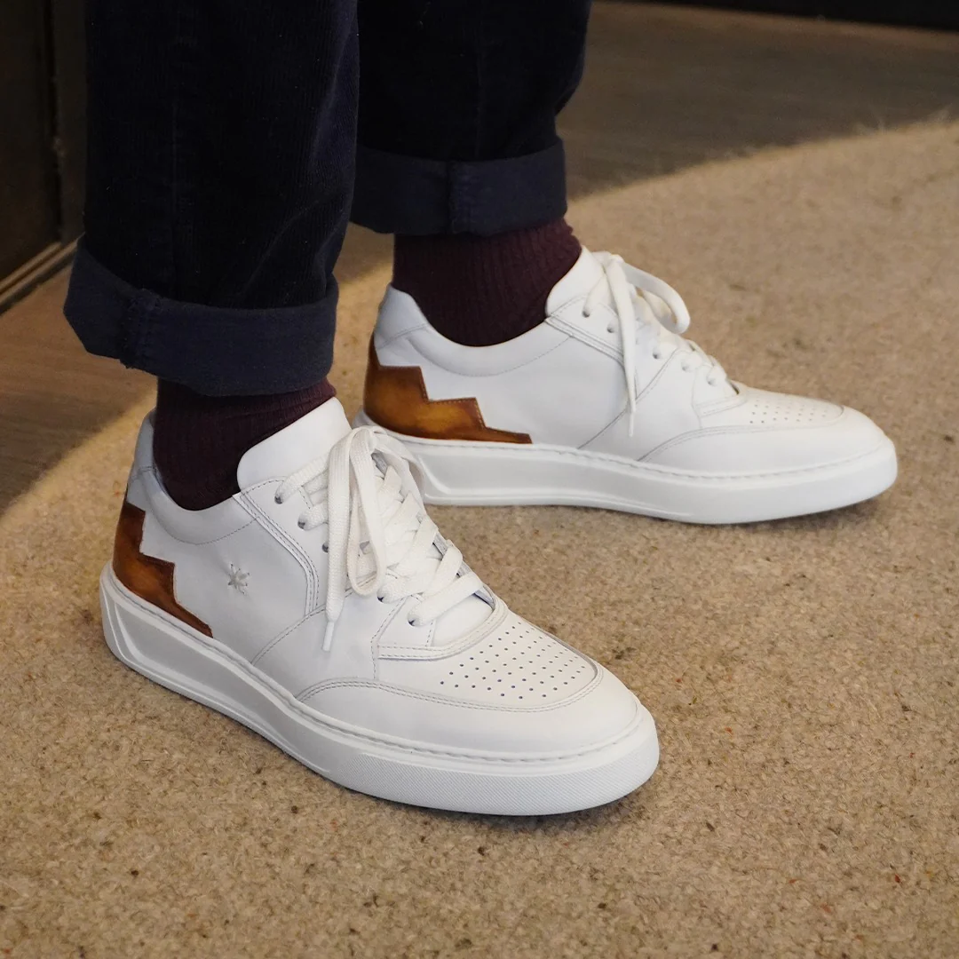 Sneaker de type “basketball” Monserant X Caulaincourt. Kerguelen est une basket en cuir élégante et décontractée. Très confortable, elle est fabriquée à la main en Italie dans des peausseries soigneusement sélectionnées. Vous pouvez personnaliser votre paire de sneakers grâce à la patine à la carte faite à la main qui est incluse dans le prix.