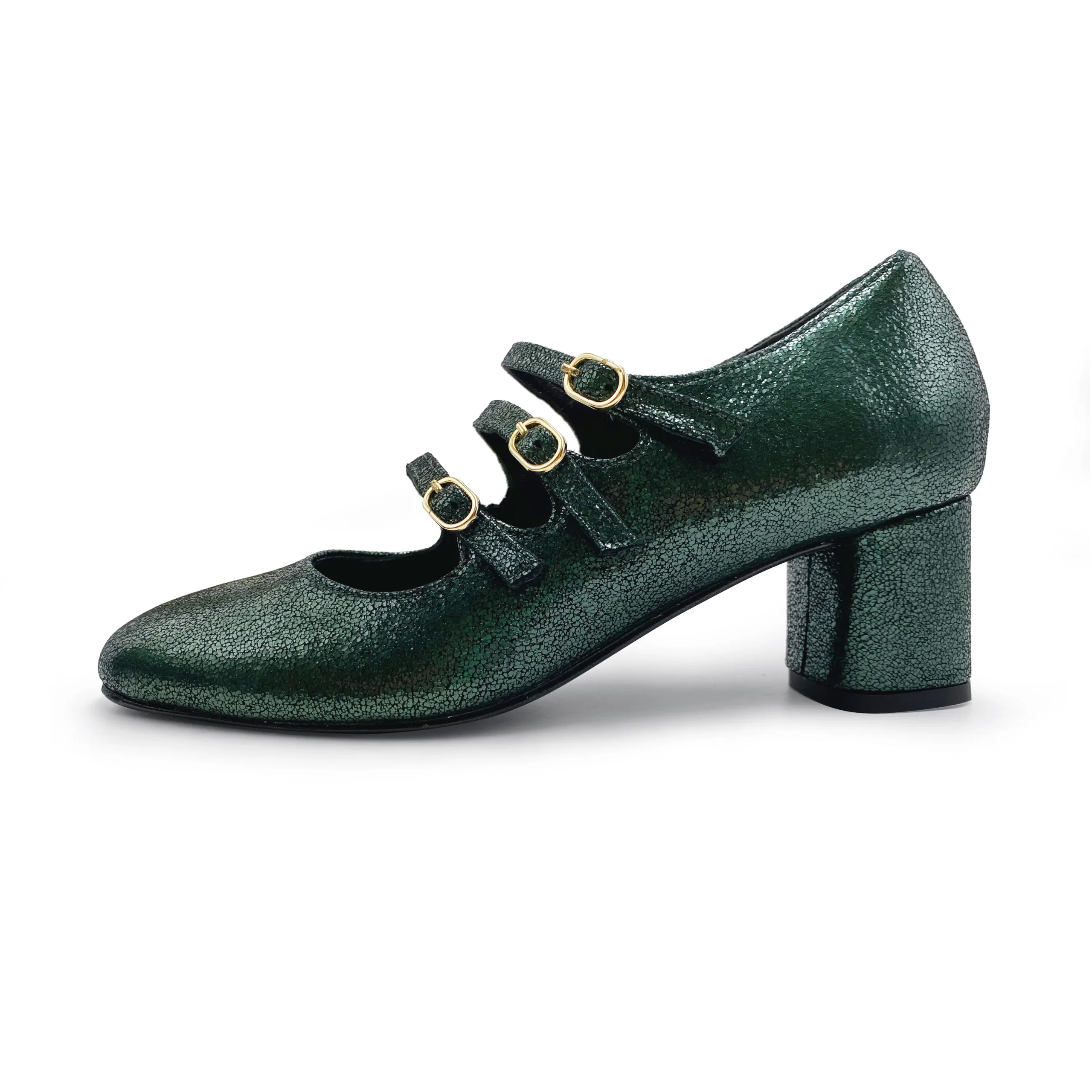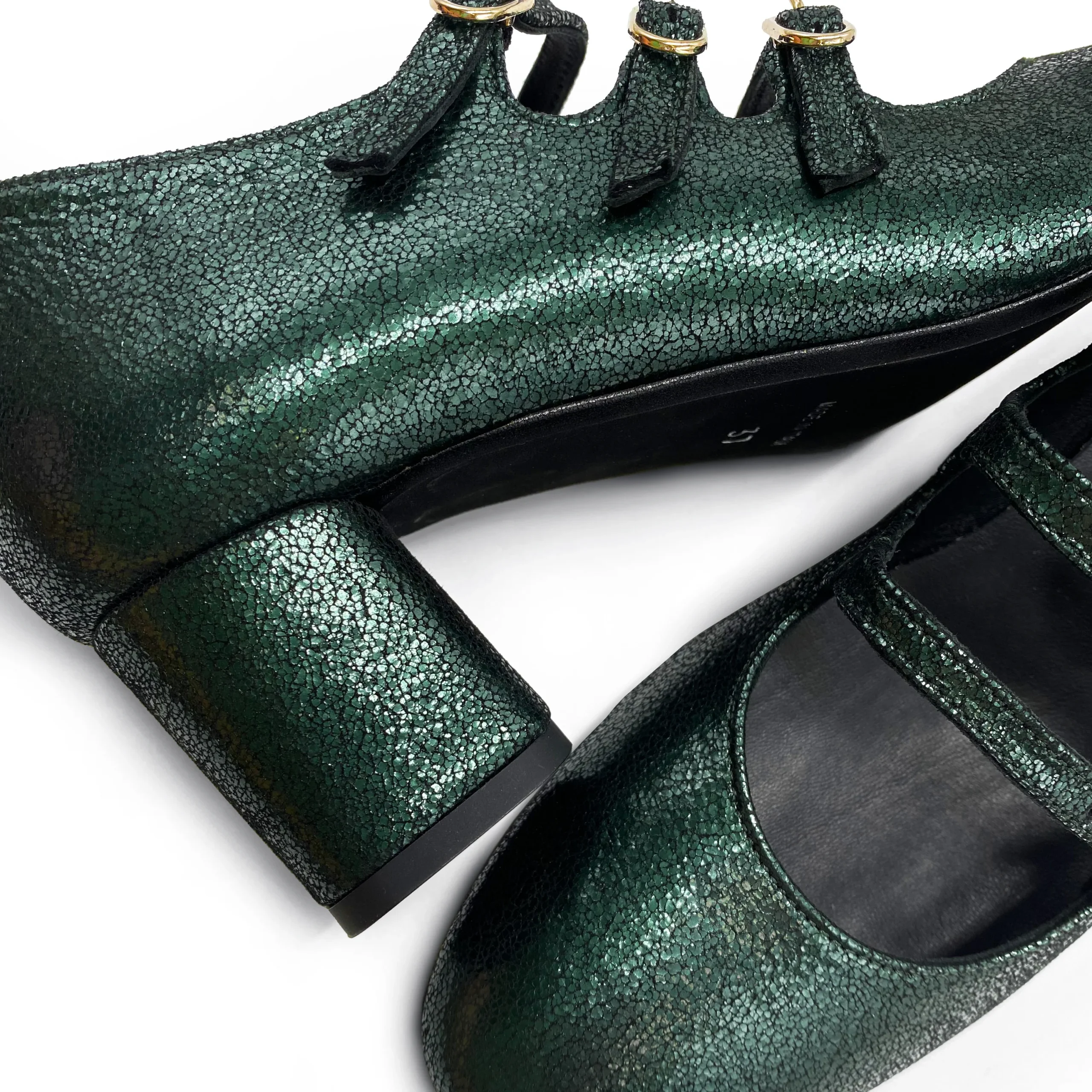 Immancabile nella collezione BallereTTe un modello di Mary Jane dal fascino retrò rivisitato in chiave moderna e accattivante. Le Campidoglio presentano una morbida linea con punta tonda e tre cinturini che adornano il dorso del piede e rendono la ballerina ben salda nella camminata. Poggiano su un comodo tacco di 5 cm dalla forma cilindrica che slancia la silhouette e dona maggiore stabilità. Con questa versione in camoscio laminato color verde immaginiamo un vestito fondo blu notte con dettagli color senape, una palette di colori in tono con le nuance perfette per questa stagione.