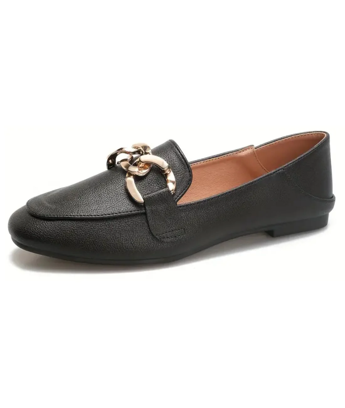 Ces mocassins style ballerine en couleur noire sont dotées d’une conception en cuir grainé de synthèse, ultra réaliste. Une double boucle dorée est fixée sur le dessus de l’empeigne, créant un look raffiné et indémodable à a chaussure. Ces chaussures basses comprennent aussi un tout petit talon à l’arrière de la semelle, vous élevant d’un centimètre lorsque vous marchez.