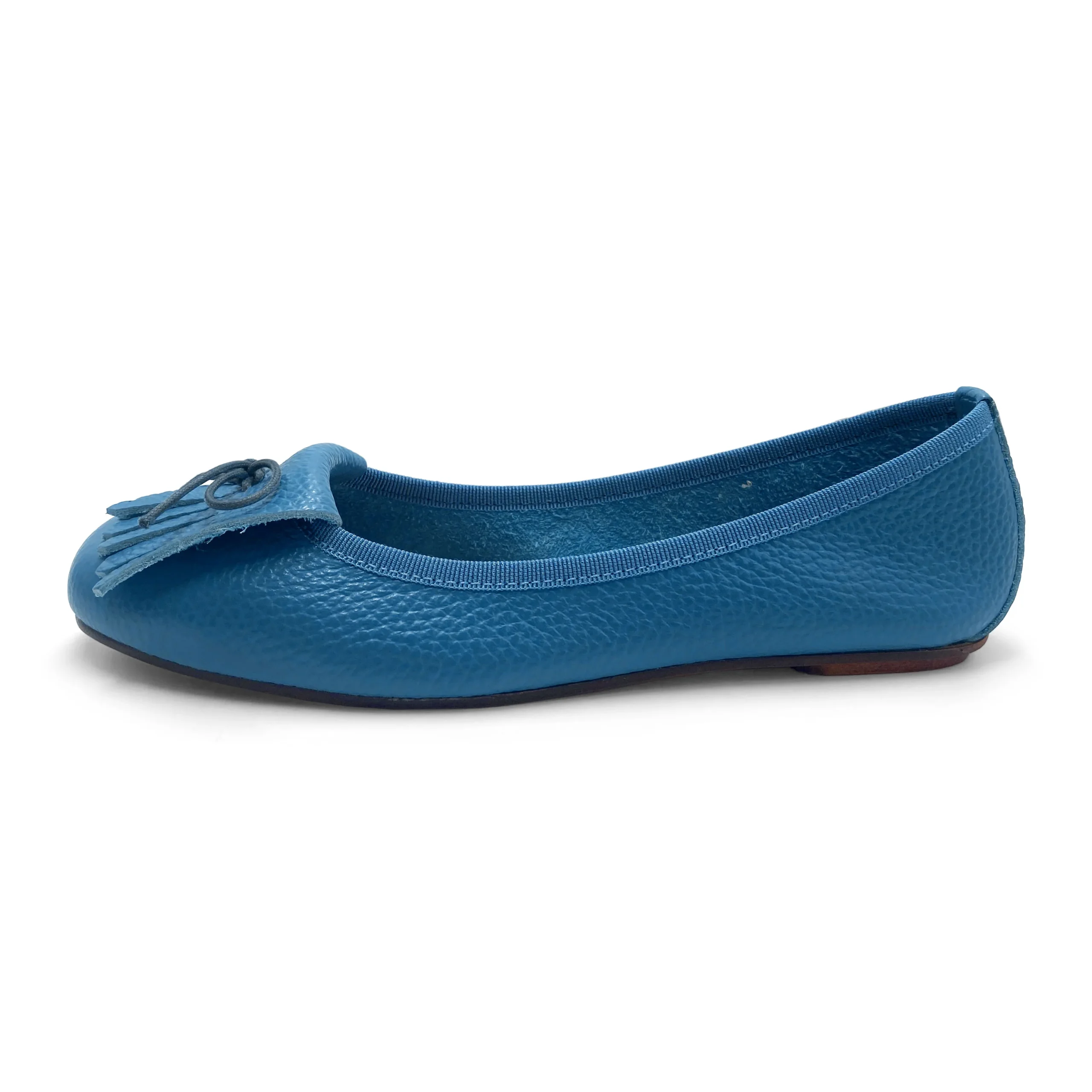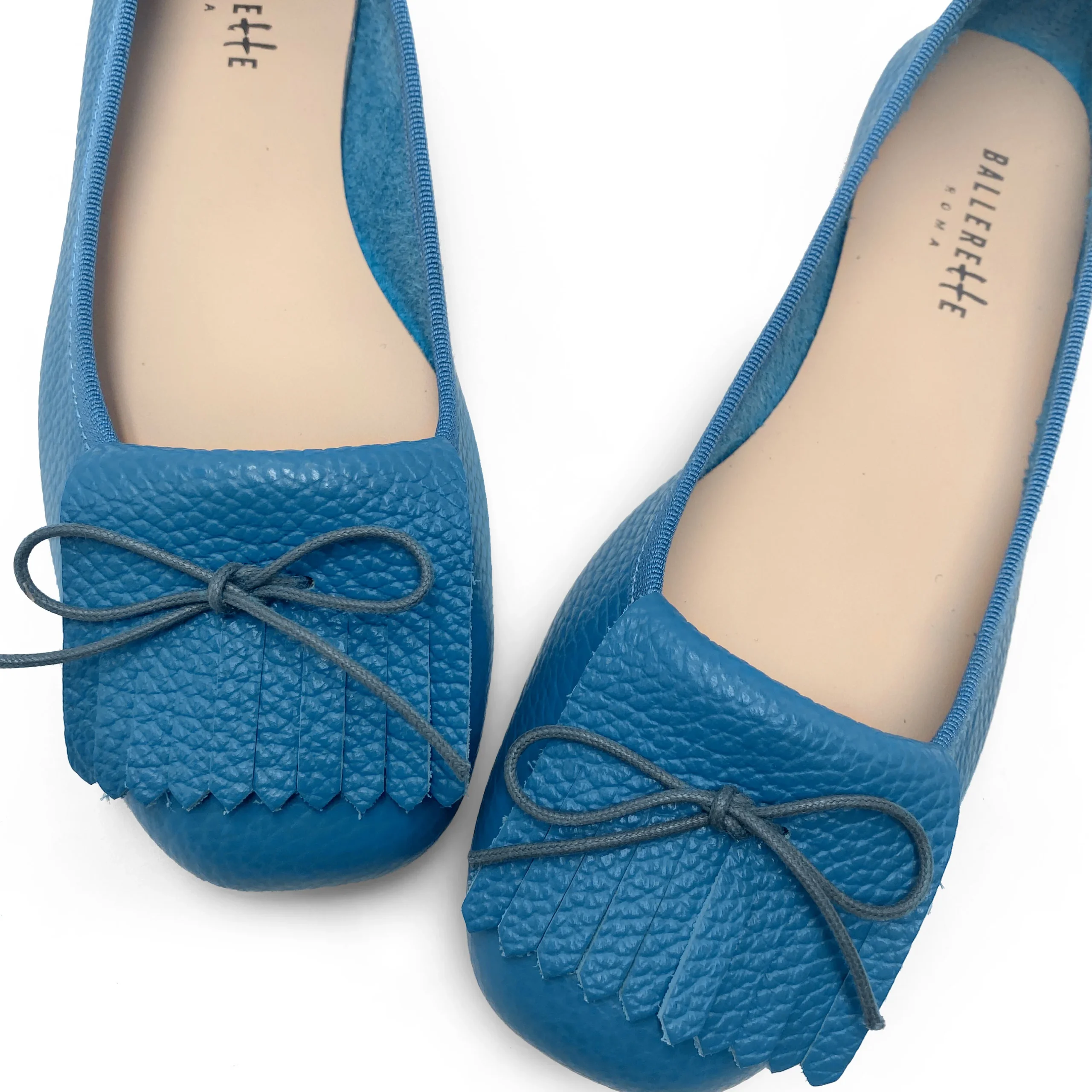Le Margana sono mocassini da donna in morbida pelle martelata effetto cervo che donano un look sportivo a questo modello di scarpa bassa, ormai diventato un classico del gurdaroba femminile. La punta è leggermente squadrata, lo scollo rotondo rifinito da gros grain e caratterizzato da una lunga frangia, con fiocchetto in cotone cerato, tutto in tinta. Con interno sfoderto e soletto in pelle, le Margana sono mocassini estivi femminili così confortevoli da poterle indossare tutta la giornata. In questa versione nei toni freschi dell’azzurro ceruleo, si abbineranno con faciltà, risultando un valido alleato di stile in innumerevoli occasioni. Provale sotto un completo giacca pantalone con camicia in tinta per un look da ufficio, oppure con una gonna plissettata alla caviglia e blusa fantasia per una piacevole uscita con amiche.
