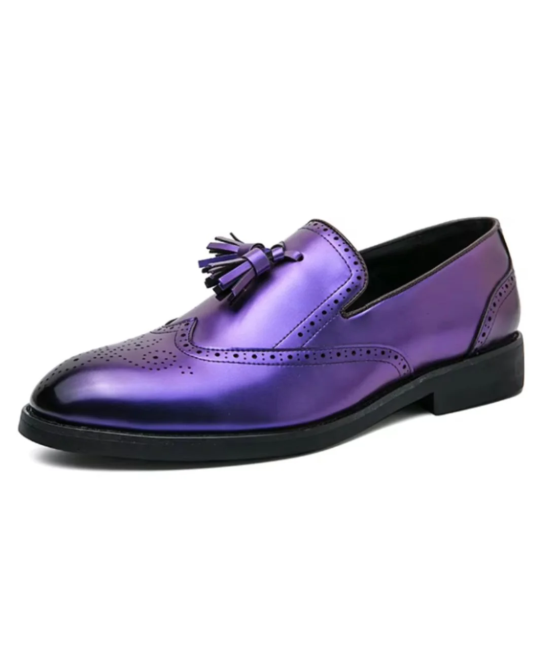 Le violet, véritable symbole de créativité et de luxe, est magnifiquement mis en valeur ici avec une nuance métallisée, mais aussi des motifs ajourés répartis sur toute la longueur. Comme tout mocassin de soirée chic et décontracté que l’on aime, des pampilles également violettes sont présentes sur la partie supérieure. Un modèle qà porter quelque soit la saison.