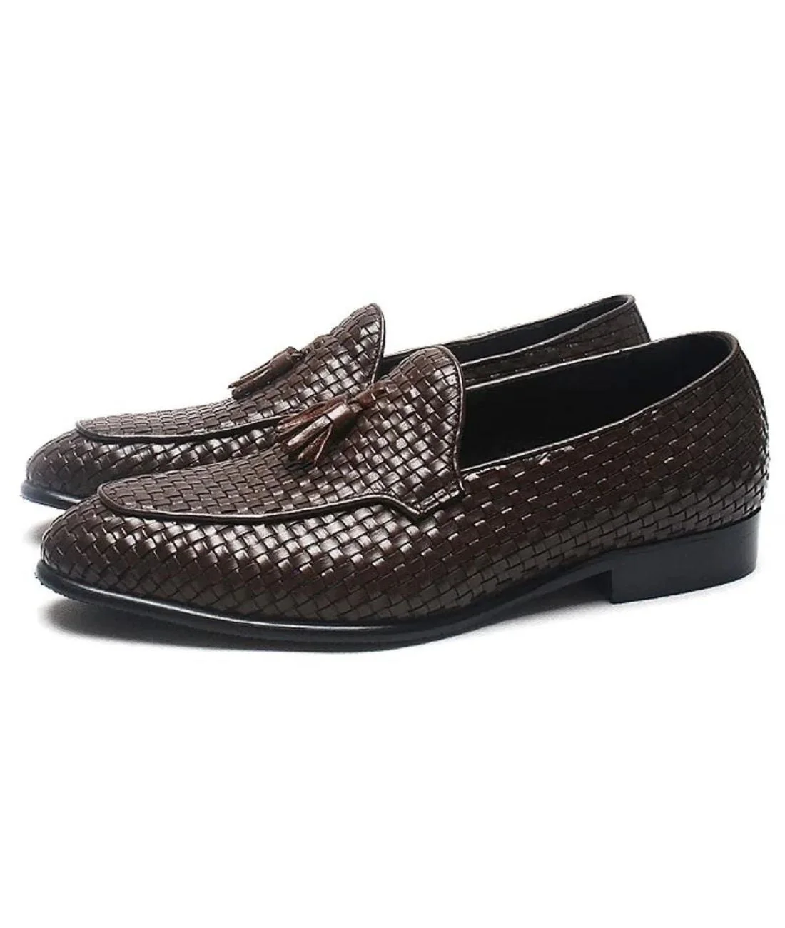 Une paire de mocassins à glands en cuir effet tressé, alliant qualité, confort et style pour une allure sophistiquée à chaque pas.