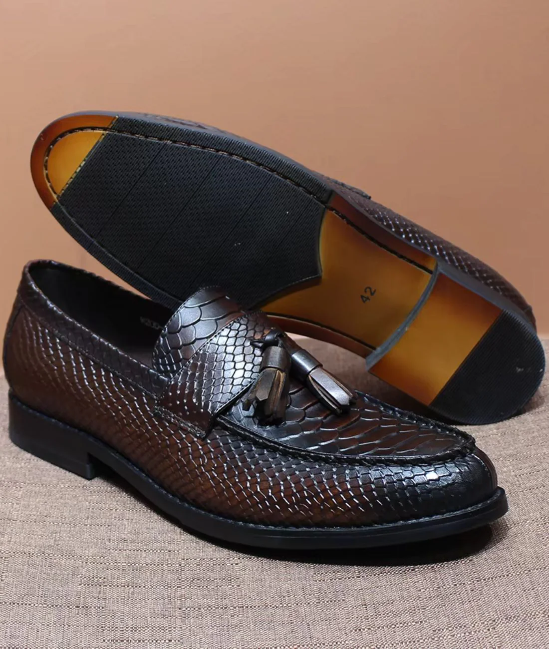 Une paire de mocassins à glands en cuir véritable effet serpent, conçue avec soin pour allier style et confort.