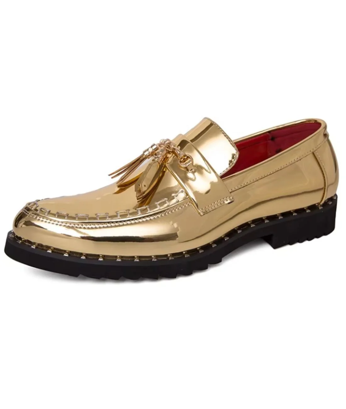 Cette paire de mocassins dorés exprime totalement votre caractère extraverti, et apporte aussi un effet classe à votre style et rehausse votre élégance masculine. Une paire de pampilles, elles aussi dorées, sont ajoutées à son design sur la tige pour créer un look chic et festif supplémentaire. La semelle noire apporte un léger contraste, permettant de vous surélever de quelques centimètres et ainsi d’être plus grand, en bénéficiant d’un grand confort au pied.