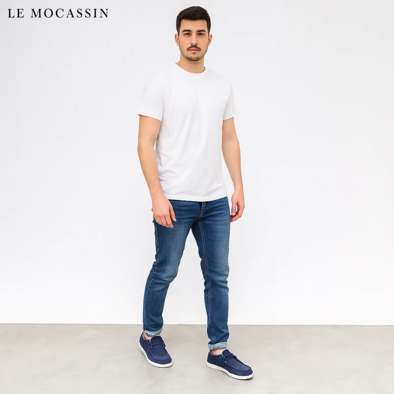 Offre-toi un look unique et intemporel avec ces mocassins au style denim en bleu marine pour homme ! Parfaits pour compléter une tenue printanière, estivale, automnale, voire même hivernale par temps clément. Leur forme de mocassin bateau emblématique leur confère une élégance supplémentaire. Fabriqués en toile de coton au denim bleu foncé, ces mocassins pour hommes se distinguent par leur polyvalence et leur style urbain décontracté. L’intérieur de la chaussure, orné de stries blanches et rouges, assure un confort optimal pour la voûte plantaire et la cheville.