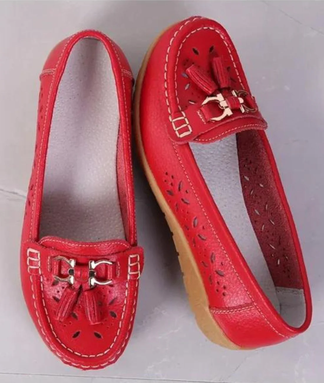Vibrez la ferveur de l’été et du printemps avec ces mocassins rouges ajourés et resplendissants de dynamisme !