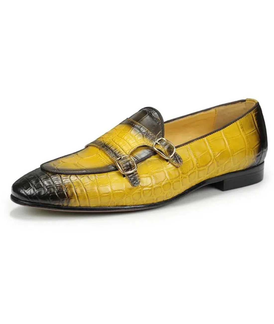 Conçus pour les hommes audacieux qui n’ont pas peur de se démarquer. La combinaison expressive du jaune et des bouts noirs offre un look extraverti, aventurier et sûr de soi, parfait pour les hommes de notre époque qui ont à coeur de captiver l’attention tout en restant élégants. Soigneusement conçus en cuir de haute qualité embossé à chaud d’un design croco, ces mocassins se distinguent nettement par leur texture luxueuse, qui sait offrir une sensation spéciale quand on la touche. Chaque pas révèle votre expression confiante, en affichant un goût marqué pour les styles qui sortent de l’ordinaire.