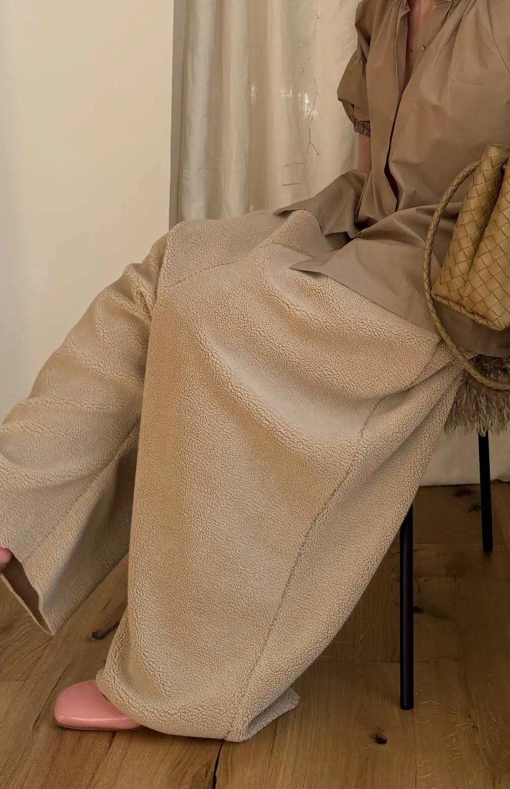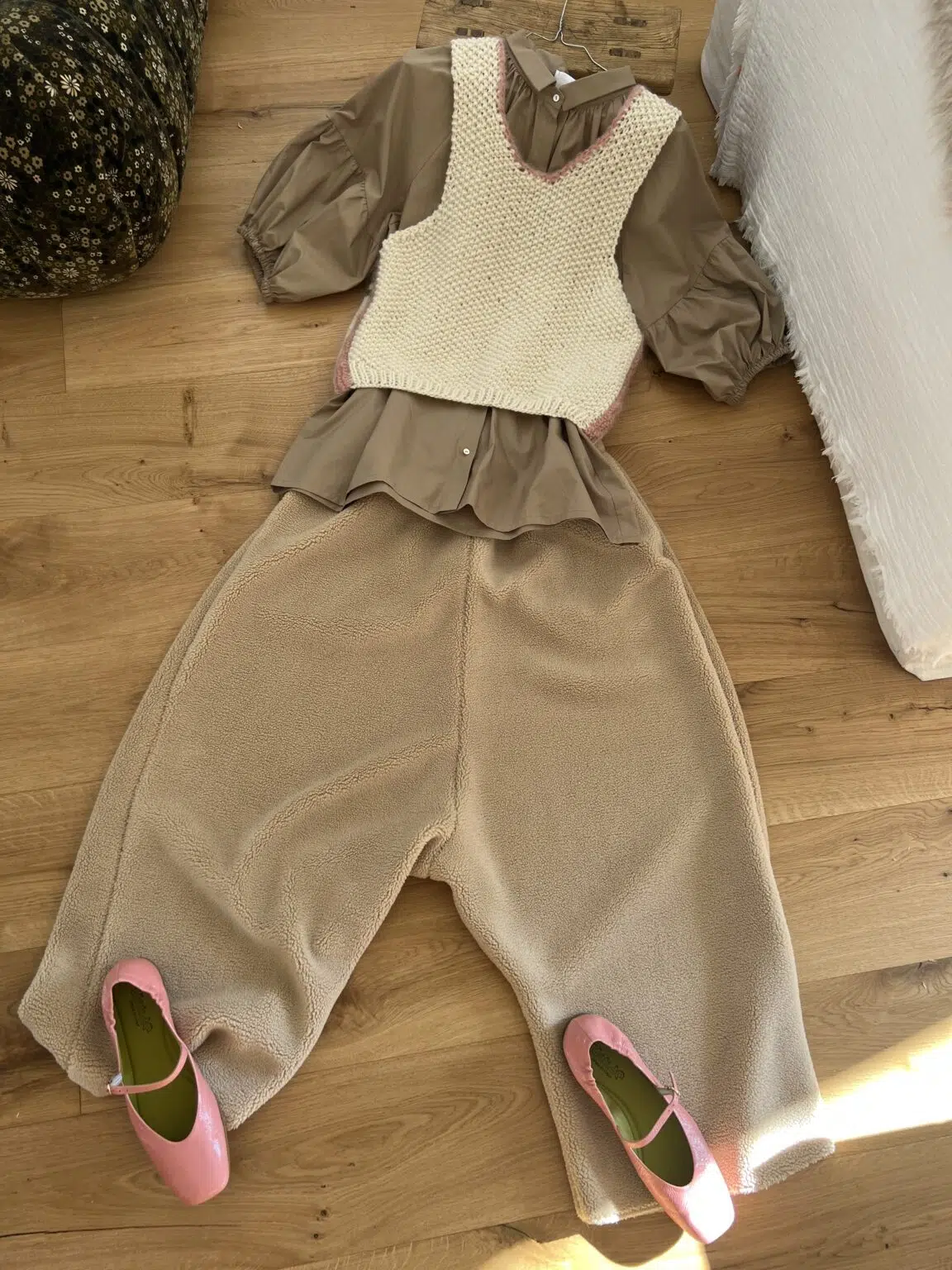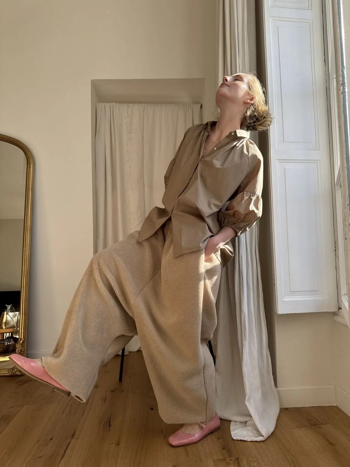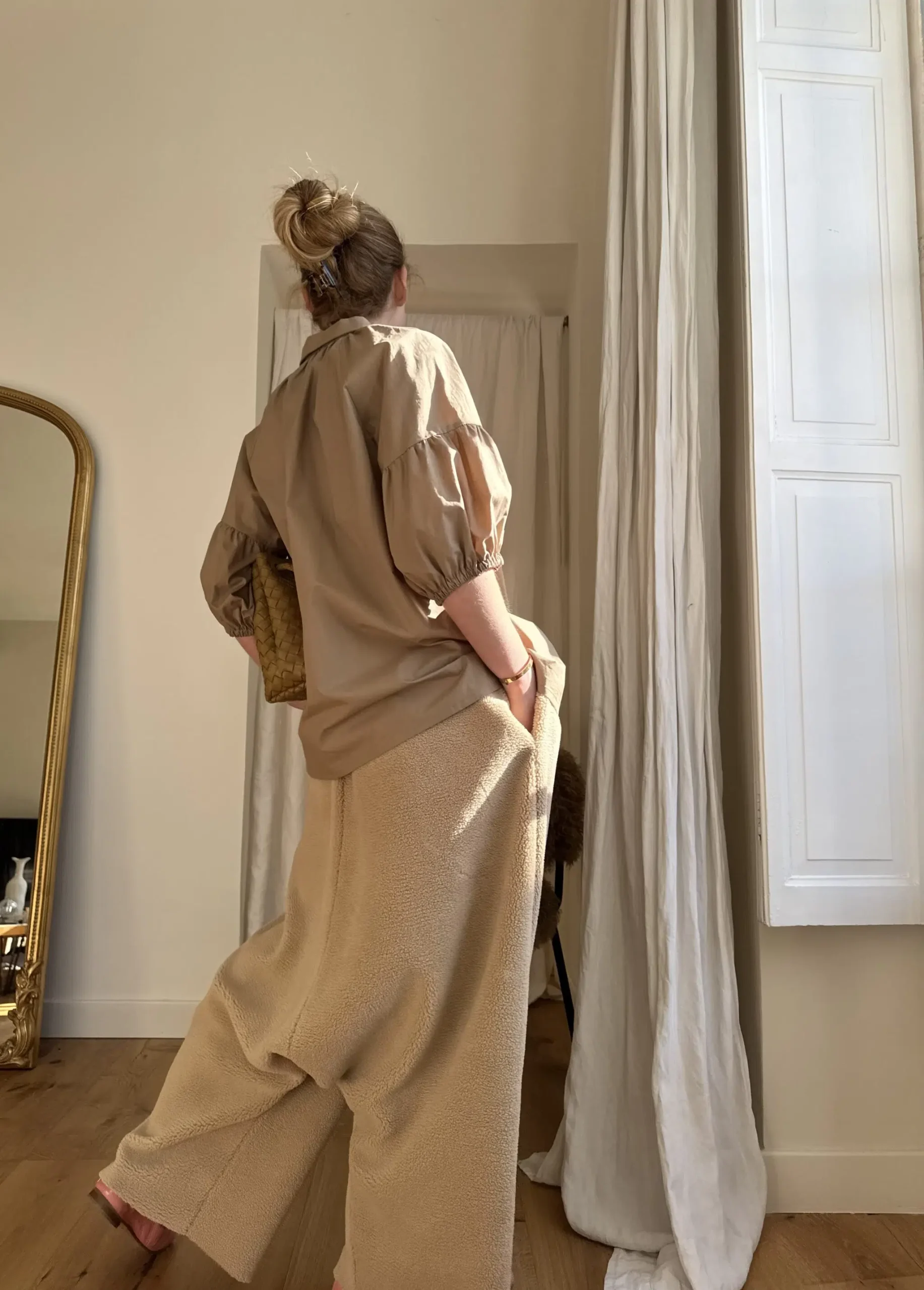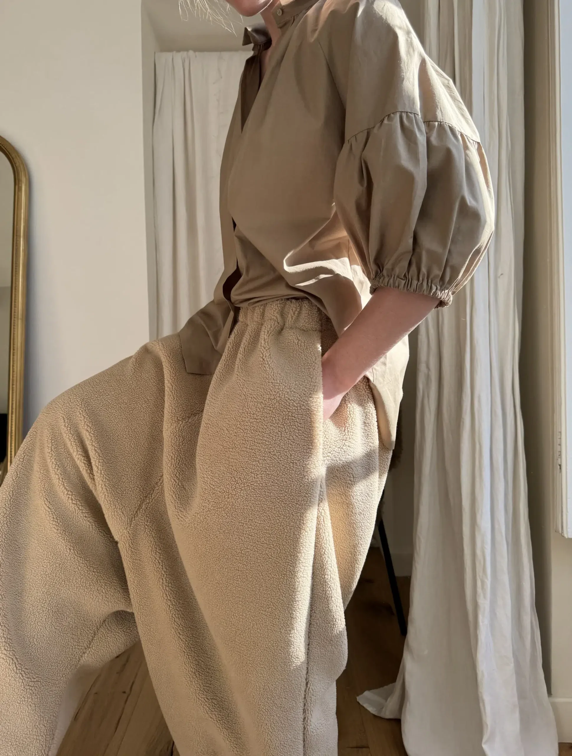 Pantalon « GASTON » tissu sherpa effet mouton, beige. Taille sur élastique, poches latérales, fond de pantalon bas. Une coupe unisexe, oversize.