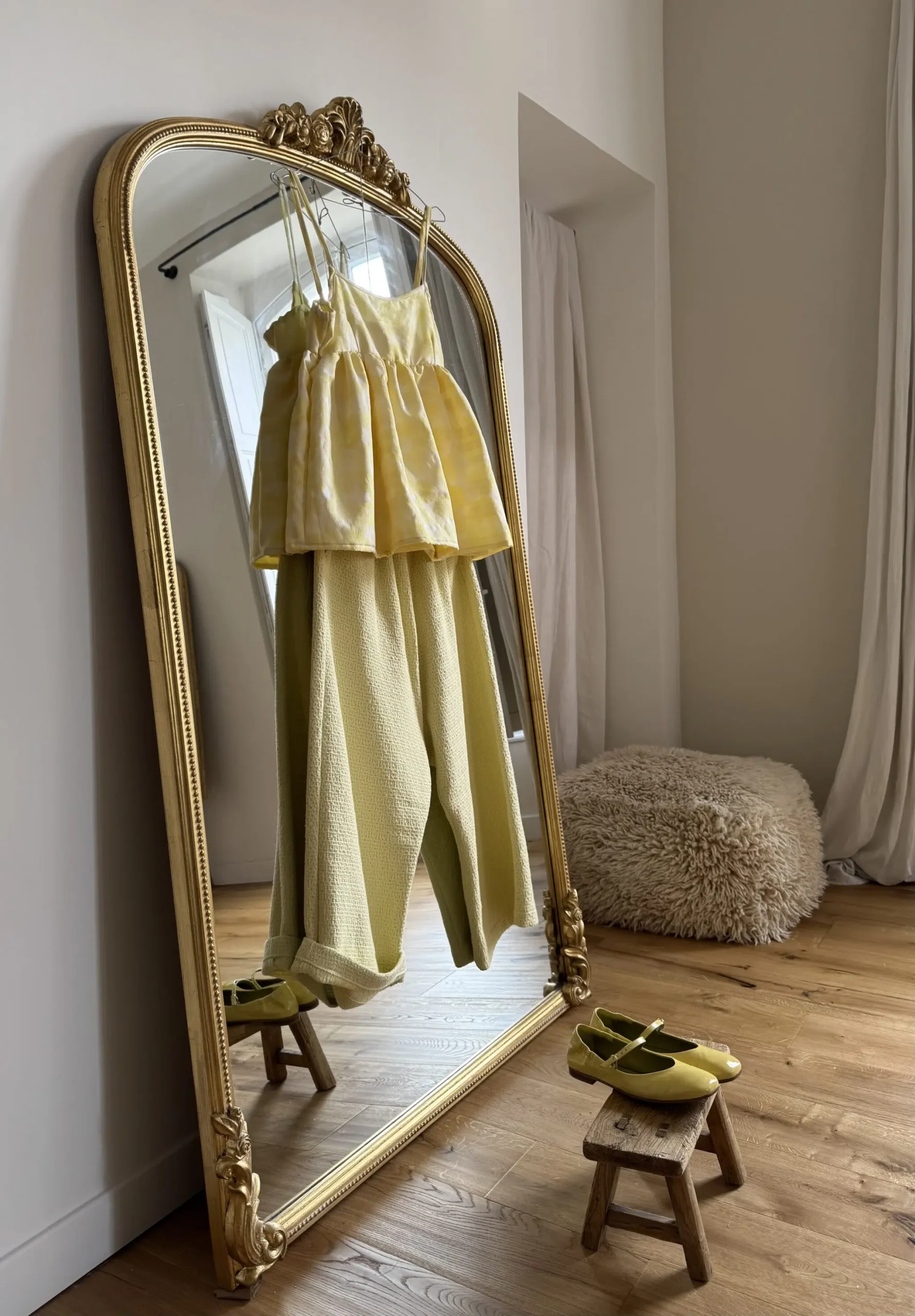 Pantalon « GASTON » tissu tweed coton jaune pâle. Taille froncée sur élastique, poches latérales et poches plaquées à rabat au dos, fond de pantalon bas. Une coupe unisexe, oversize.