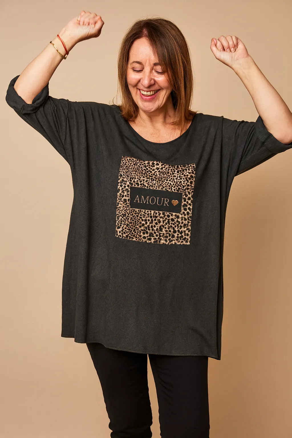 Vous cherchez ce pull oversize doux avec le message AMOUR posé sur un carré léopard ? Le voici.