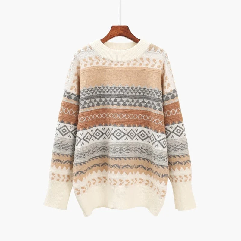 Un pull vintage femme long avec des motifs rayé multicolore et un col rond. Il est ample et adopte un style décontracté. Il possède un design super attirant tout en étant simple en même temps. C’est un pull rétro d’hiver qui vous protégera très bien du froid. Il peut être porté n’importe où avec n’importe quelle tenue de votre choix. Un look simple mais très correct et surtout classe.