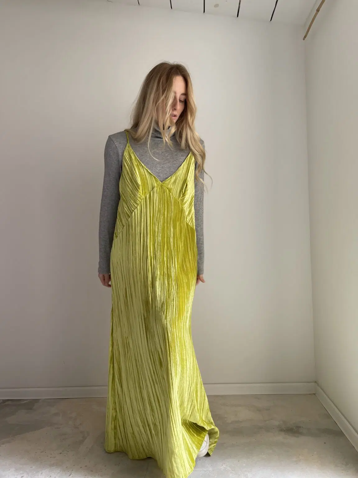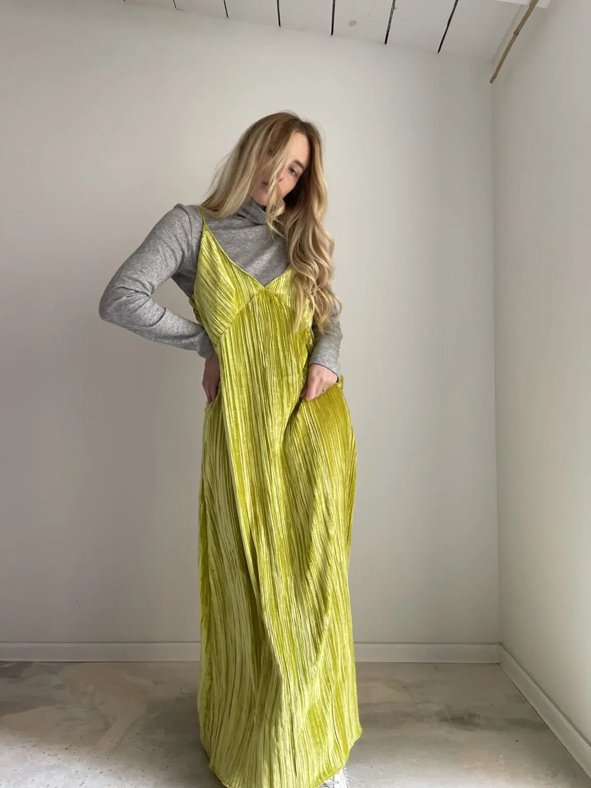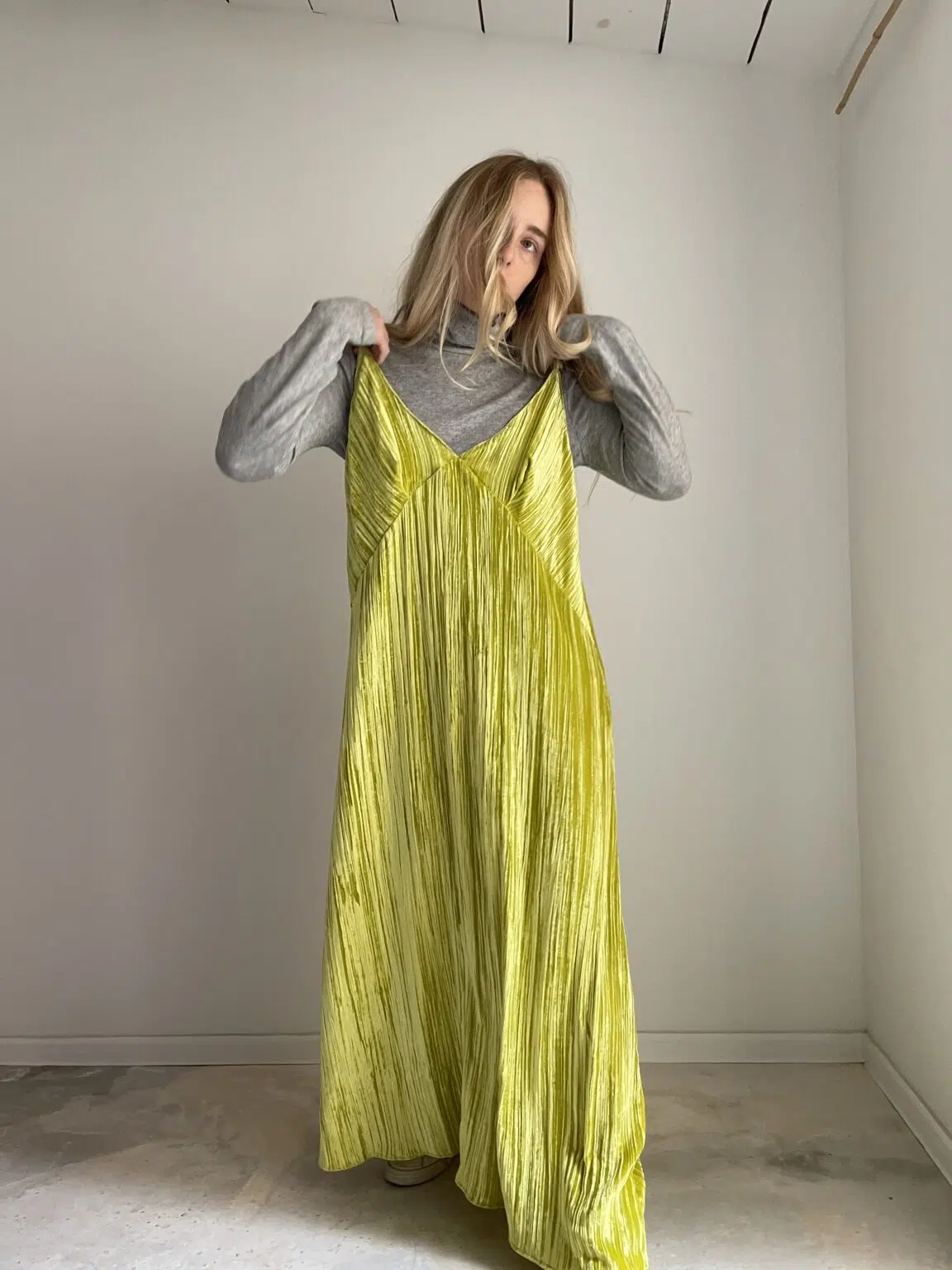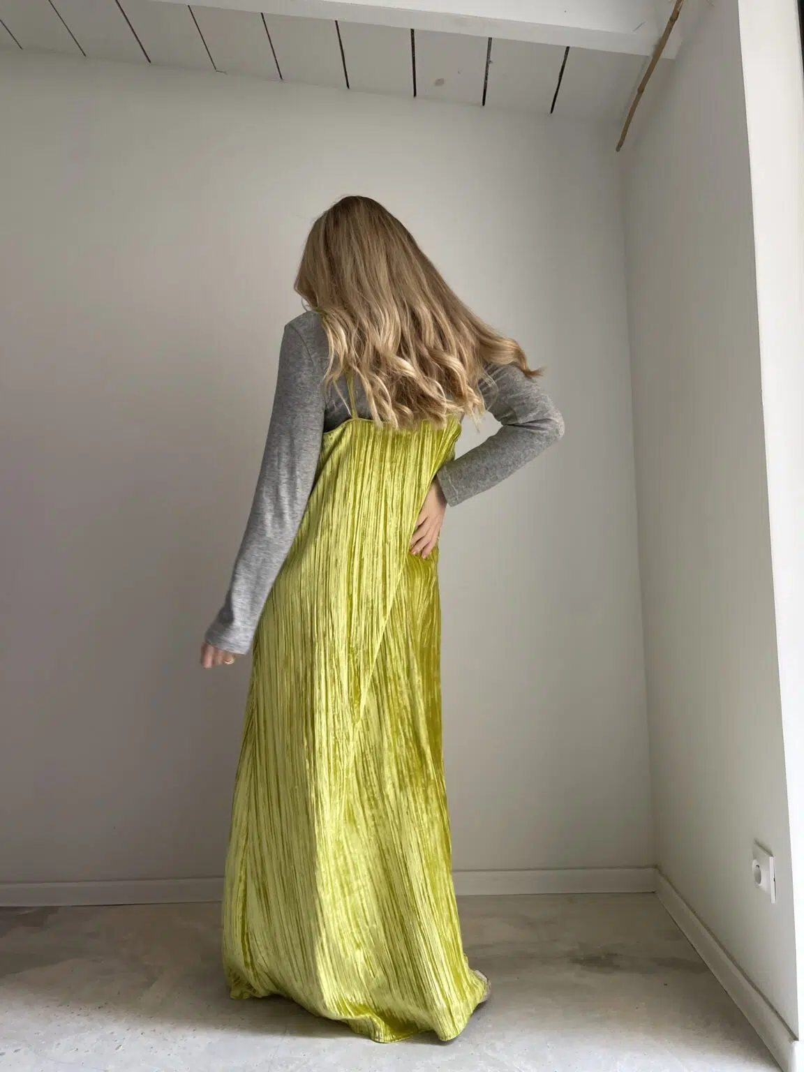 Robe longue, dans une panne de velours vert anis, bretelles, décolletée. Édition très limitée !