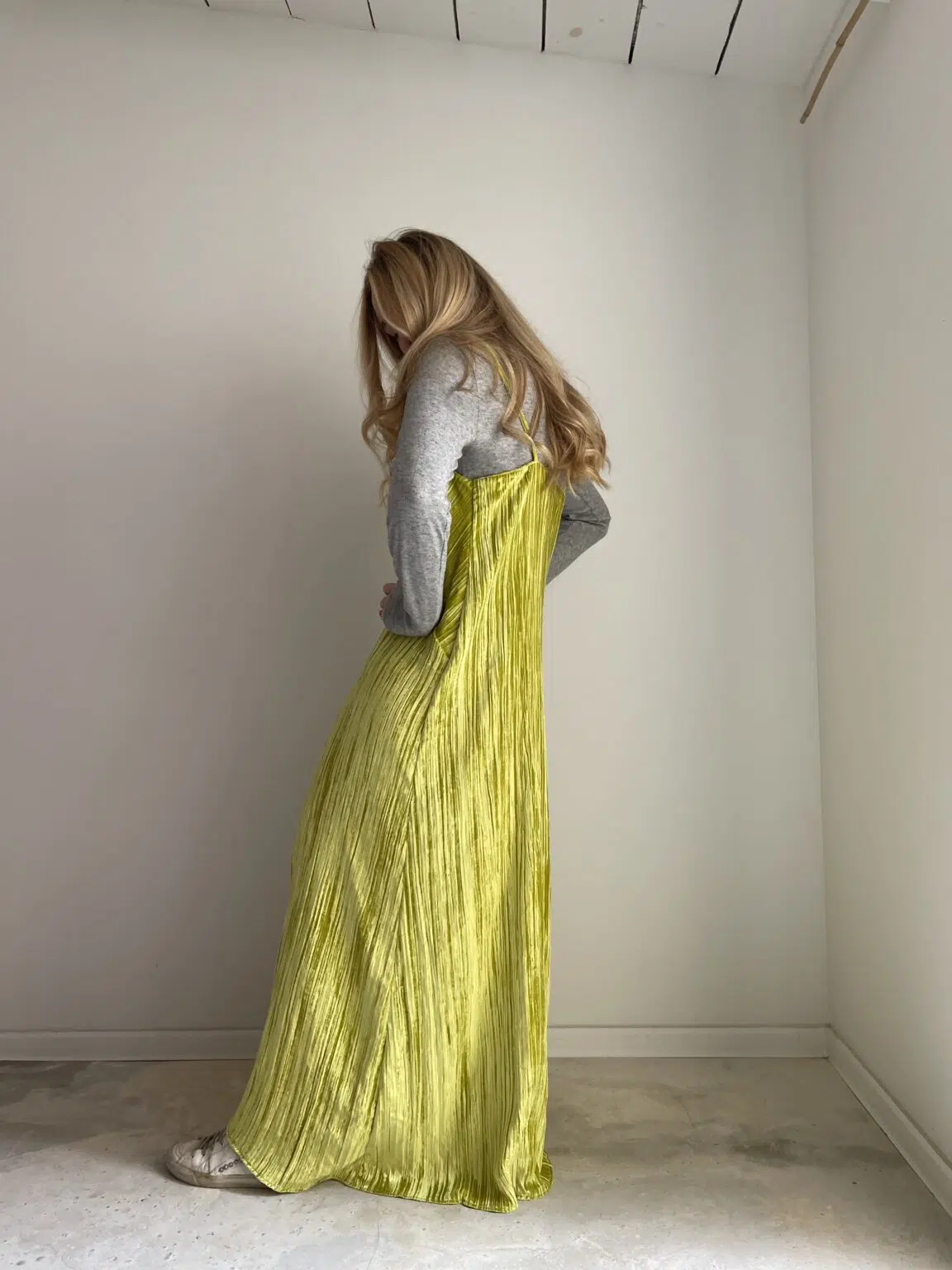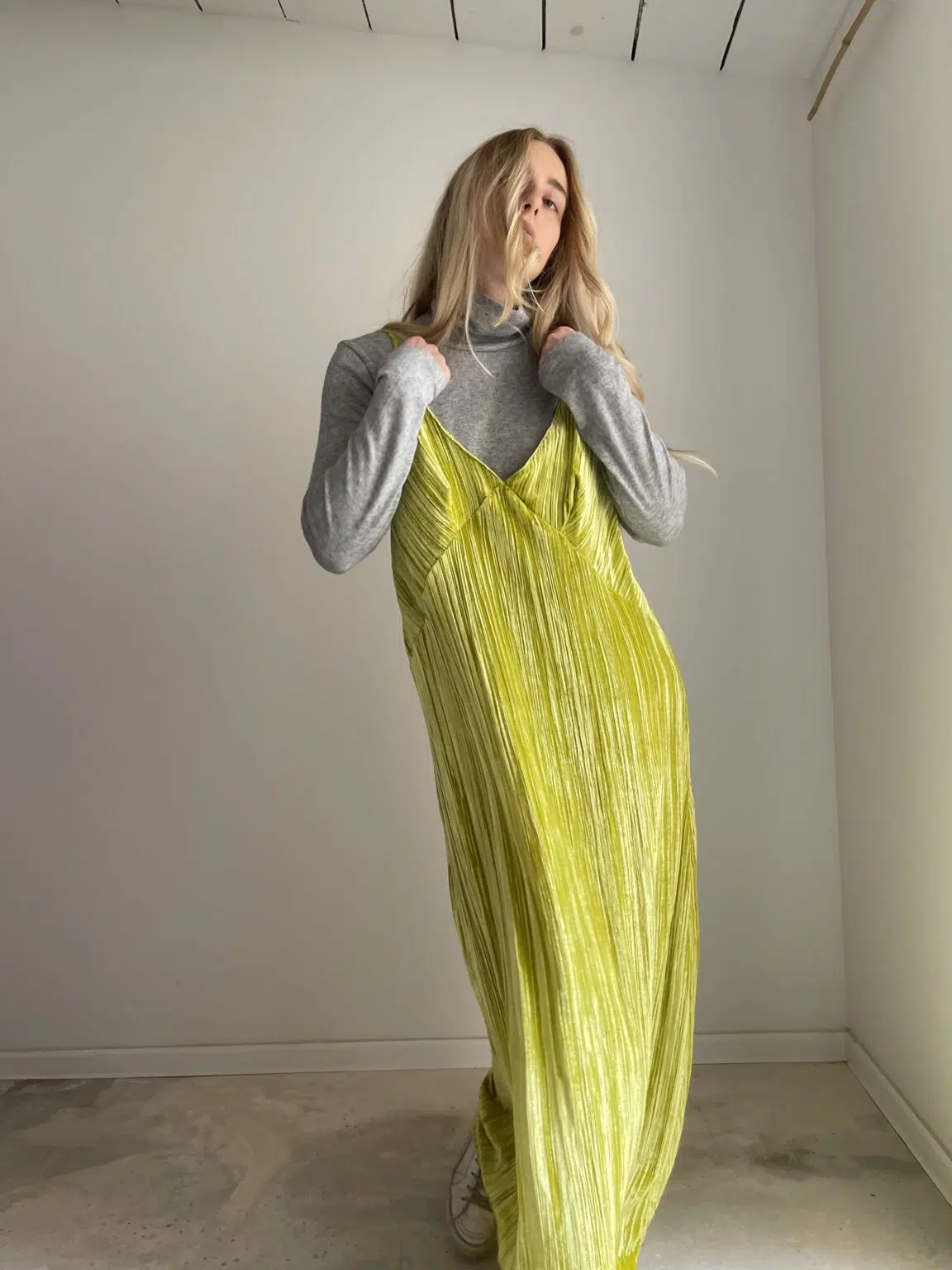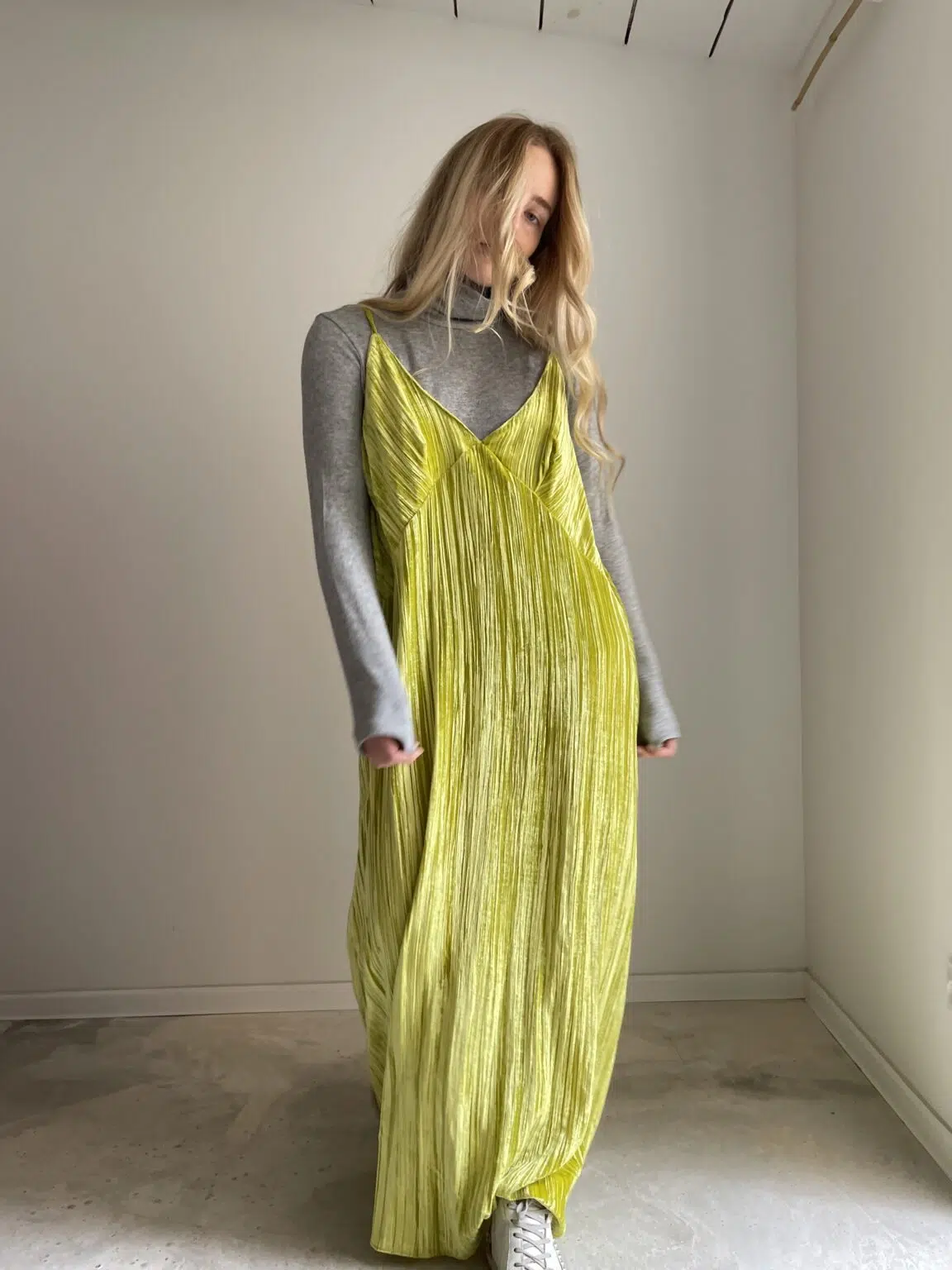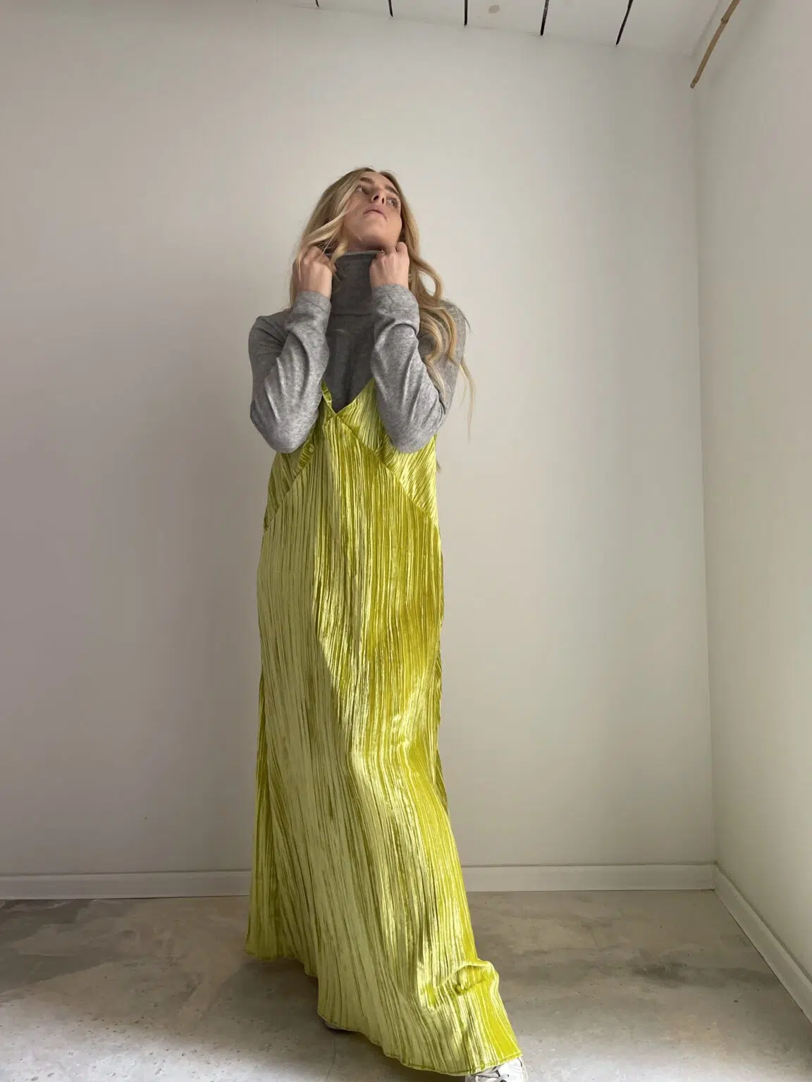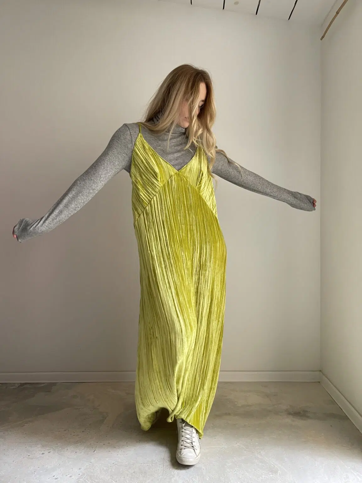 Robe longue, dans une panne de velours vert anis, bretelles, décolletée. Édition très limitée !