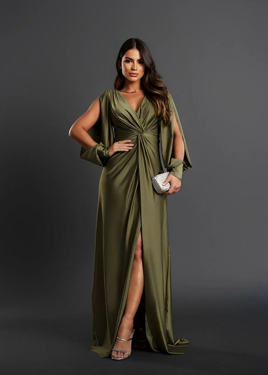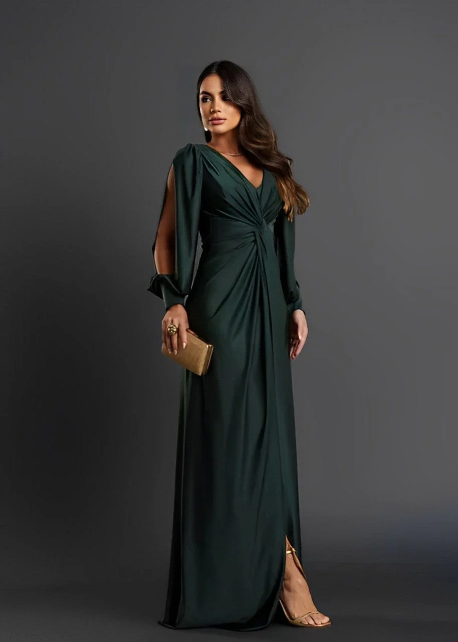 Conçue pour sublimer la silhouette avec délicatesse, cette robe longue satinée se distingue par son drapé central flatteur, son encolure en V et ses manches longues fendues qui dévoilent subtilement la peau. Son tissu fluide et légèrement brillant épouse les mouvements avec légèreté, tandis que la fente sur le devant allonge la jambe tout en finesse. Une pièce idéale pour vos soirées, mariages ou grands événements.