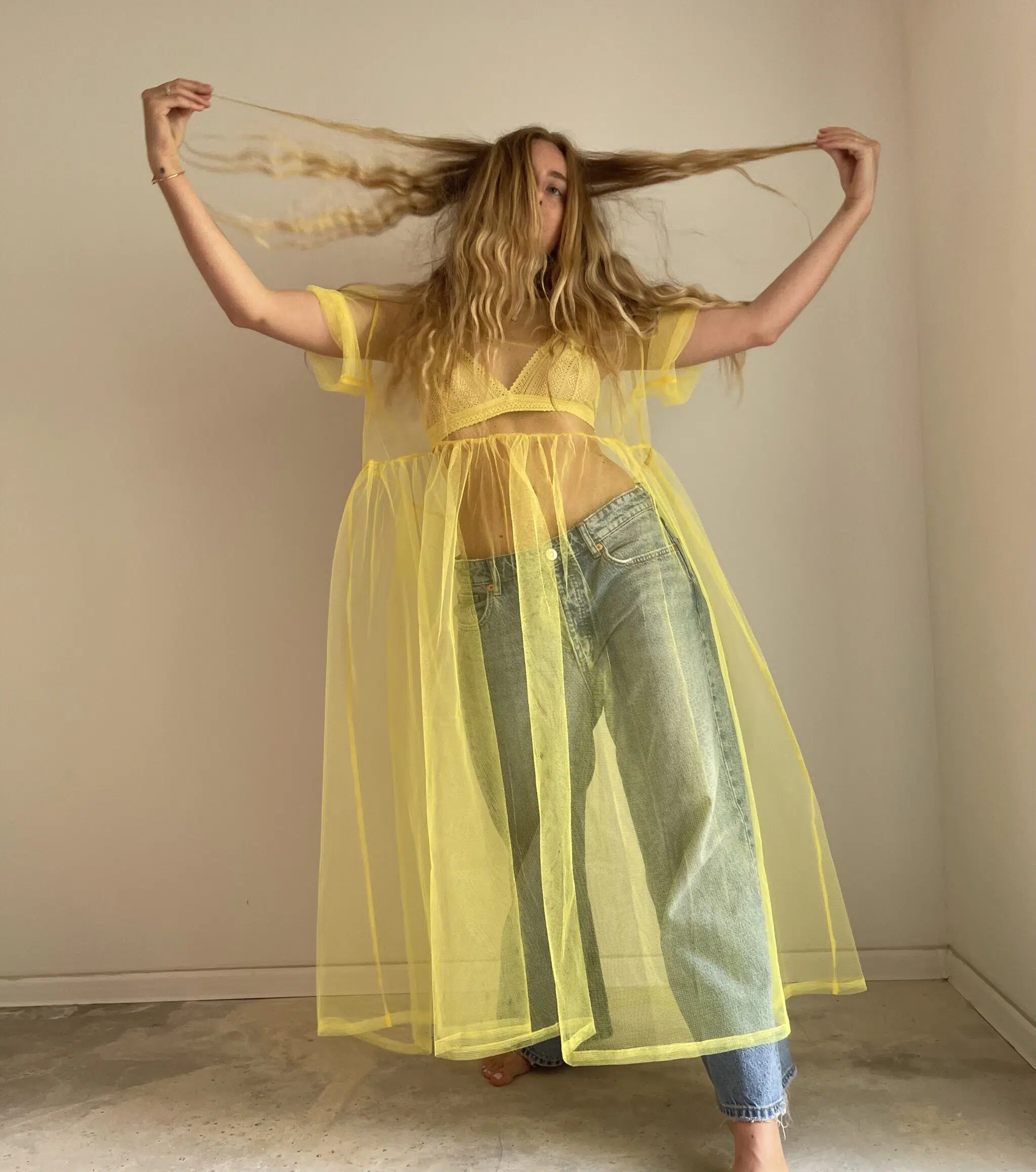 Robe LOUISETTE en tulle jaune, coupe minimaliste et intemporelle pour une robe originale.