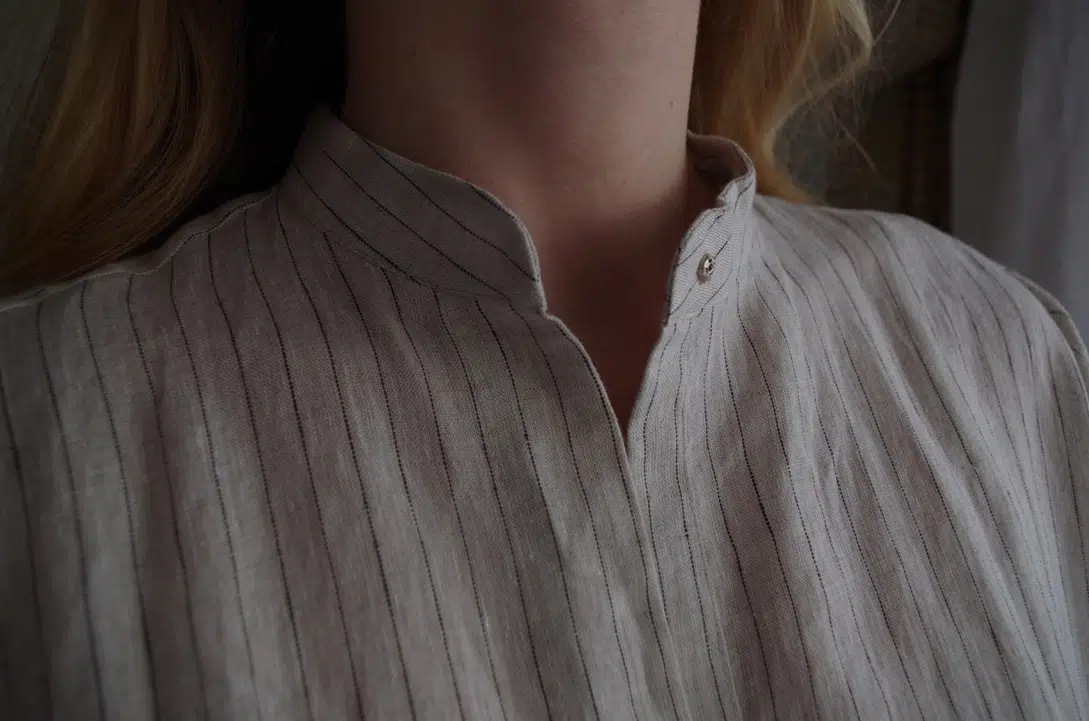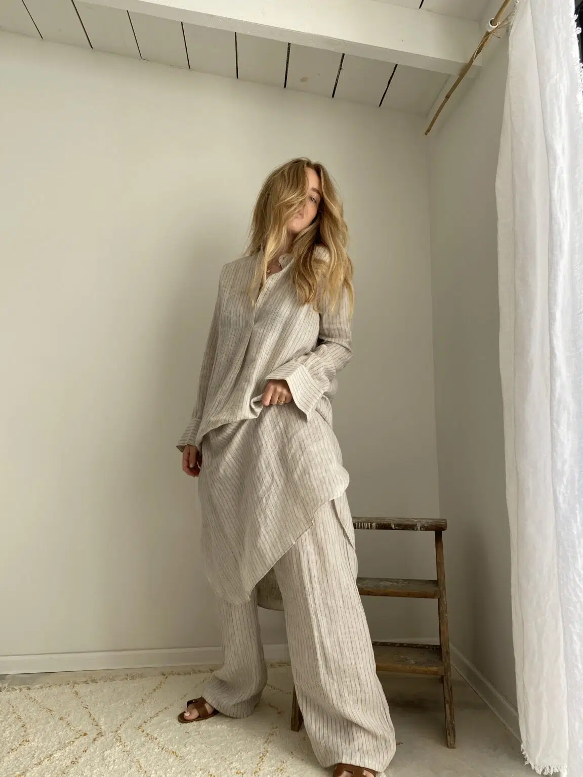 Robe LUCIE en lin lavé grège à fines rayures grises, ceinture, un style « loose » pour un confort assuré !