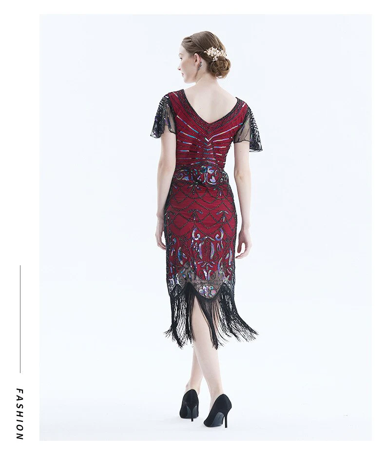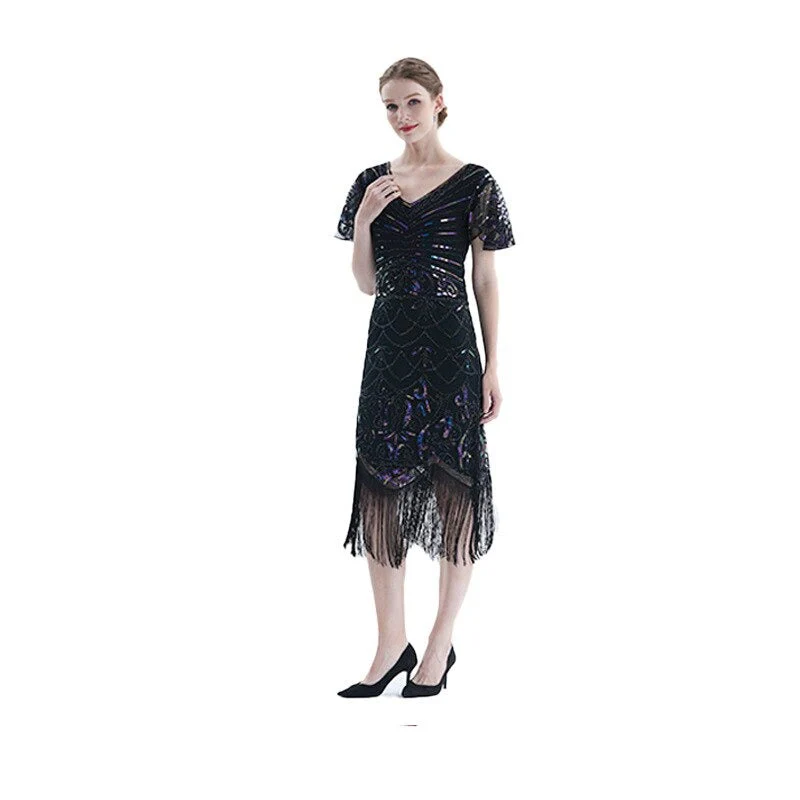 Cette robe rétro des années 20 est la tenue de coupe droite serrée au niveau de la hanche faite pour toute taille de la femme. Elle est conçue avec un col en forme de V et d’une courte manche cloché. Celle-ci est portable pour plusieurs occasions, que ce soit une fête, ou une soirée, ou encore un bal. C’est un style datant des années folles, mais pourtant encore tendance de nos jours.