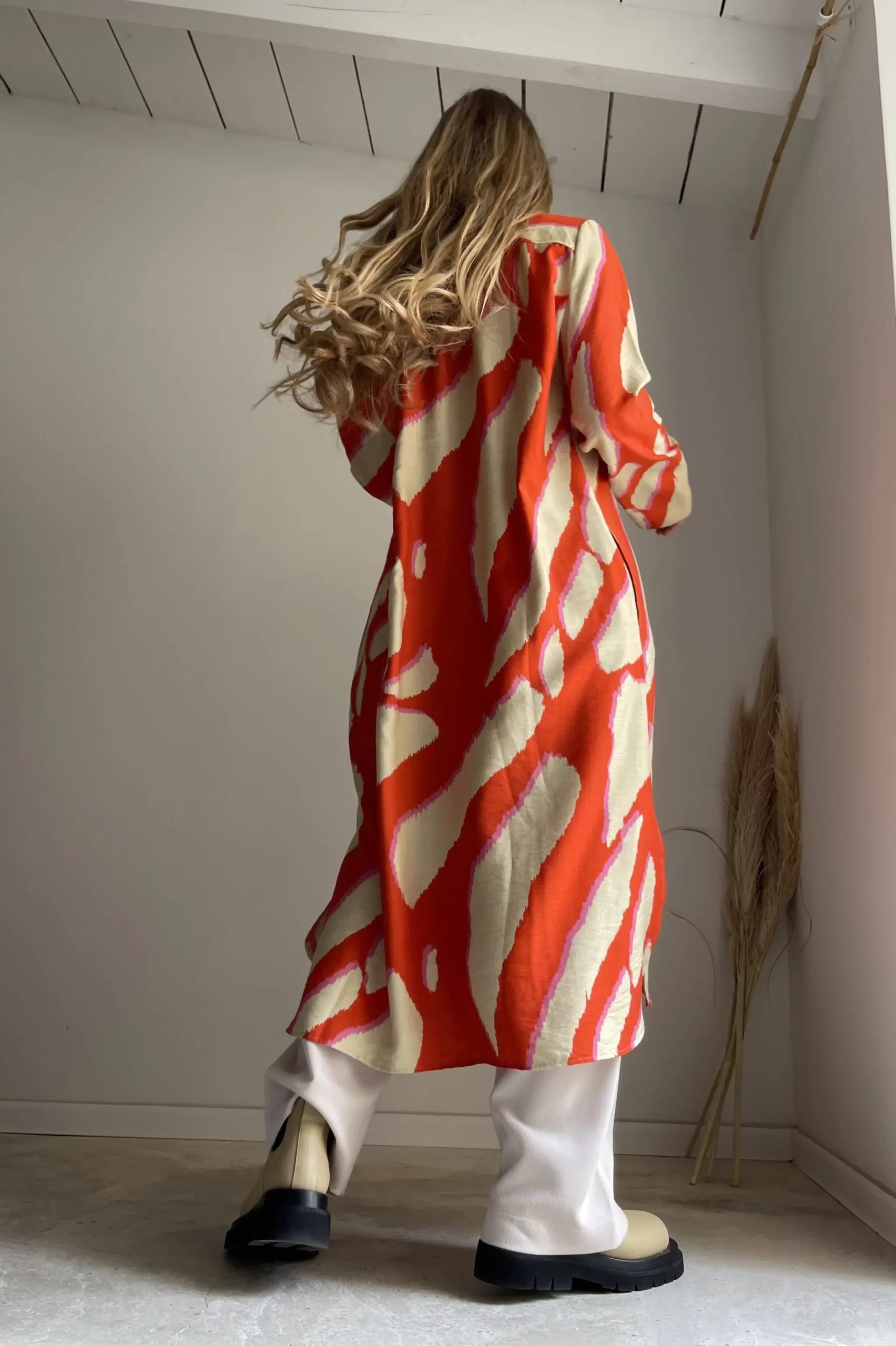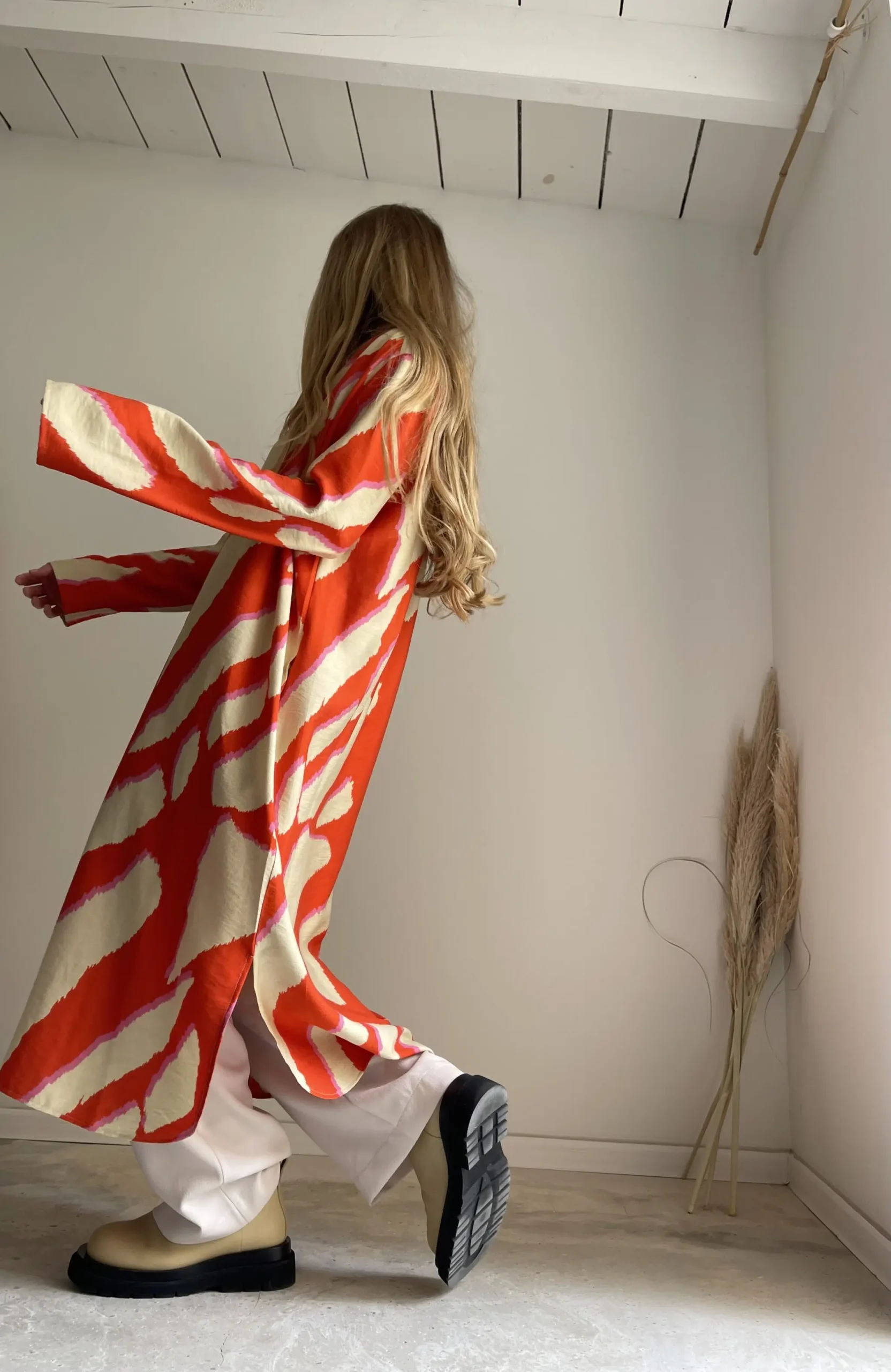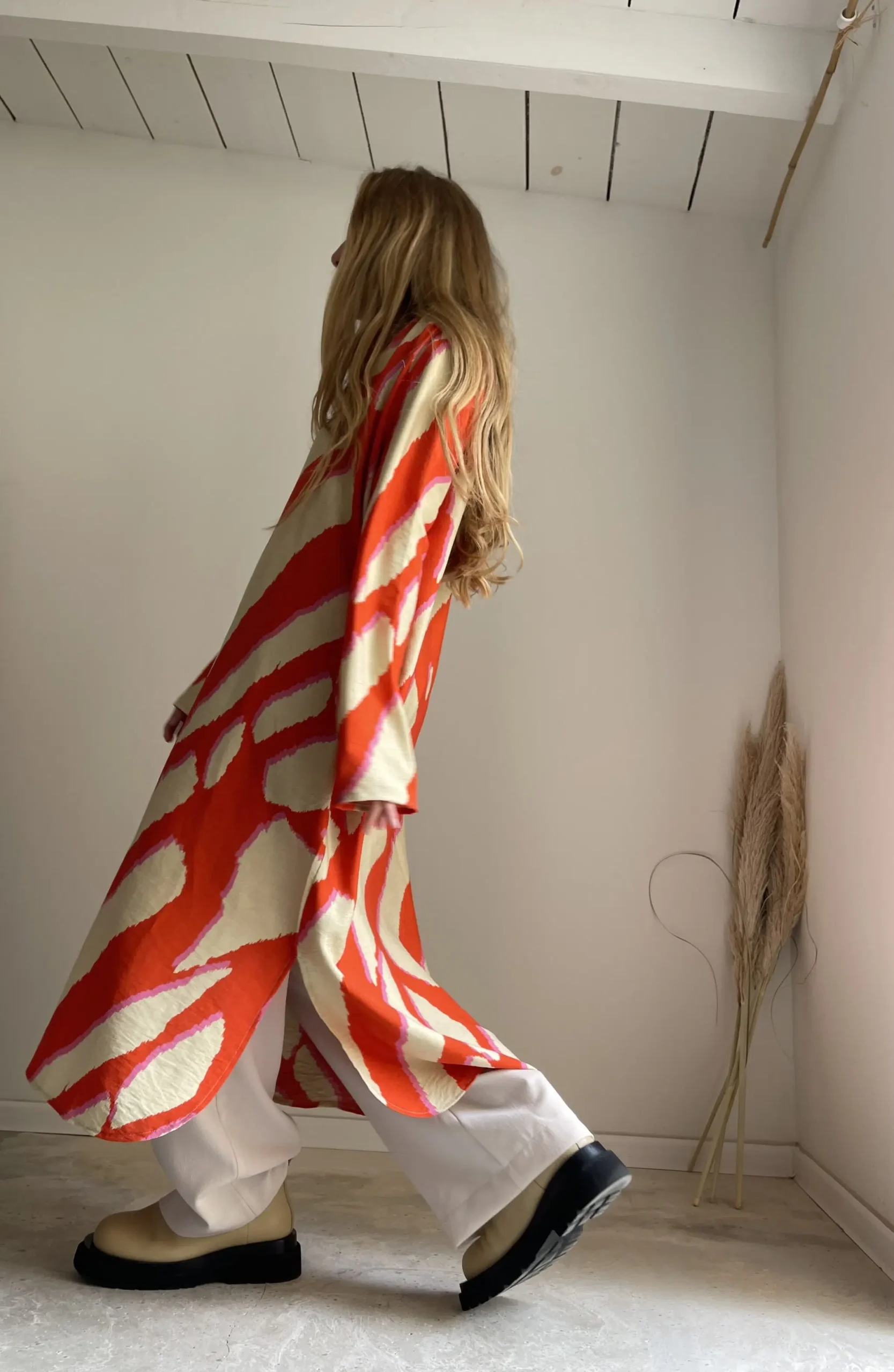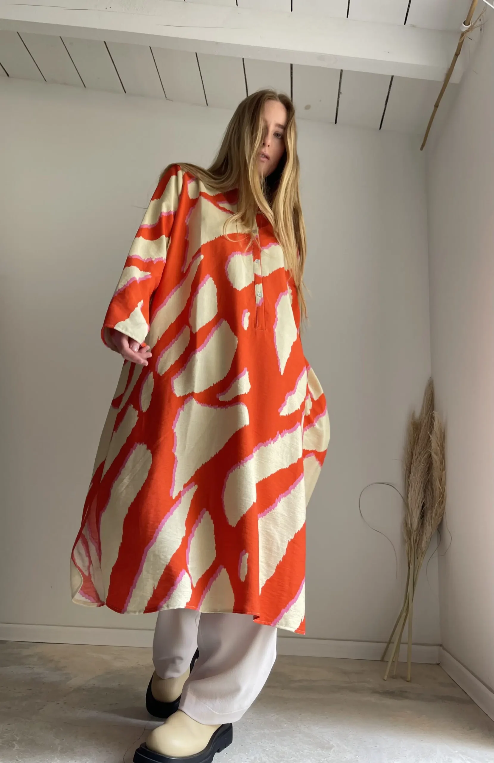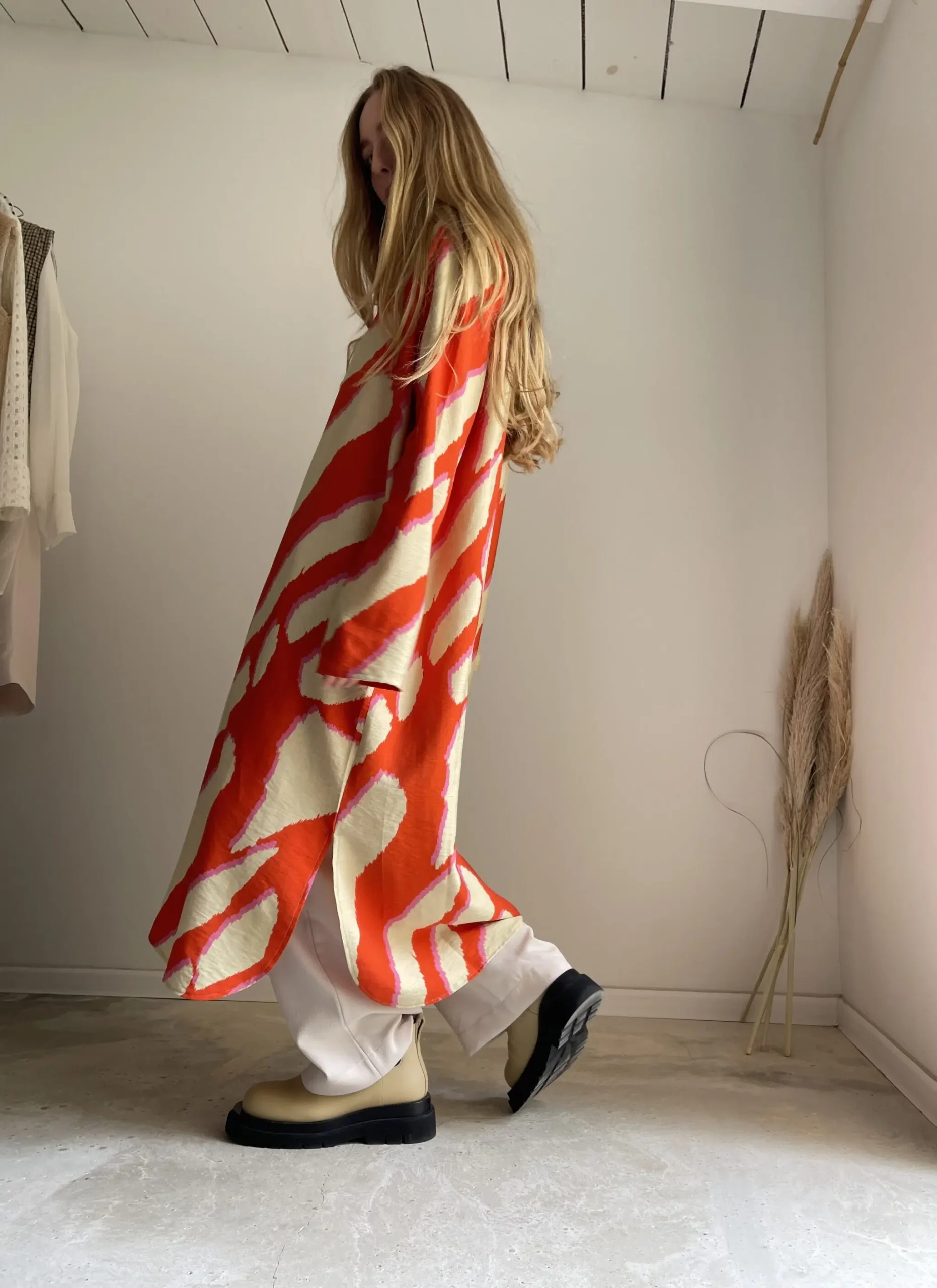 Robe « ROMY » dans un sublime tissu à motifs rouges & fuchsia sur fond sable. Une coupe minimaliste & élégante. Jolies fronces sur les épaules, boutons & poches. Portée en superposition sur le pantalon « JO » en crêpe écru. PIÈCE UNIQUE