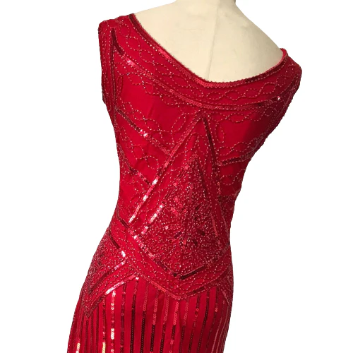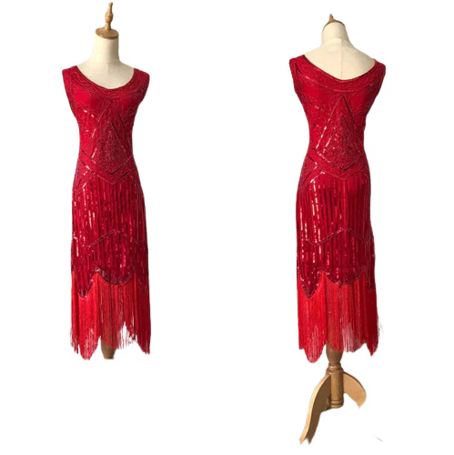 Cette robe typique année 20 éblouit les yeux lors des événements. En plus, c’est une courte tenue de longueur jusqu’aux cuisses. Ce qui est surtout faite pour les danses. Elle est de coupe droite, serré au niveau de la taille. Elle est conçue avec un col en bateau et une manche courte pour valoriser les épaules de la personne qui la porte. Elle est de couleur rouge très voyante qui attire l’attention de tout le monde dans une fête.