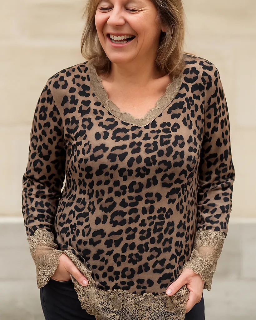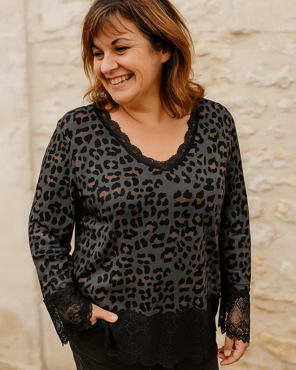 Même coupe iconique que le best-seller que vous adorez, mais cette fois… il sort les griffes (avec classe). Ce haut allie l’imprimé léopard affirmé à une finition dentelle ultra féminine. Un basique pas si basique qui met la touche rock dans votre douceur.