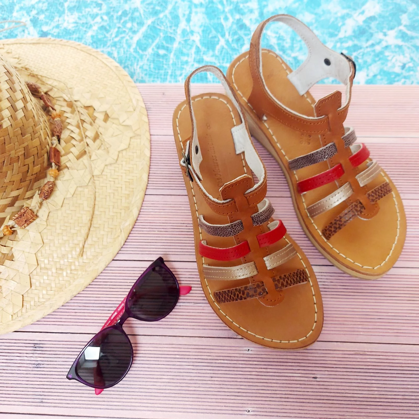 Le modèle « Carla » présente cinq brides sur le dessus du pied, chacune issue d’un cuir différent, ajoutant un charme unique à ces sandales. Ce modèle existe également en version plate et unie couleur camel.