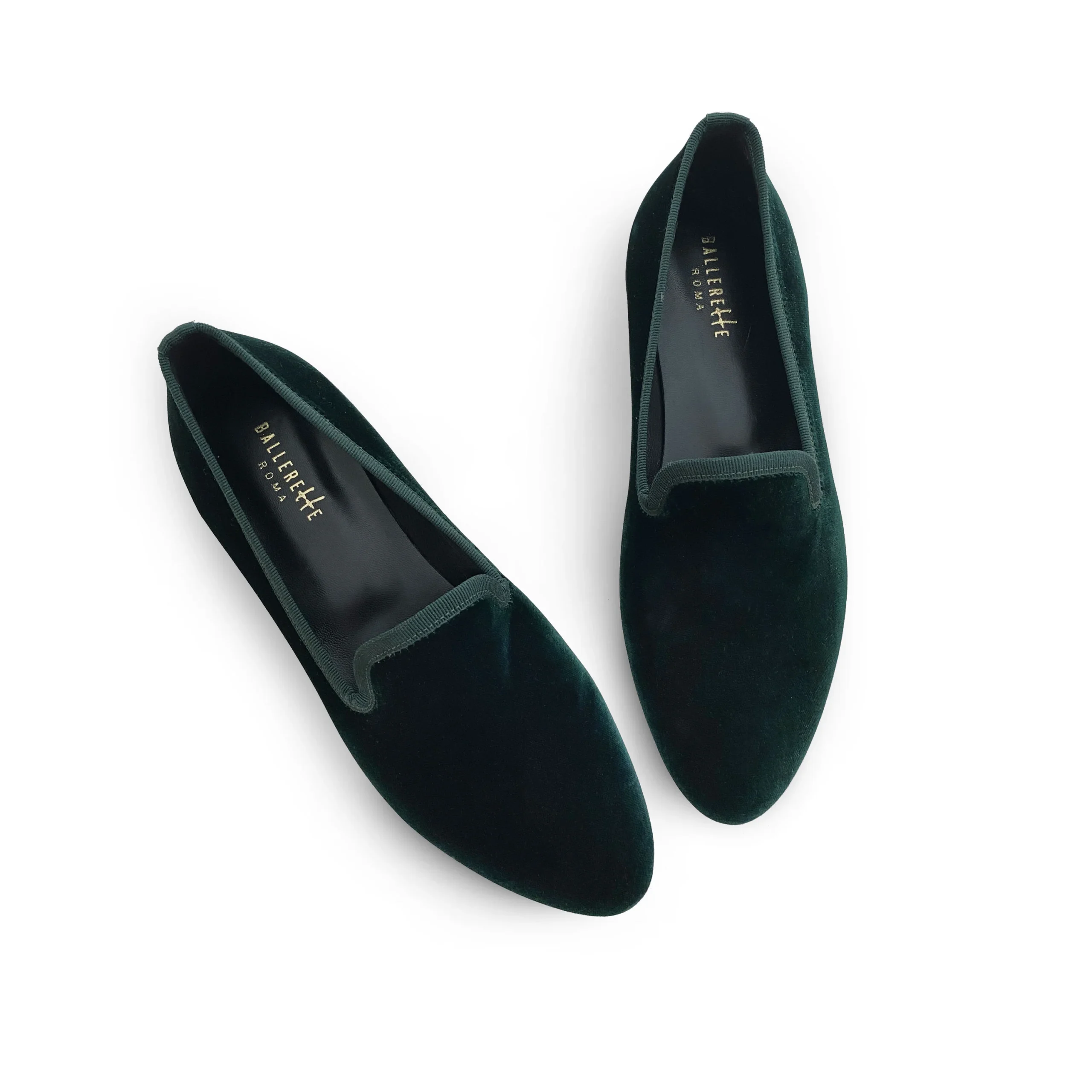 Le Aureliane sono le slippers da indossare per creare look sempre diversi. Estrose, in questa versione in velluto verde nei toni del bottiglia, sono estremamente femminili grazie alla linea affusolata che slancia la figura. La suola è in carrarmatino nero, in modo da poter essere indossate con praticità e comodità nei mesi invernali.