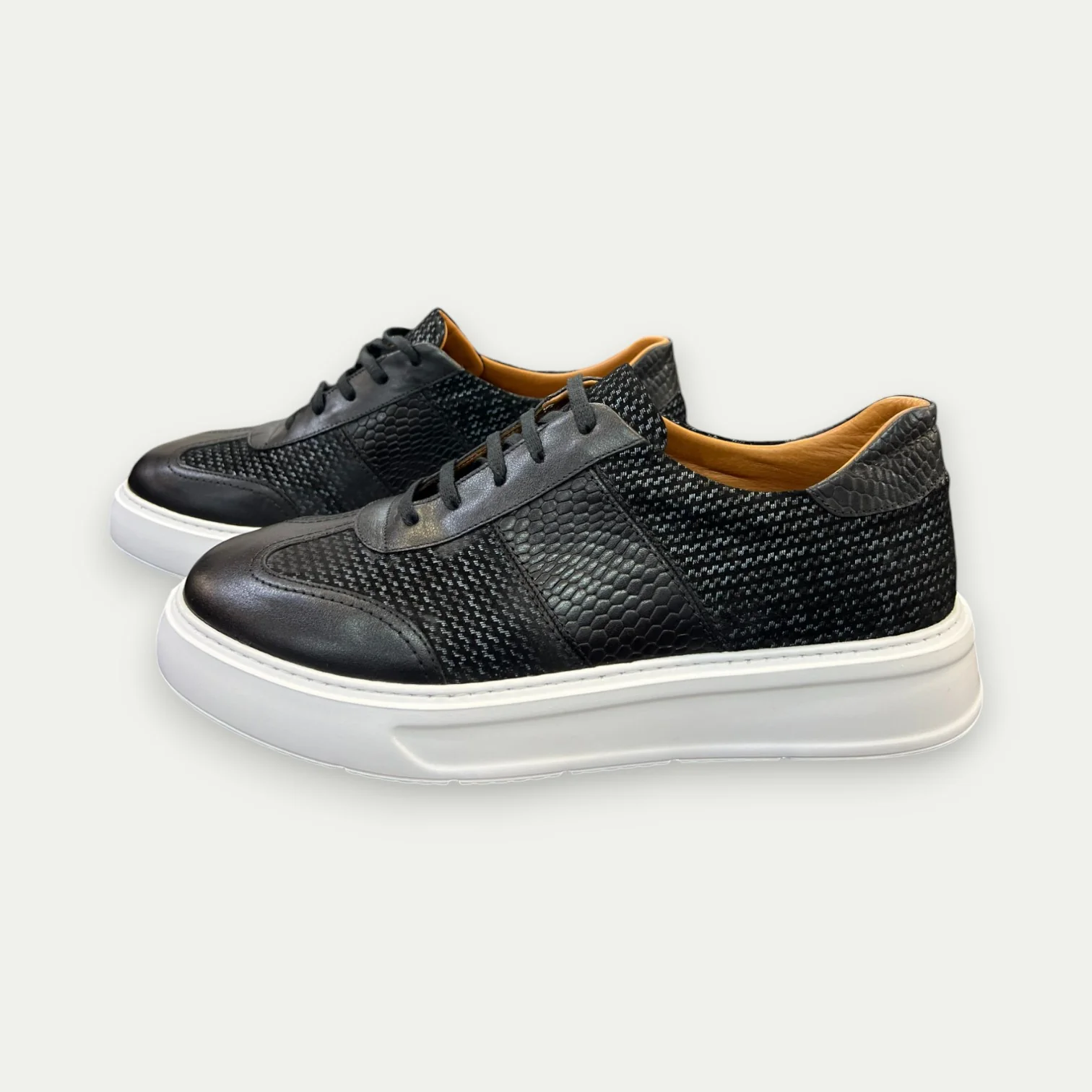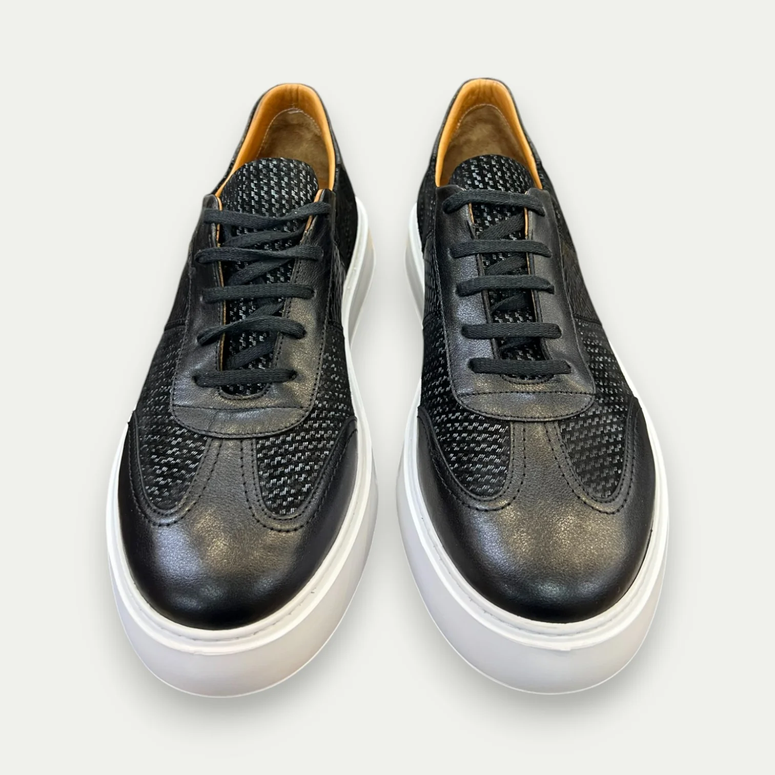 Ces sneakers en cuir et daim imprimé sont les chaussures parfaites pour toutes les occasions. Avec leur design ultra léger et leurs semelles en caoutchouc, elles offrent un confort ultime tout en gardant une allure sport chic. Leur couleur noire intemporelle et leurs lacets en font un choix élégant et pratique.