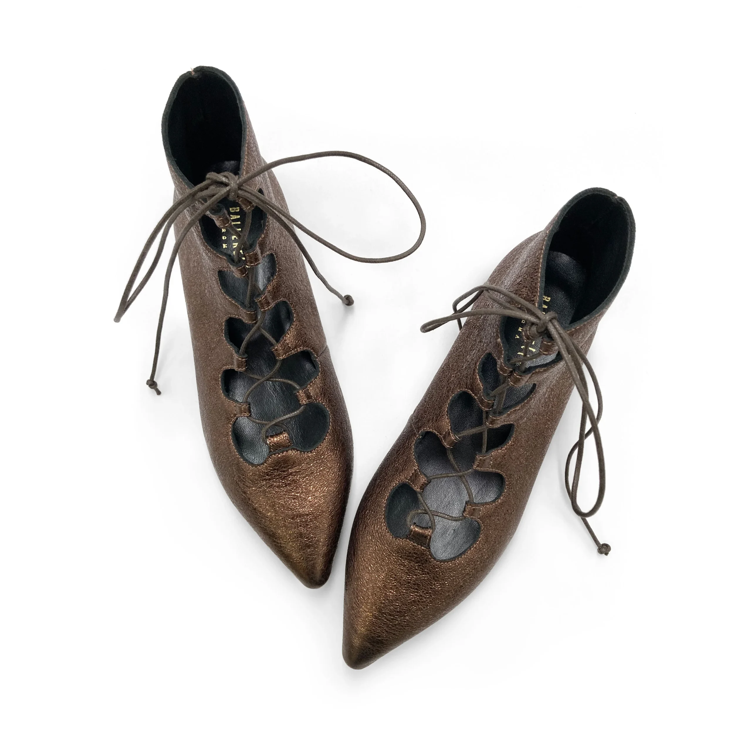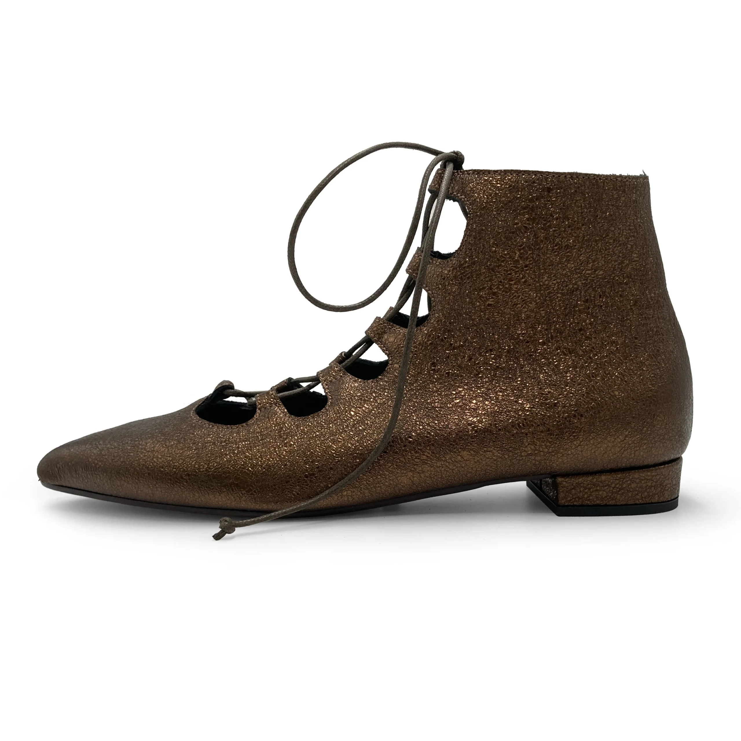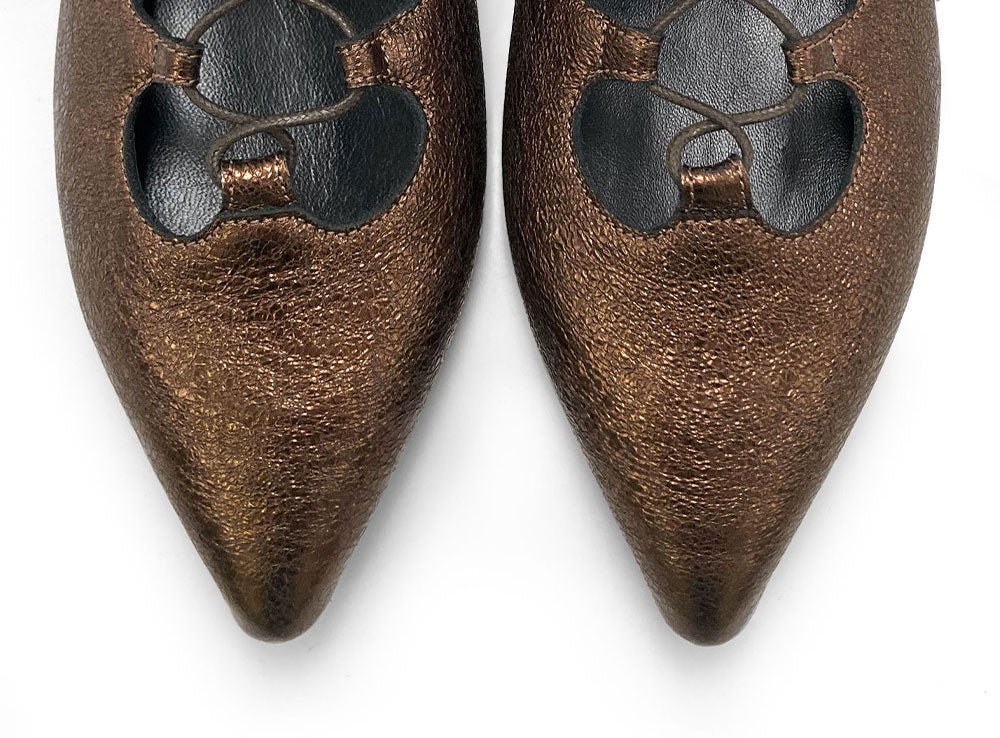 Stivaletti alla caviglia, eleganti e di tendenza, pensati per offrire morbidezza e comodità senza rinunciare allo stile. Gli stivaletti ankle boots con lacci intrecciati modello Sistina sono realizzati in pelle laminata bronzo con trama sottile e punta affusolata, un modello versatile e raffinato, ideale per chi cerca una calzatura femminile dal carattere deciso ma luminoso. I lacci sottili intrecciati sul davanti aggiungono un dettaglio delicato e ricercato, mentre il tacco basso di 2 cm e la suola in gomma assicurano stabilità e comfort durante tutta la giornata. La fodera in pelle nera garantisce una calzata avvolgente e confortevole, perfetta anche nelle giornate più dinamiche. Il finish laminato e il colore caldo e luminoso rendono questi ankle boots adatti sia a look monocromatici che a combinazioni più vivaci. Abbinali a un abito in maglia color avorio e cappotto beige per uno stile sofisticato da giorno, oppure a pantaloni in lana grigio perla e un dolcevita color cioccolato per un effetto elegante e contemporaneo. Di sera, gli stivaletti Sistina in pelle laminata bronzo si abbinano con una gonna midi plissé color petrolio e una camicia nera in seta, oppure con un mini dress nero e collant coprenti per un look da sera chic e deciso. I Sistina sono lo stivaletto allacciato perfetto per aggiungere luce, comfort e personalità a ogni outfit.