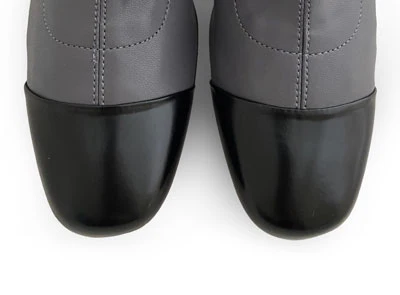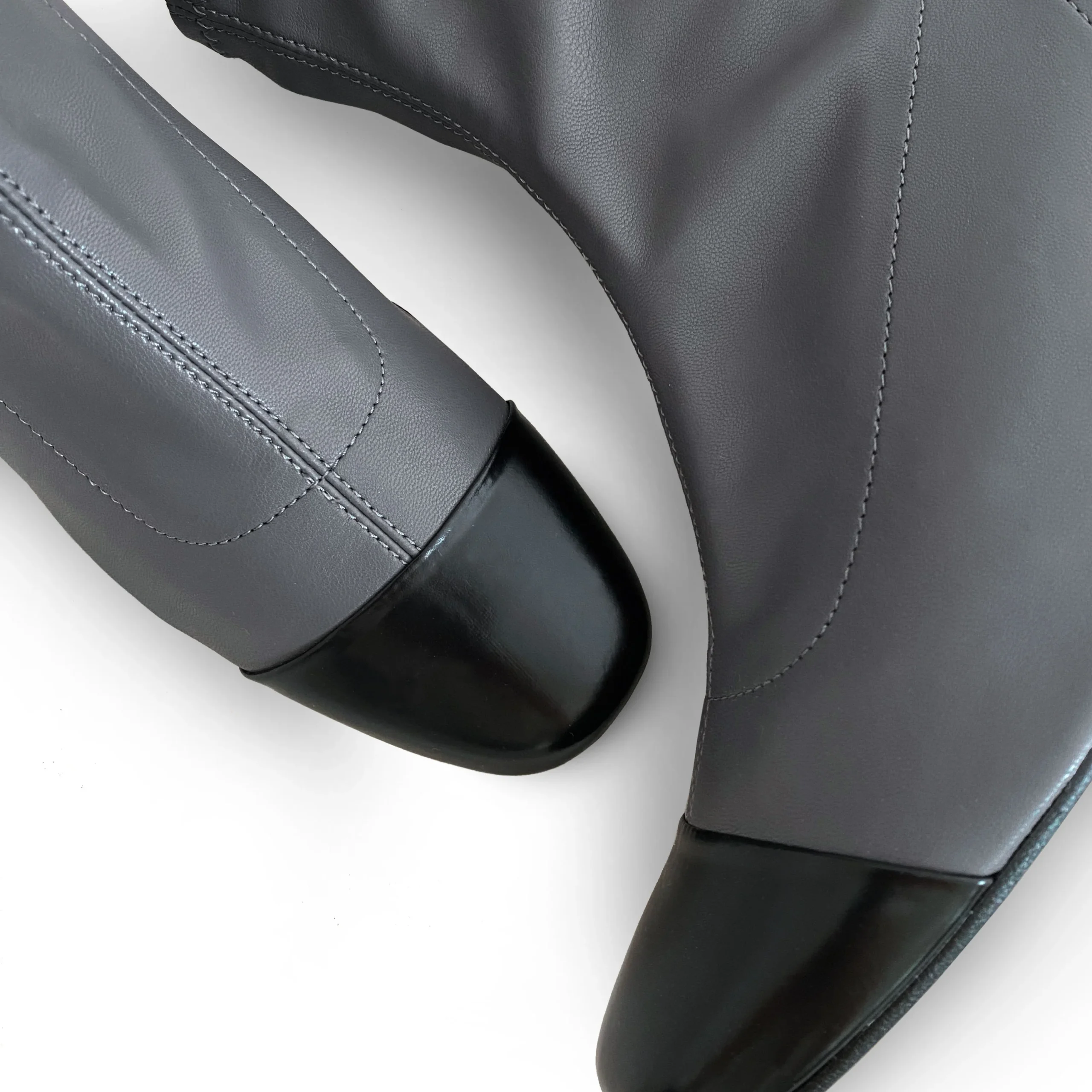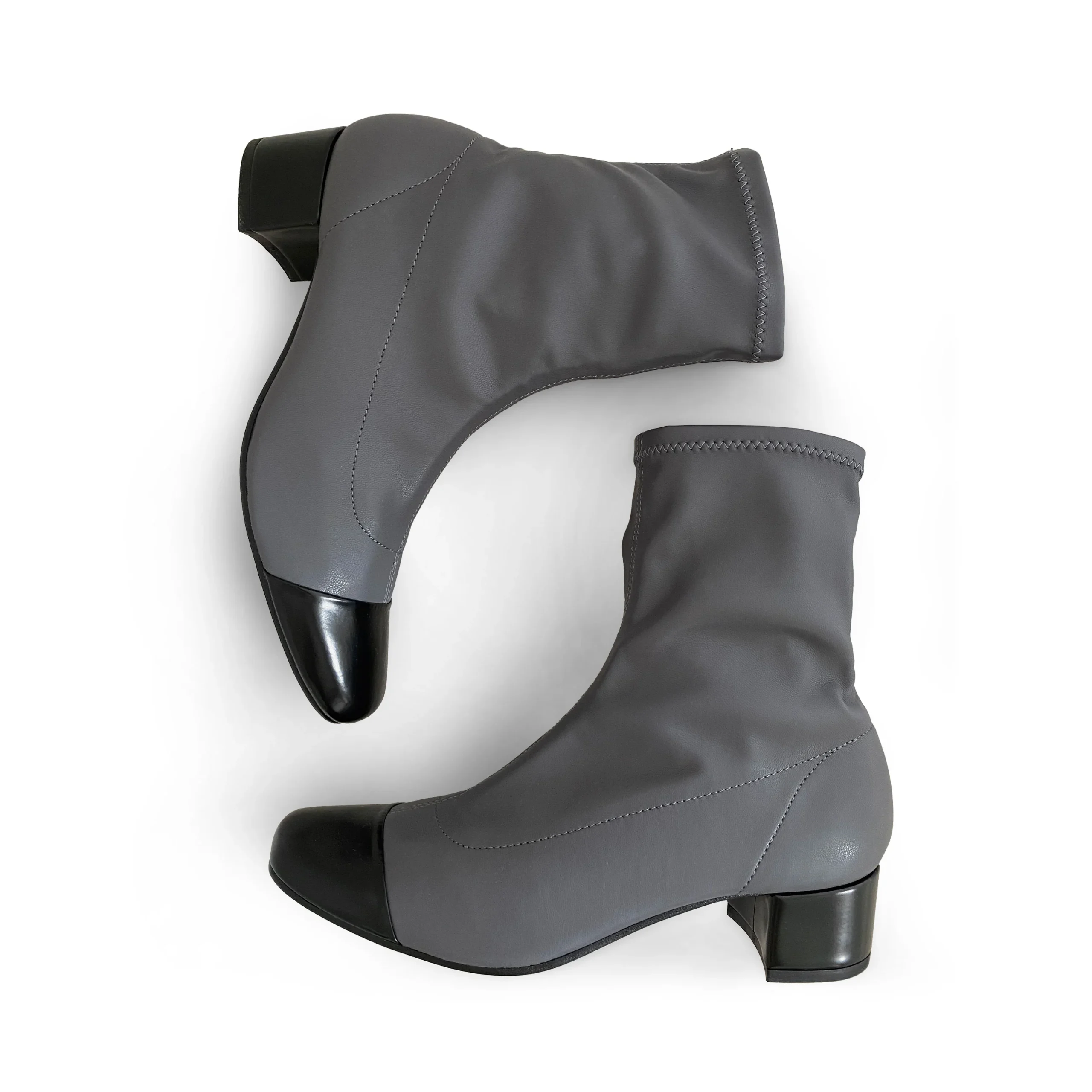 Gli stivaletti alla caviglia in calza elasticizzata di similpelle grigia hanno un design minimal e contemporaneo e sono particolarmente comodi e morbidi da indossare. Il tacco largo è alto 4 cm e la punta quadrata è ricoperta in pelle abrasivata nera.