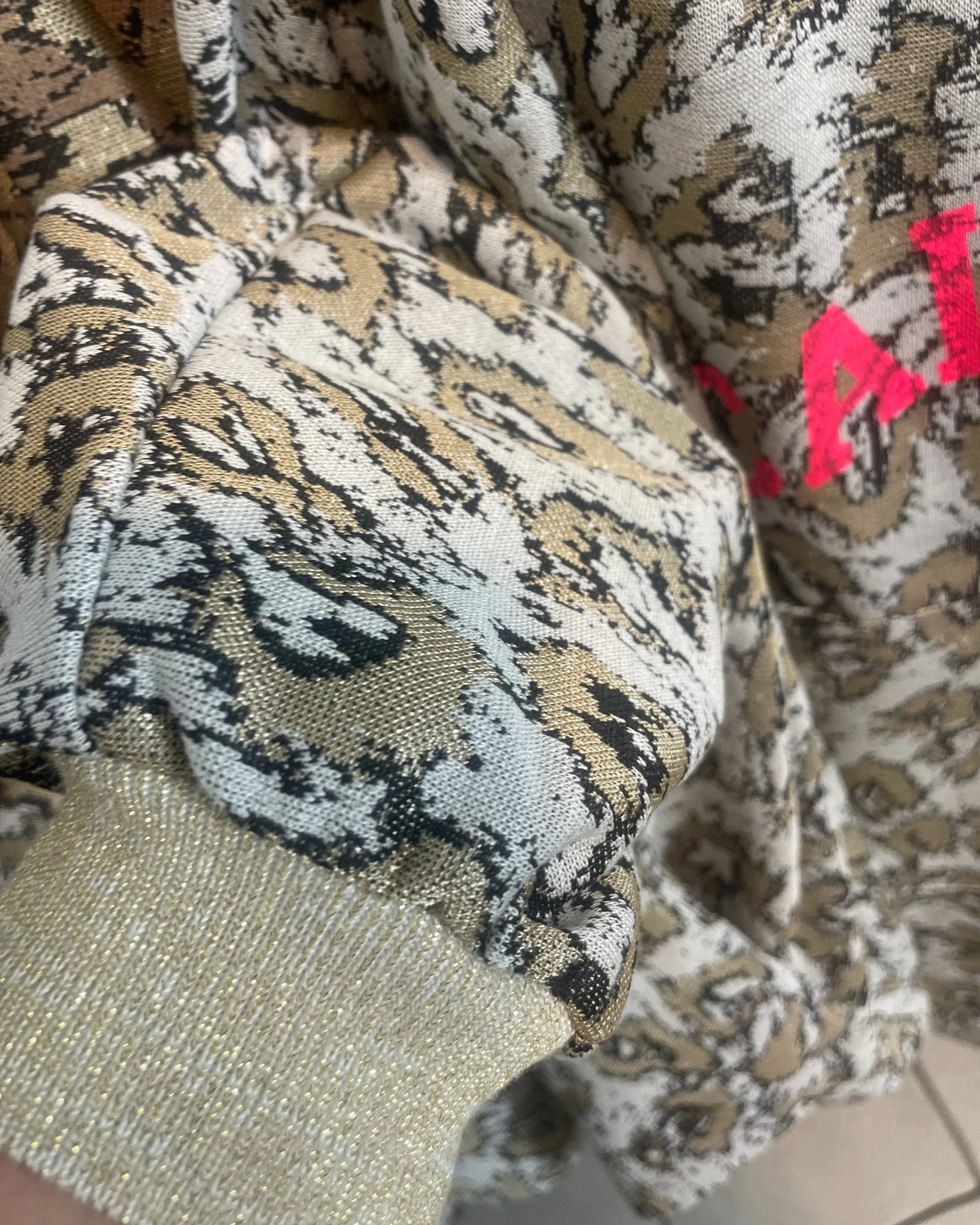 Sweat à capuche oversize avec inscription « CALIFORNIA » rose fluo, manches chauve-souris et paillettes dorées aux poignets. Clairement pas un sweat basique.