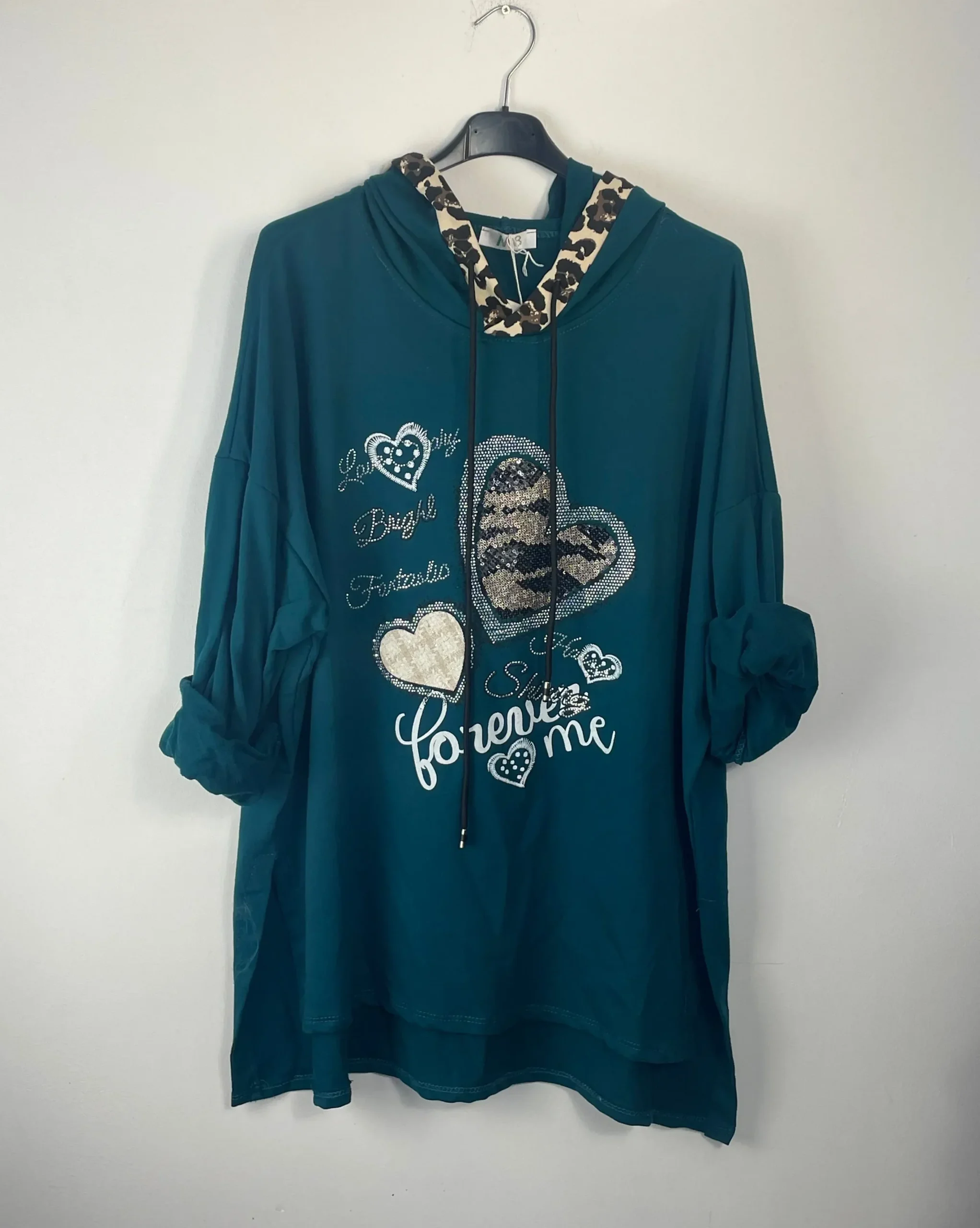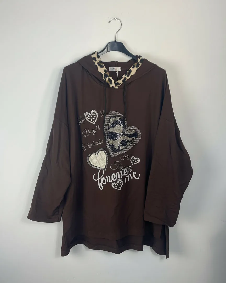 Un sweat qui mixe douceur, strass, cœur léopard et une capuche doublée motif wild… bref, le combo parfait pour les femmes qui veulent un look cool mais avec une petite étincelle qui dit « je sais qui je suis ».