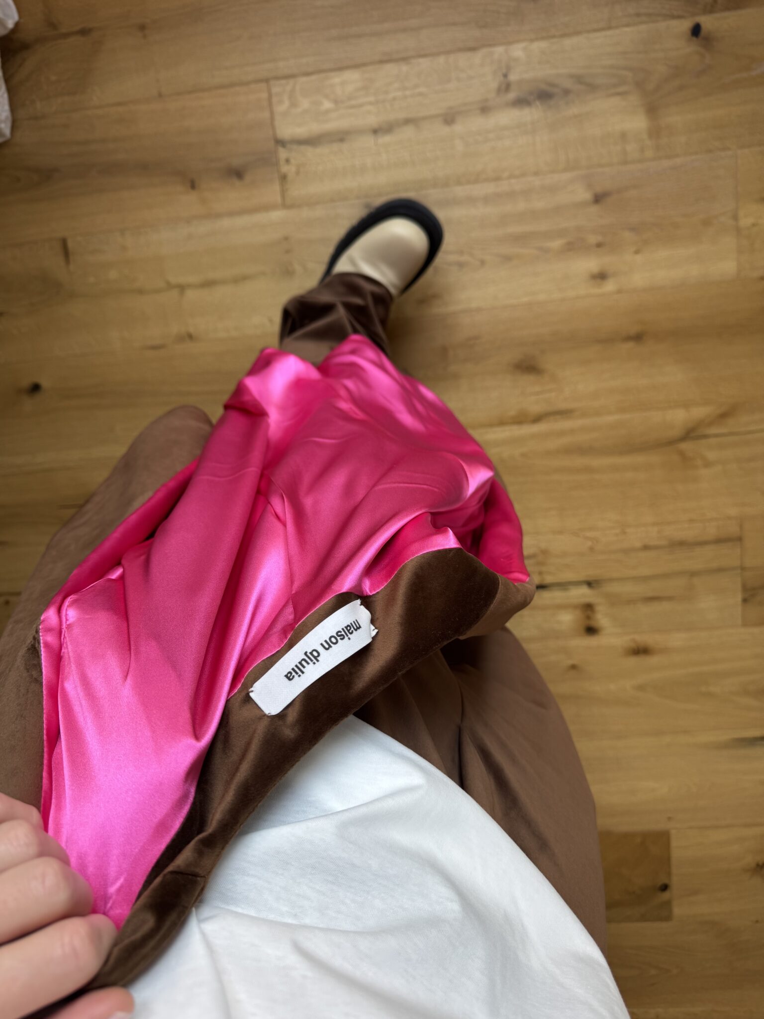Veste Blazer « LOUISA » en velours lisse chocolat, entièrement doublée en crêpe satiné coloris fuchsia. Fermeture à pression. Veste chic et élégante. PIÈCE UNIQUE