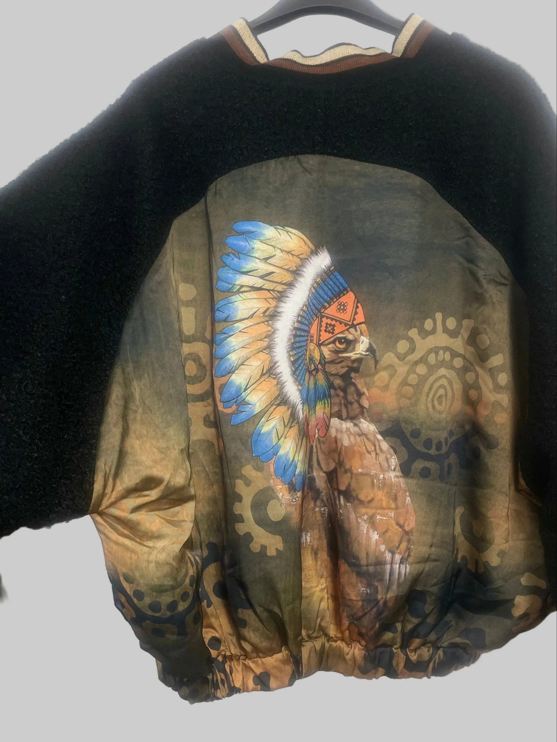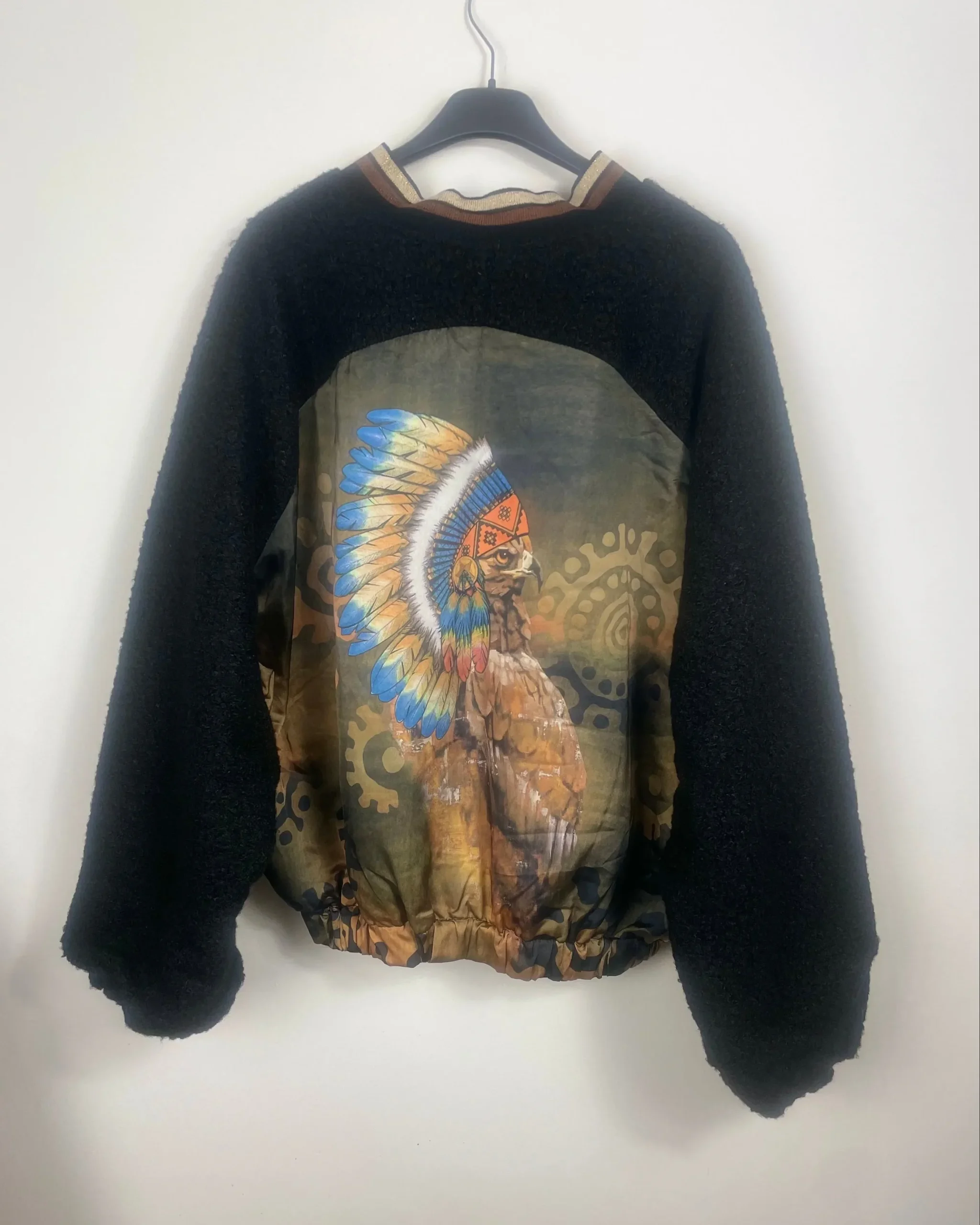 Ce bomber revisité mêle l’esprit street à une touche d’âme sauvage. Le dos arbore un majestueux aigle tribal orné de plumes multicolores, symbole de liberté et de puissance. Le tout contrasté par des manches en matière effet laine bouclée qui apportent douceur et volume. Un vrai coup de cœur pour les femmes au style affirmé ! 🪶🖤