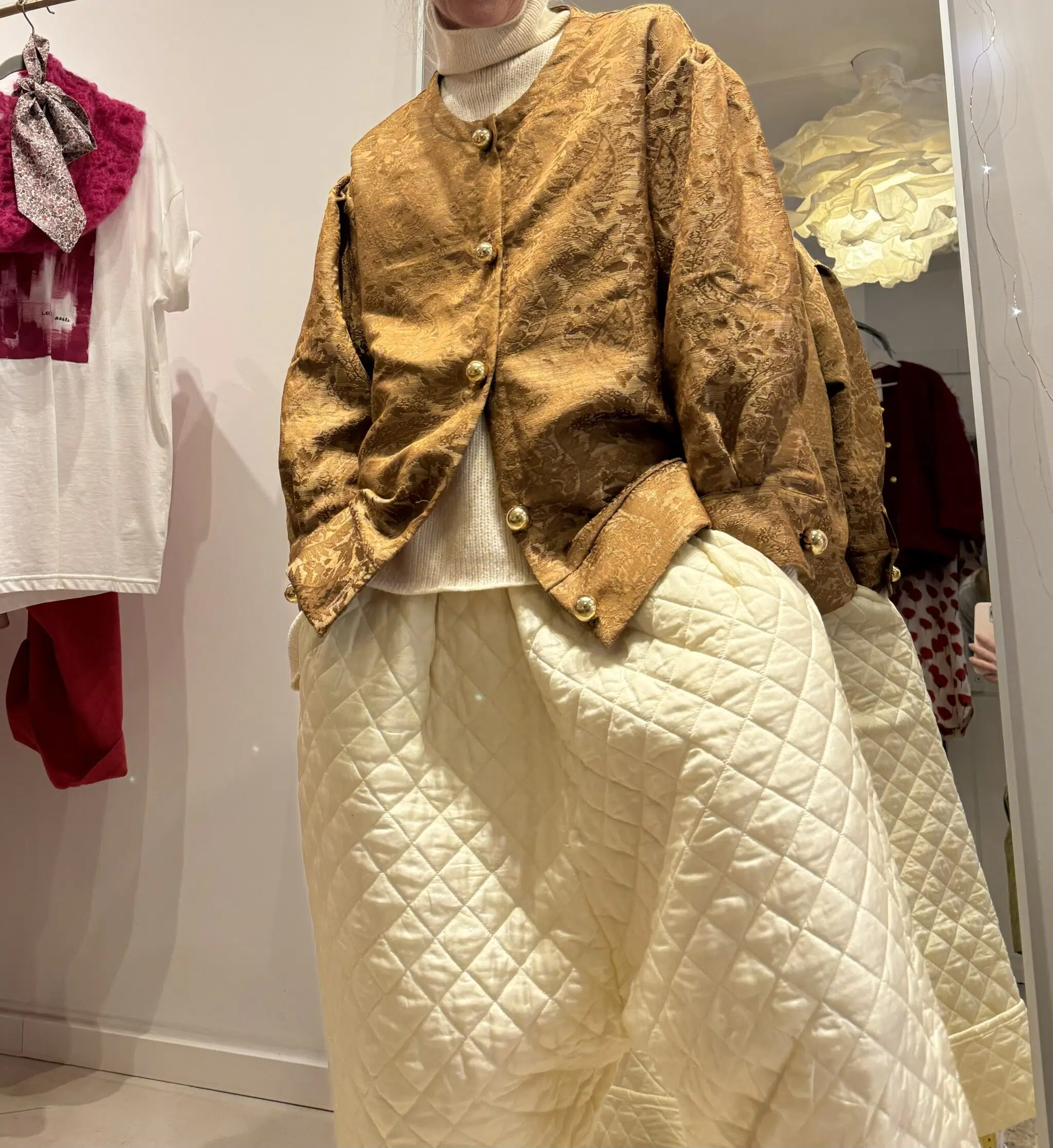 Veste Bomber « JANO » dans un sublime brocart de soie doré brodé. Entièrement doublée en crêpe satiné coloris fuchsia. Fronces aux épaules et aux poignets. Pinces au dos et en bas de veste. Boutons dorés. Une coupe loose et oversize, pour une veste stylée. PIÈCE UNIQUE