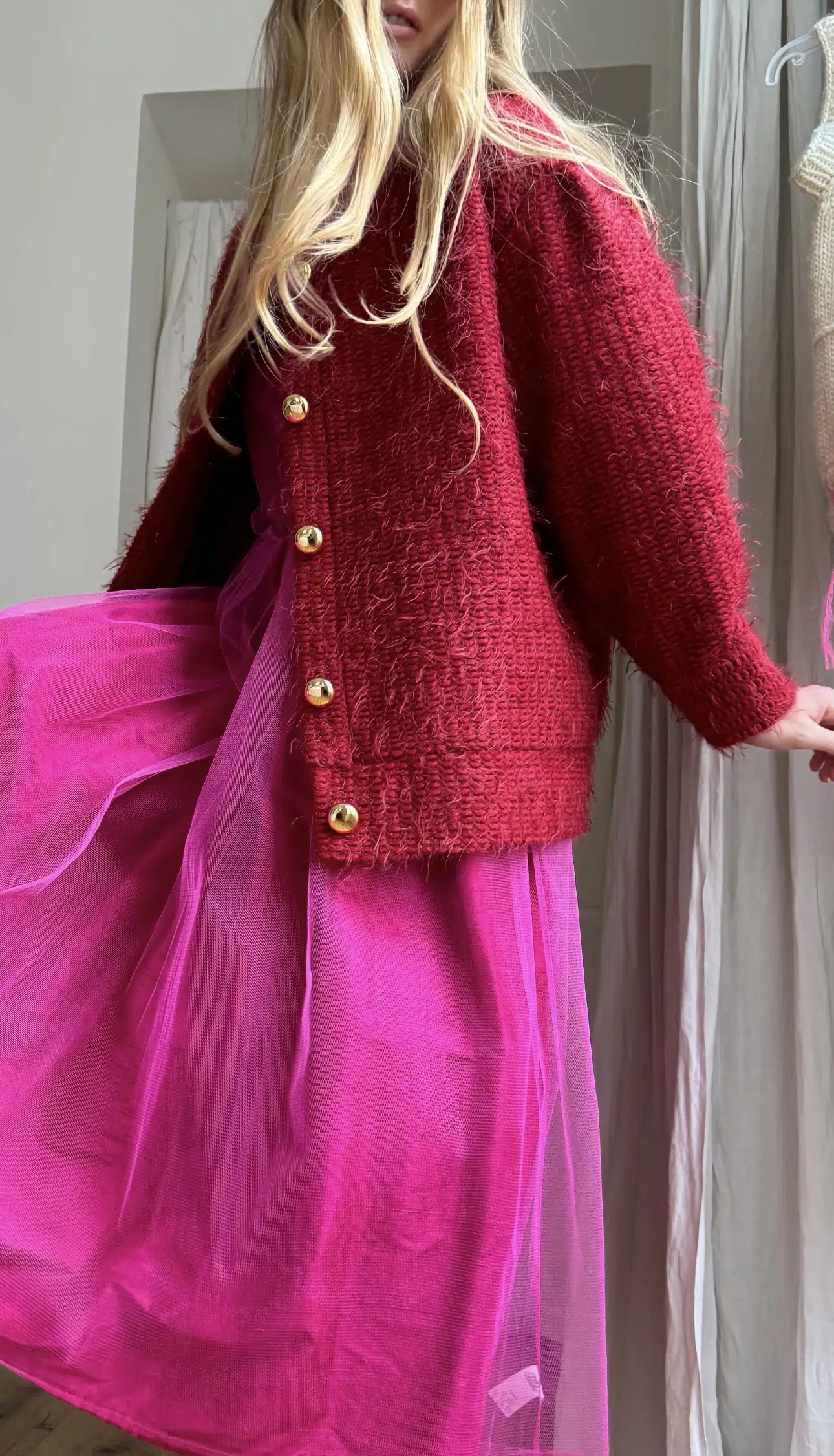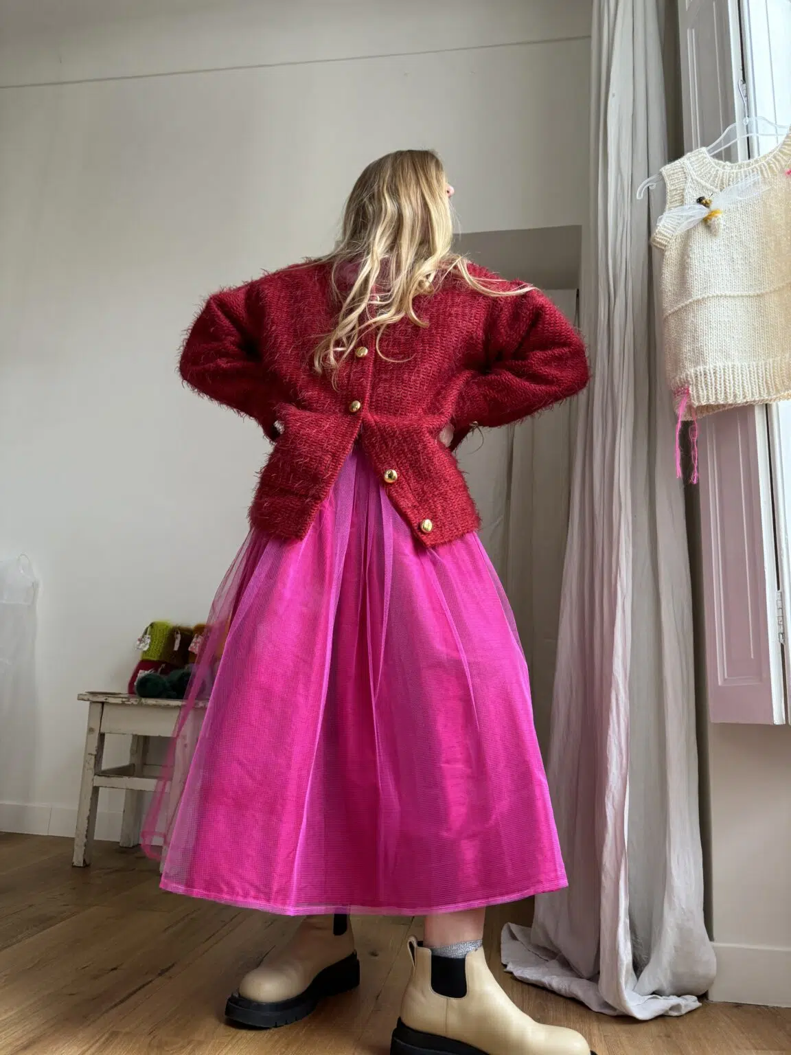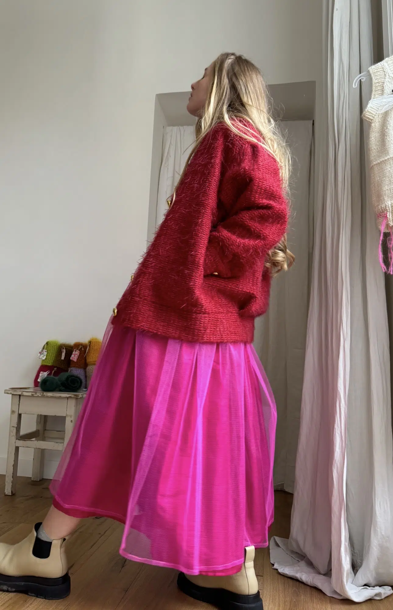 Veste Bomber « JANO » dans un sublime lainage bouclette coloris framboise. Entièrement doublée en crêpe de viscose satinée coloris caramel. Fronces aux épaules et aux poignets. Pinces au dos en bas de veste. Boutons dorés. Une coupe loose et oversize, pour une veste stylée et unique. PIÈCE UNIQUE