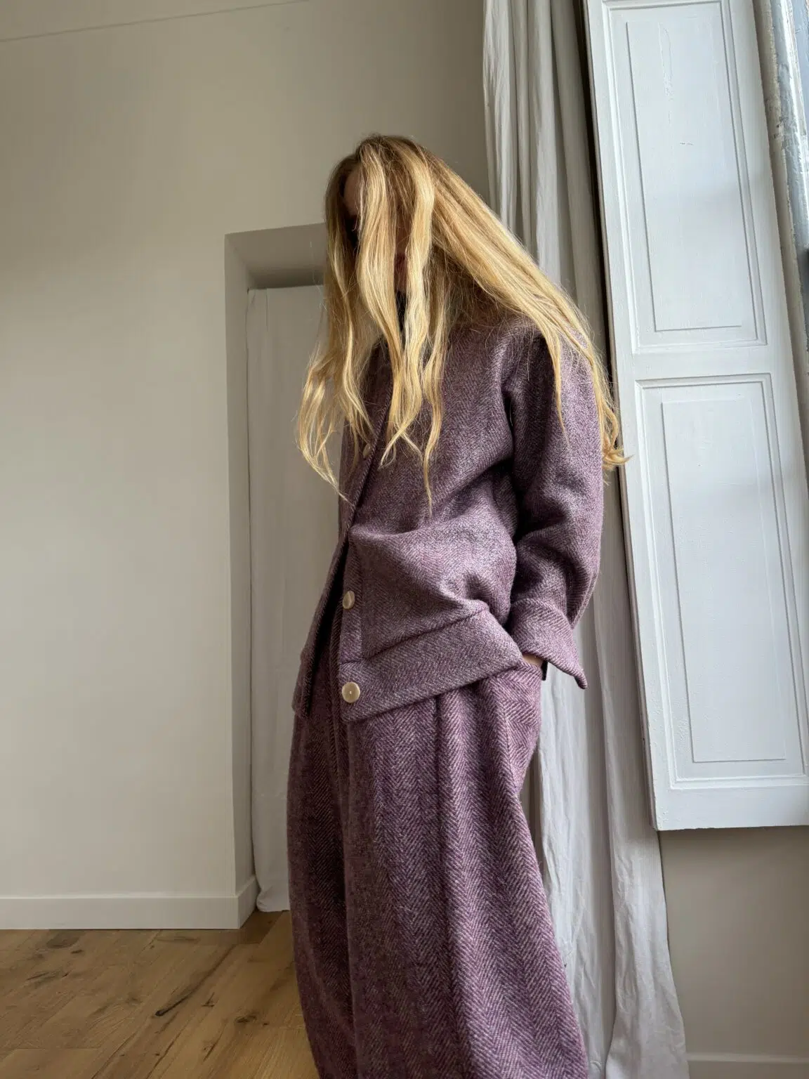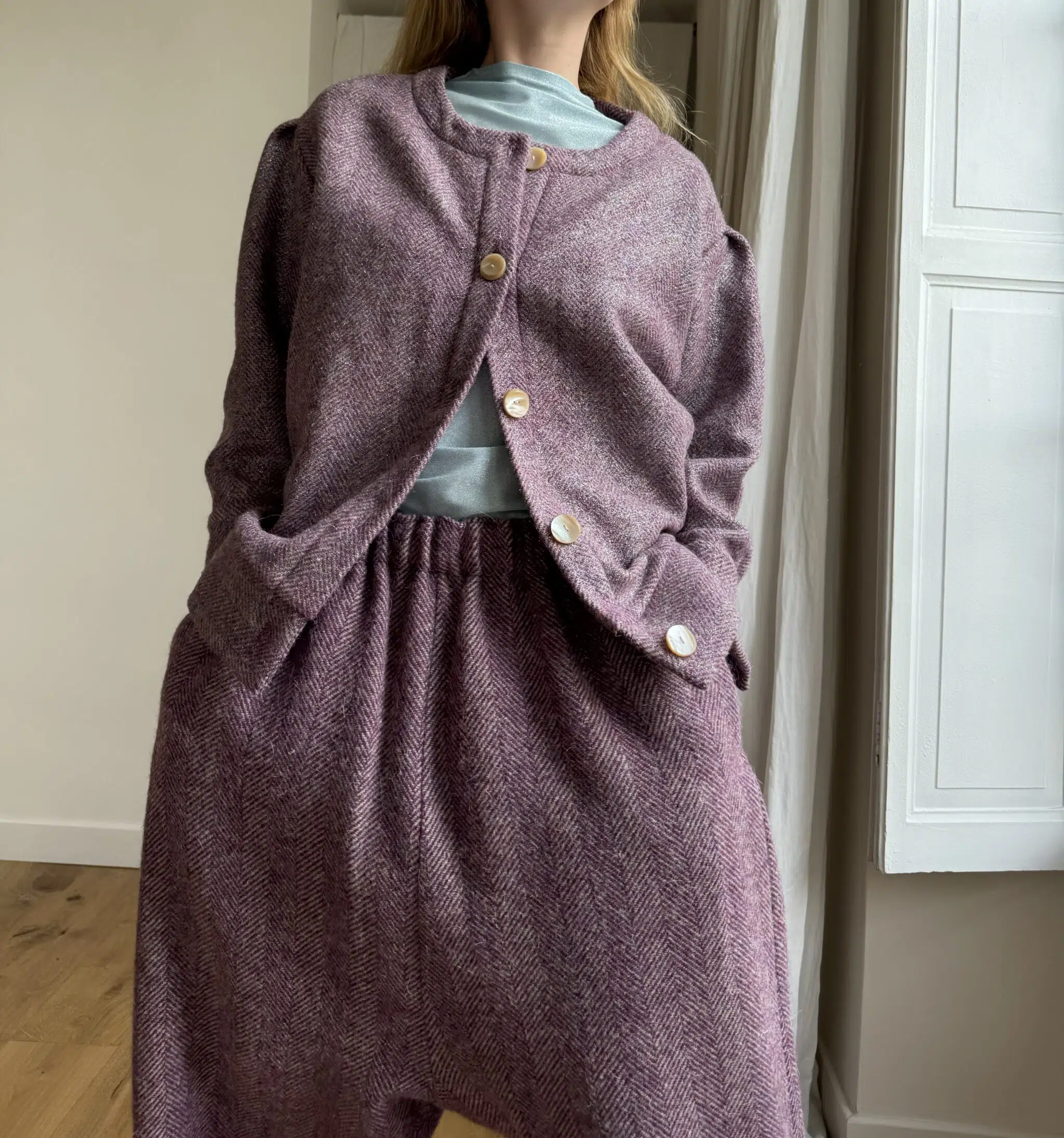 Veste Bomber « JANO » dans un sublime lainage parme argenté à chevrons. Entièrement doublée en soie et coton écru. Fronces aux épaules et aux poignets. Pinces au dos en bas de veste. Boutons en nacre. Une coupe loose et oversize, pour une veste stylée et unique. 1 seul et UNIQUE exemplaire.