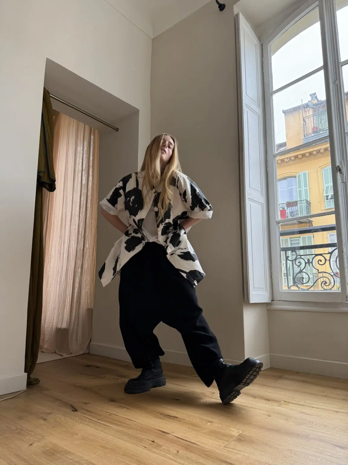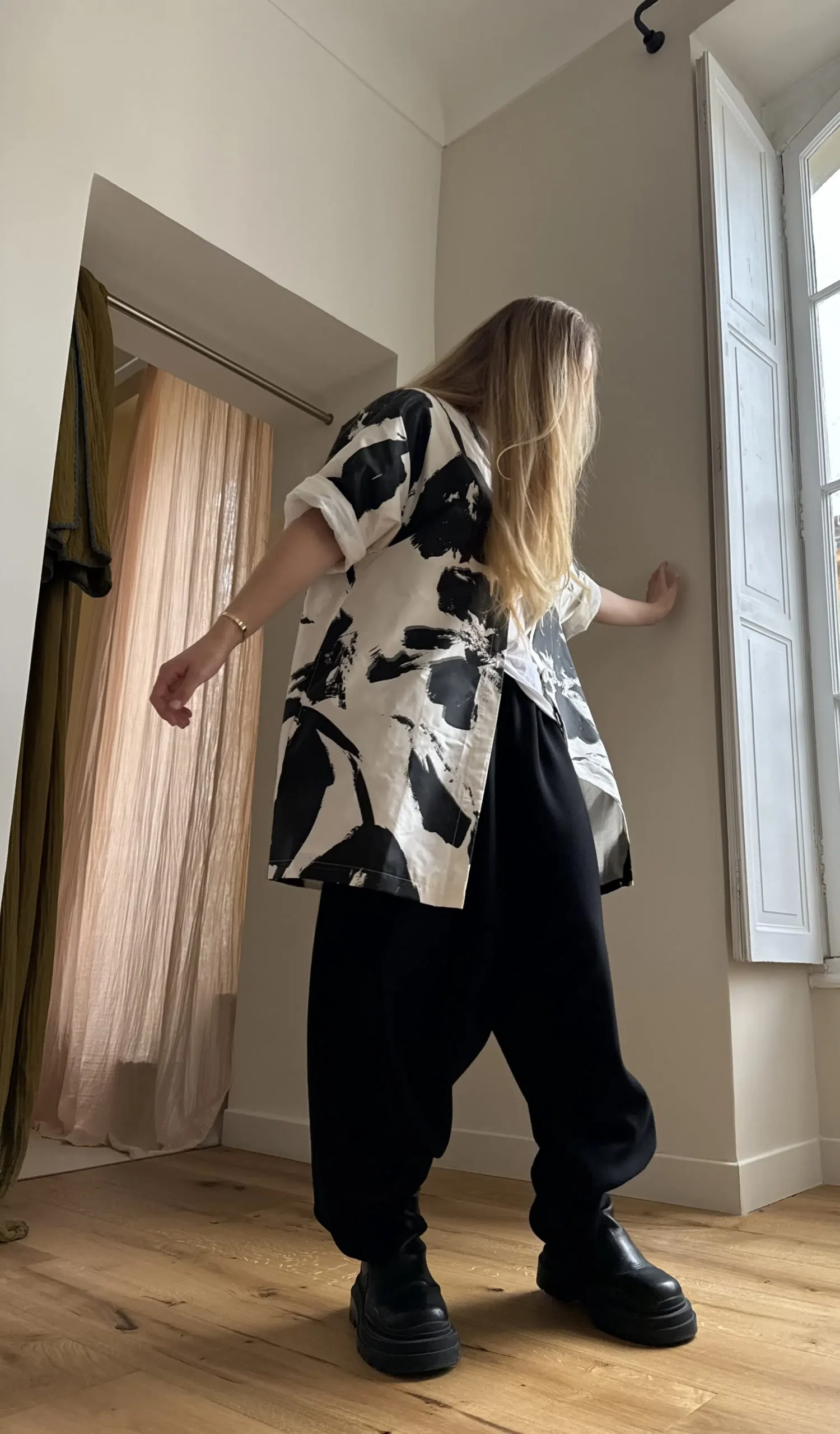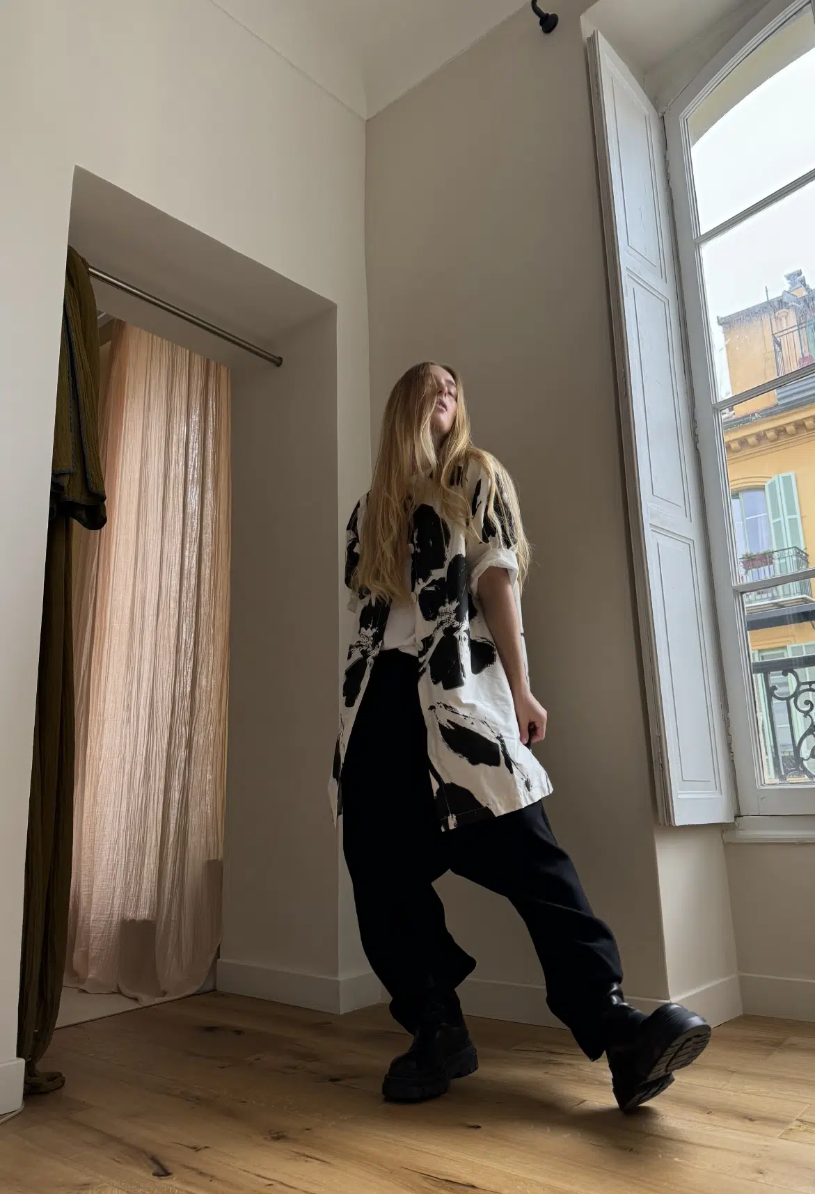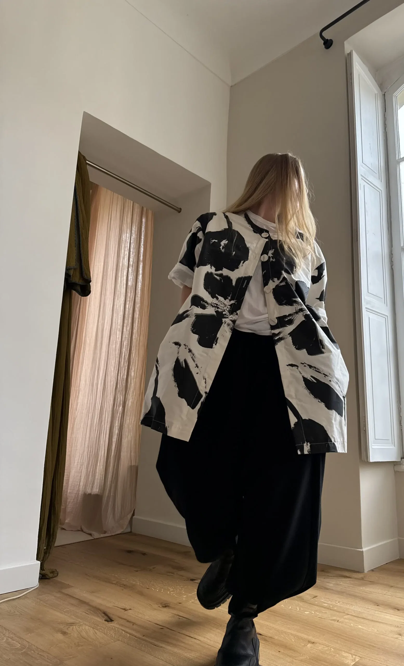 Veste « CLAUDE » en soie à fleurs. Une coupe minimaliste, oversize, à l’inspiration japonaise. Poches latérales. Veste boutonnée et entièrement doublée en soie et coton écru. Une création unique, poétique et élégante. PIÈCE UNIQUE