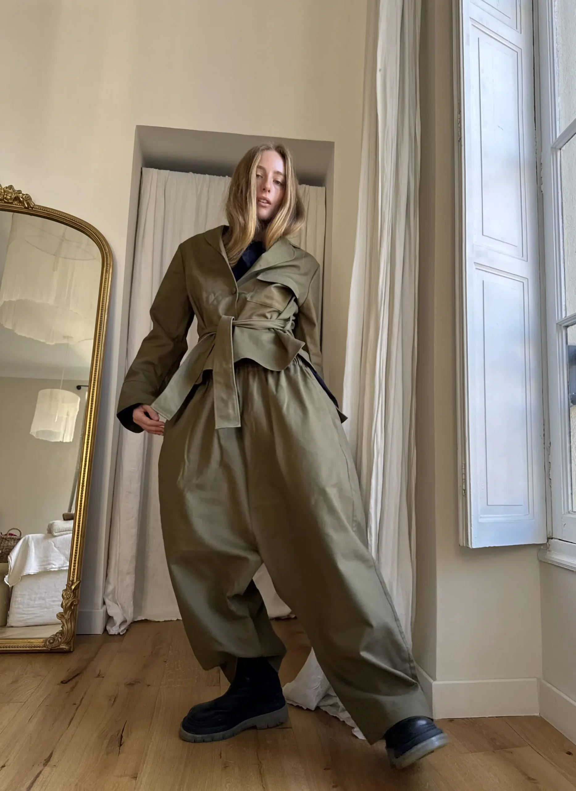 Veste « JOSIE » courte, en gabardine de coton kaki, ceinture, poche plaquée à rabat, bas de veste légèrement arrondie. Veste chic et élégante. PIÈCE UNIQUE
