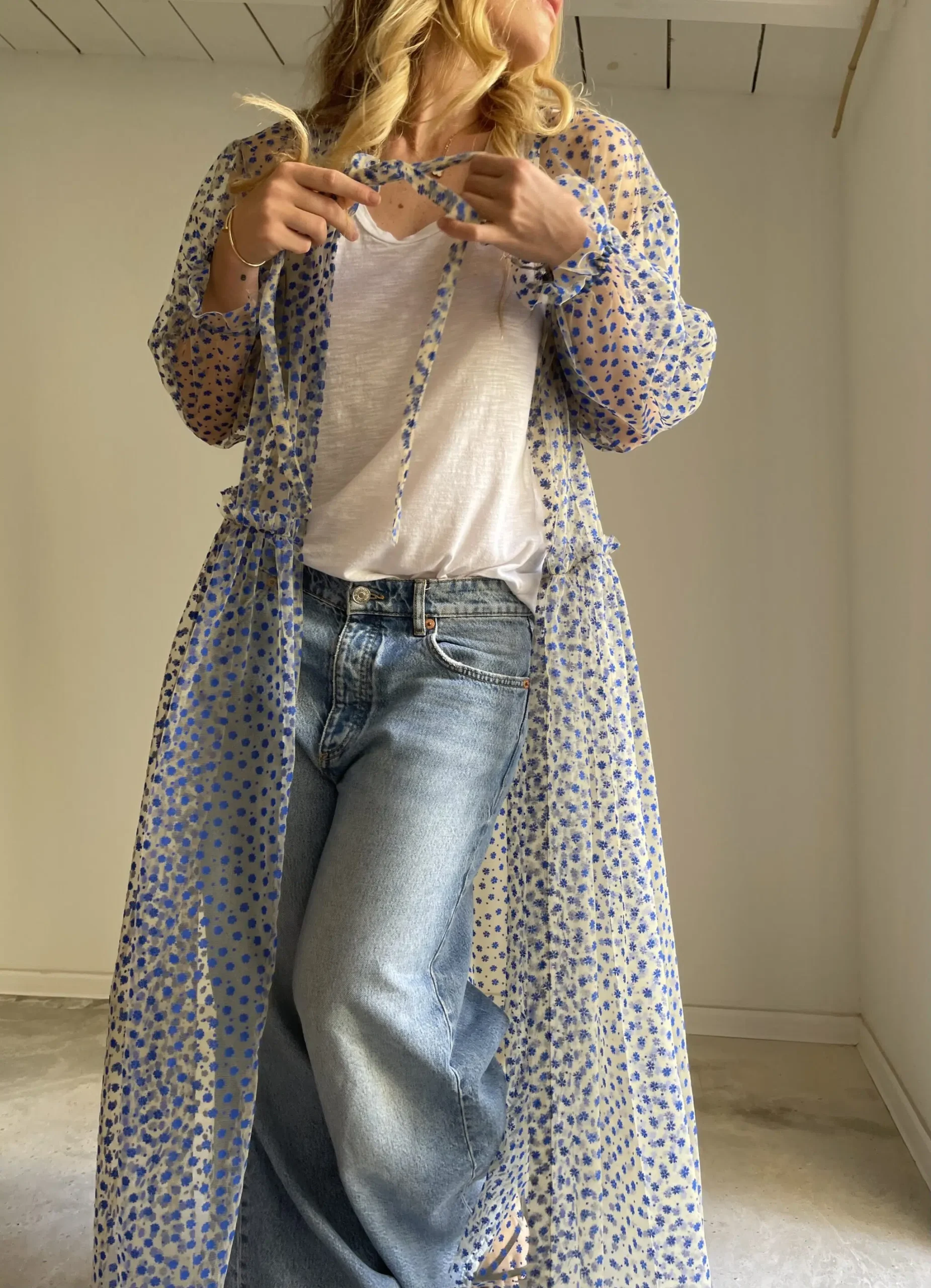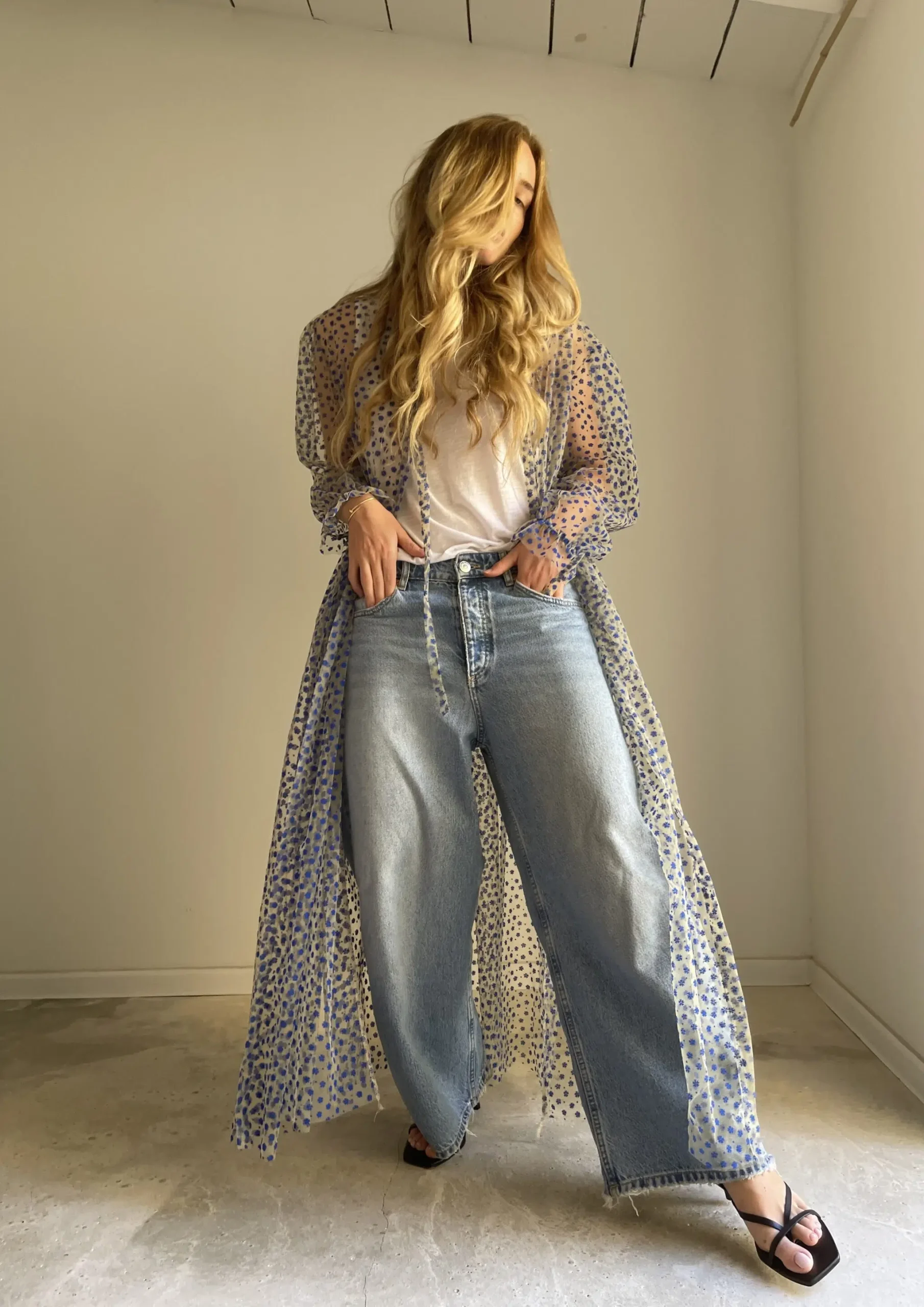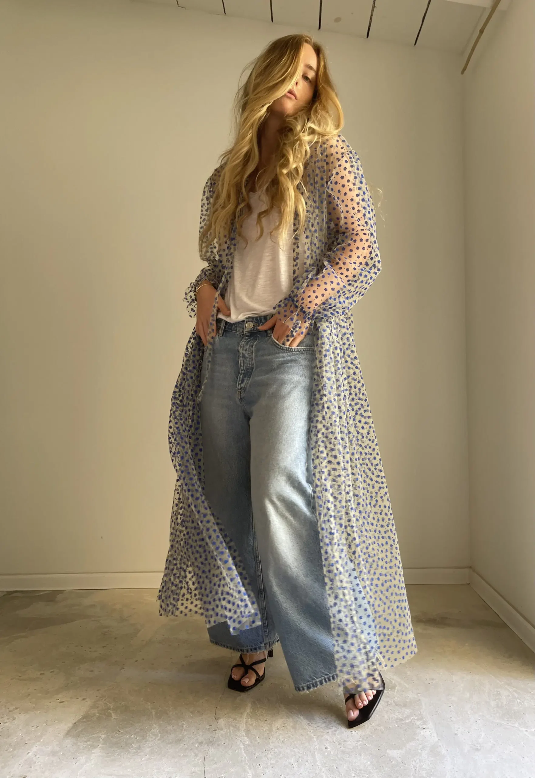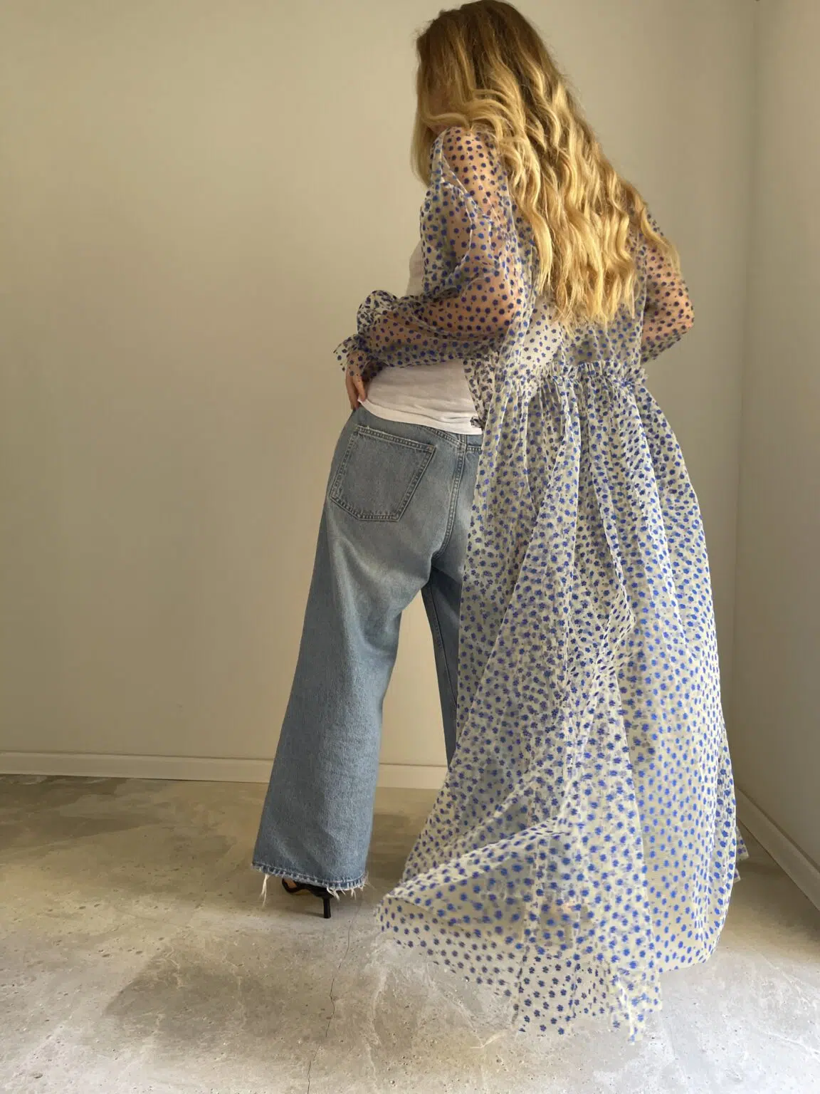 Veste longue en tulle plumetis. Petits volants à la taille et aux poignets, lien d’atache au col. Une création unique et originale. La pièce fashion qui vous rendra unique et stylé ! PIÈCE UNIQUE !