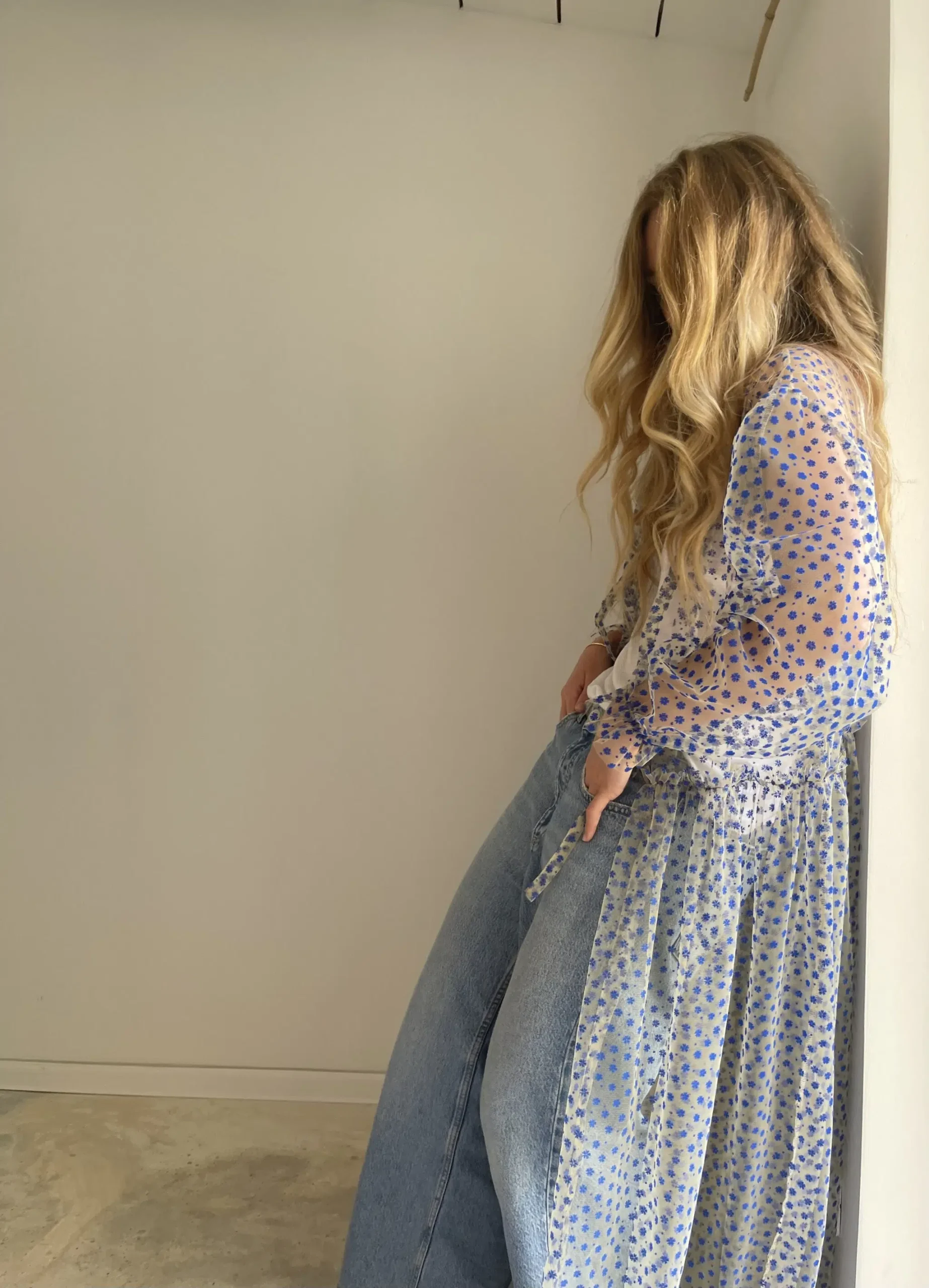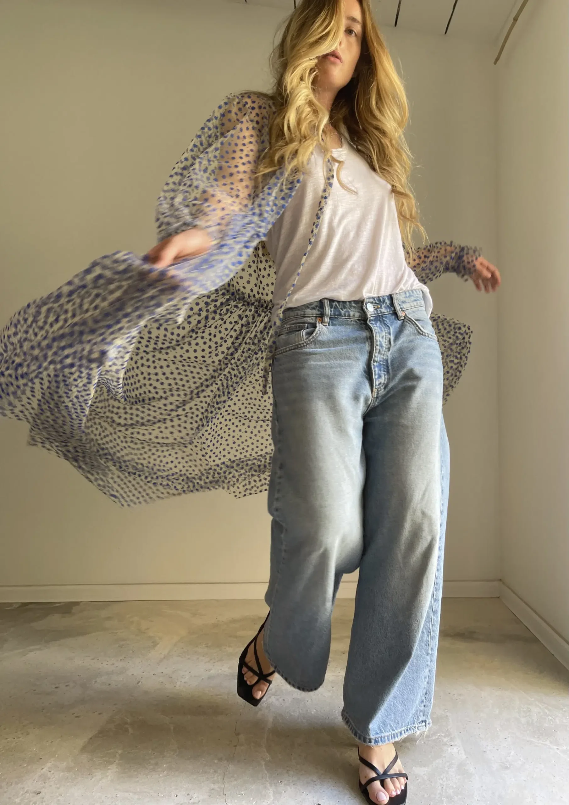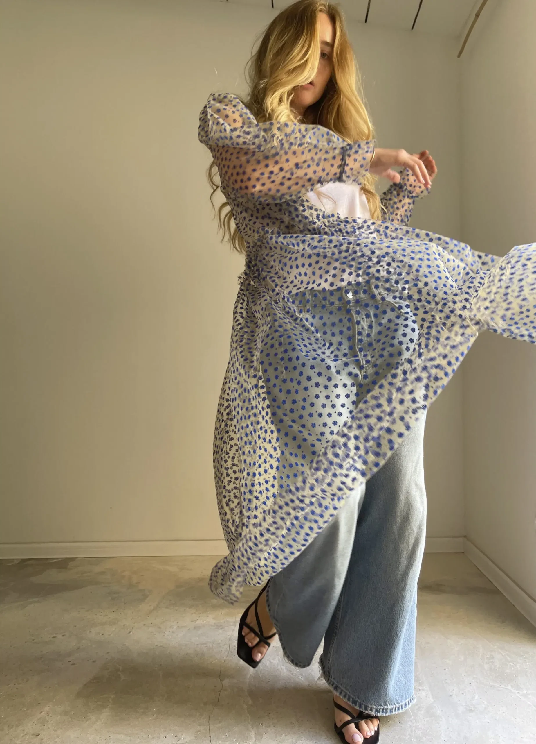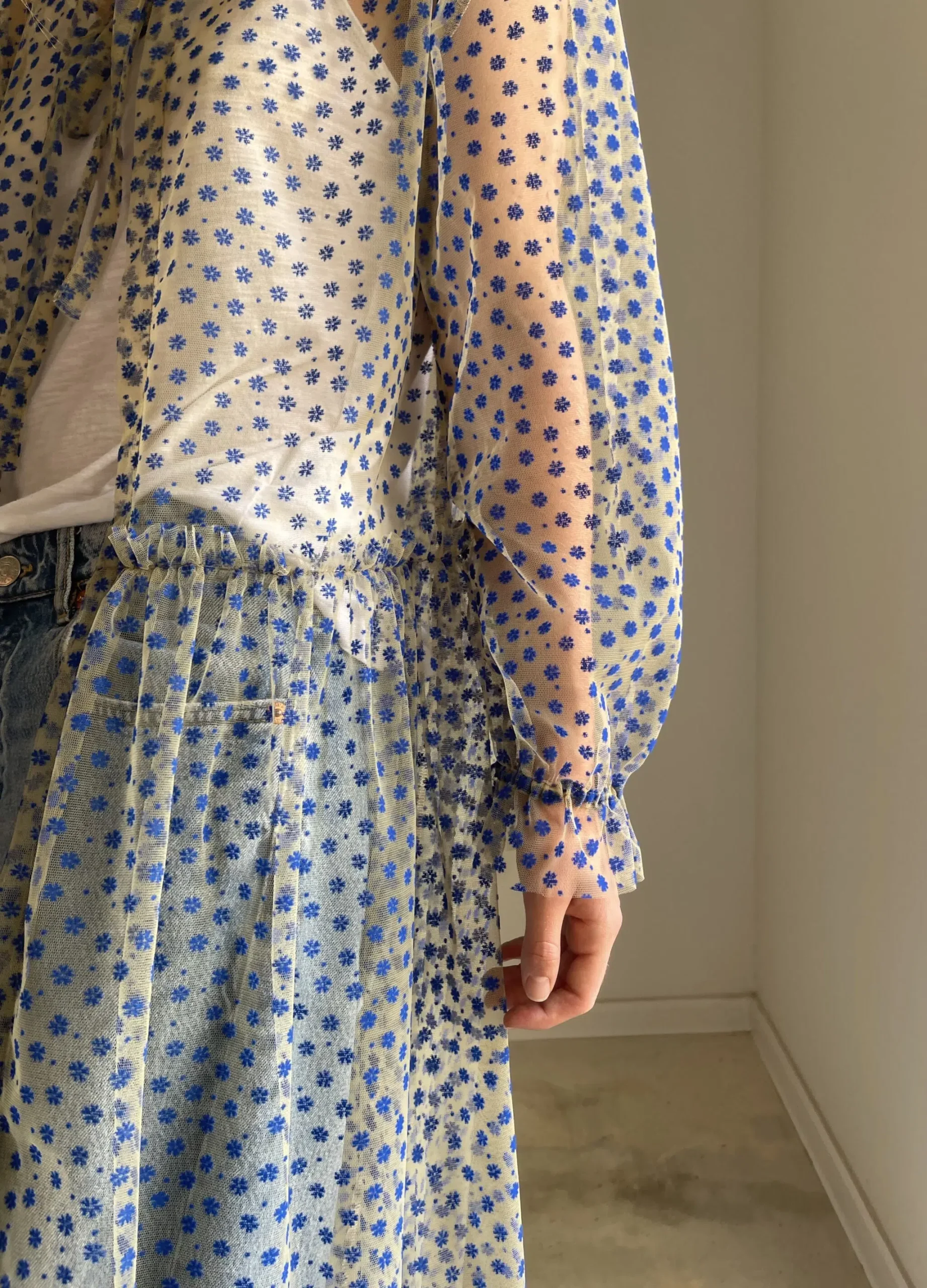 Veste longue en tulle plumetis. Petits volants à la taille et aux poignets, lien d’atache au col. Une création unique et originale. La pièce fashion qui vous rendra unique et stylé ! PIÈCE UNIQUE !